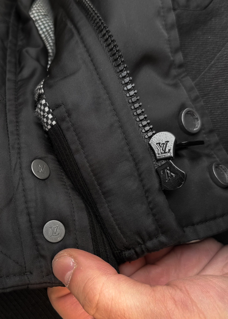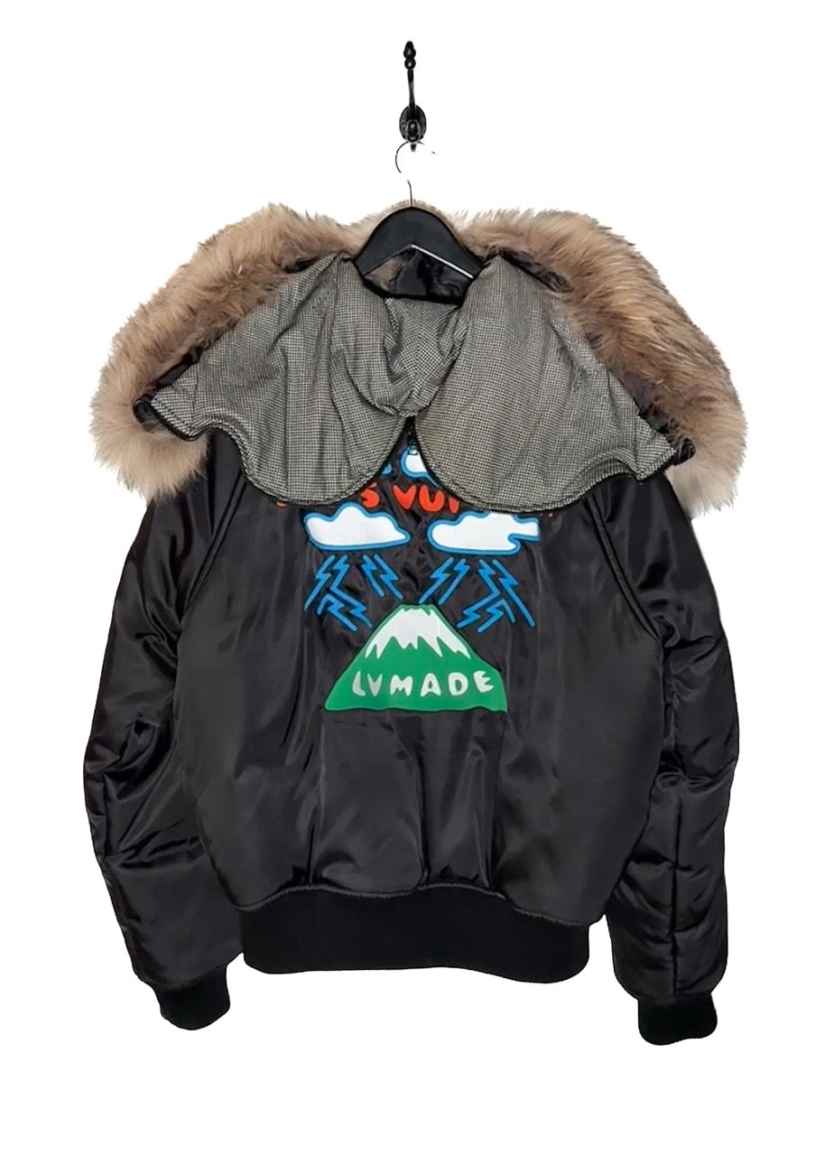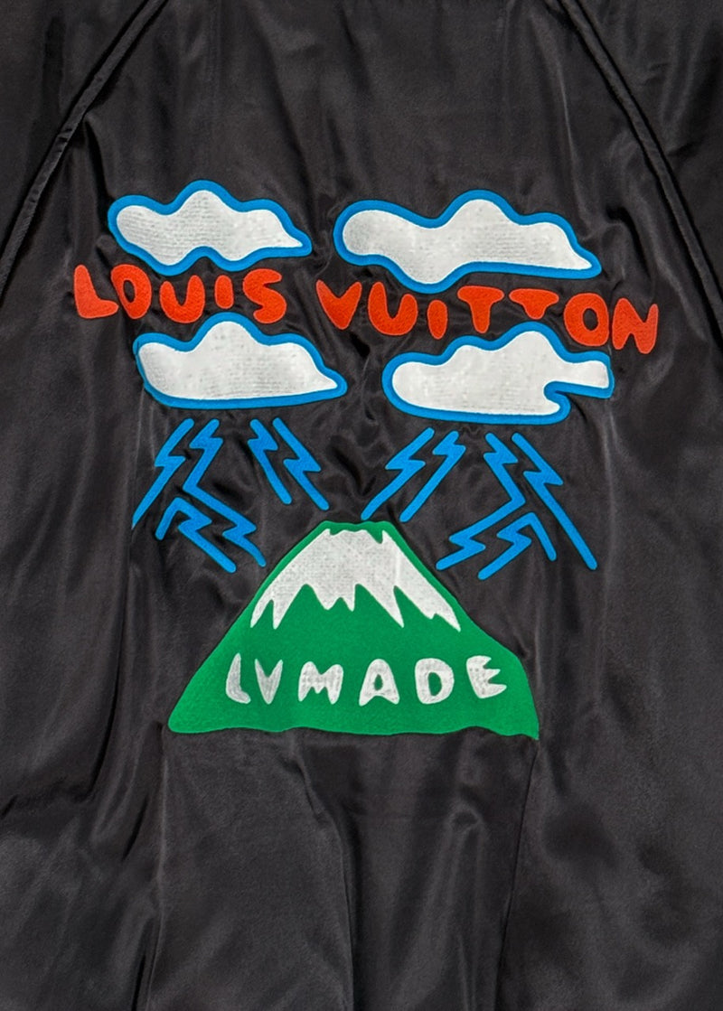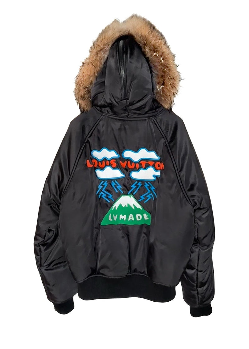 Collaboration piece. Made in black polyamide. Relaxed, oversized aviator silhouette. The back is embellished with a multicoloured embroidery featuring clouds, lightning bolts, and a mountain with "LV MADE" lettering. Features a centrally zippered hood that opens down the middle, trimmed with removable natural Finnraccoon fur and lined with a checkered cotton-blend fabric embroidered with tonal LV logos for a refined finish. Large front flap pockets, a sleeve pocket with zip closure, ribbed trim and cuff, interior branding on the woven lining, and branded buttons and zipper pulls throughout. Made in France.