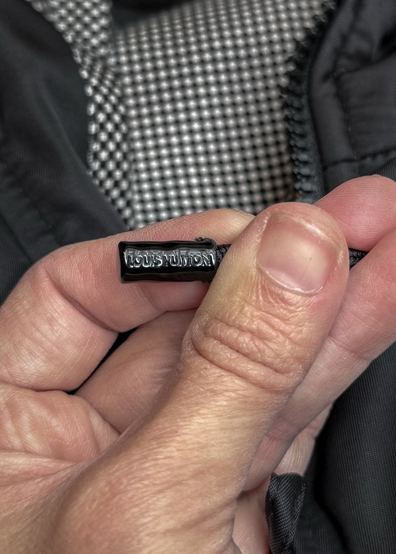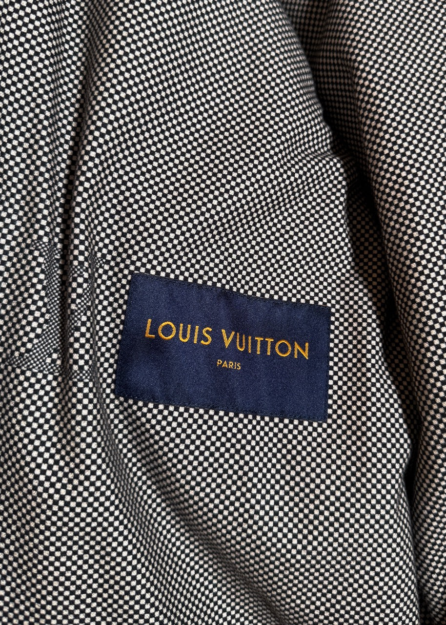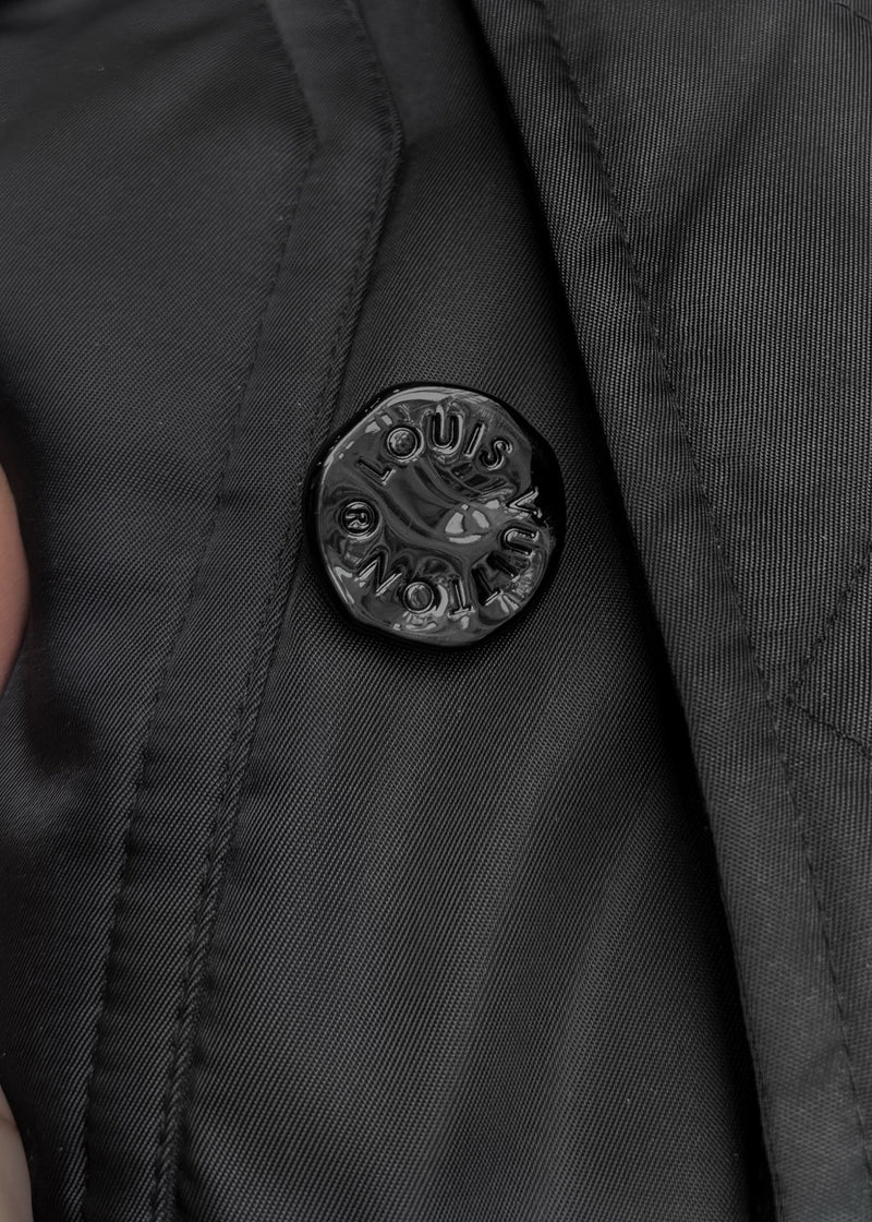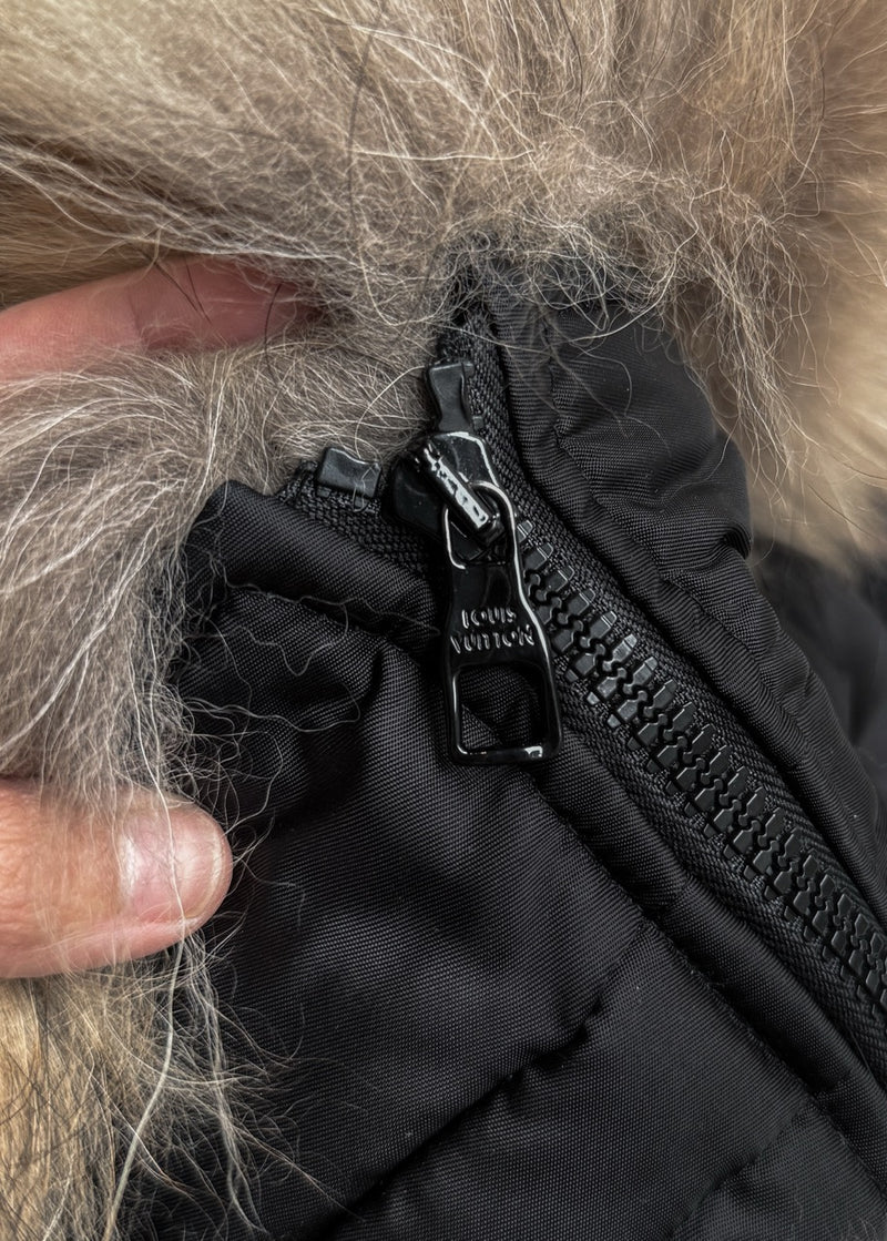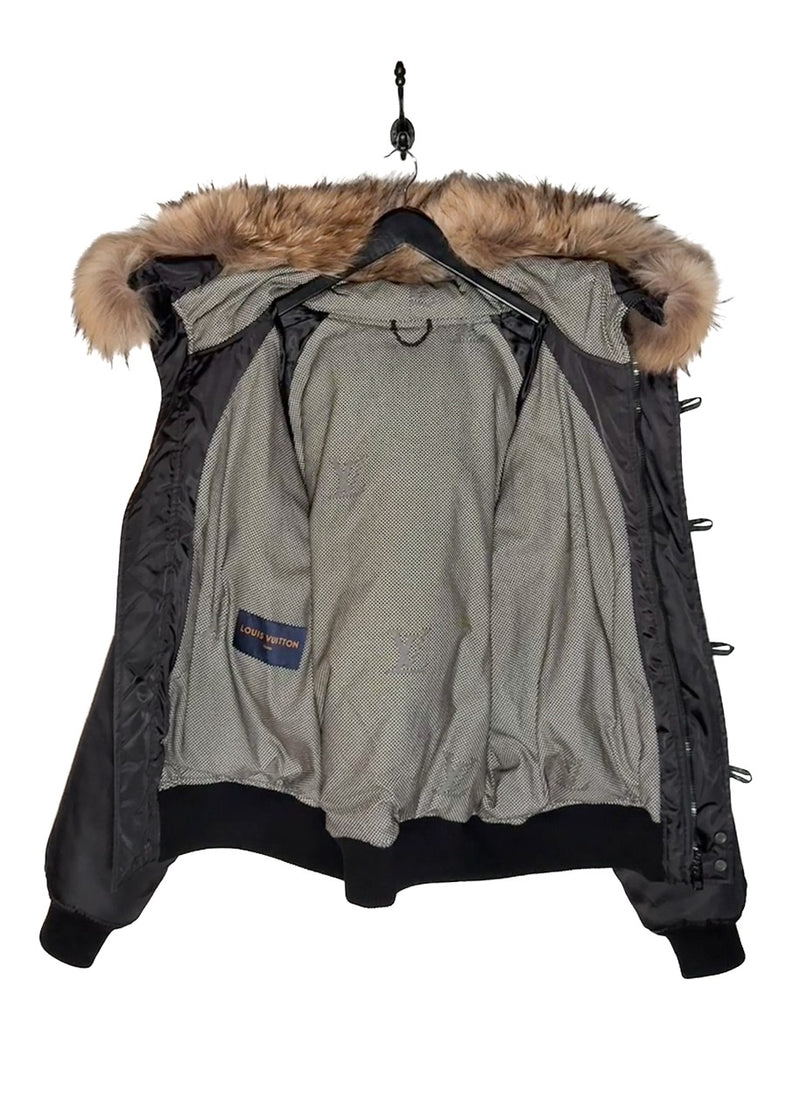 Collaboration piece. Made in black polyamide. Relaxed, oversized aviator silhouette. The back is embellished with a multicoloured embroidery featuring clouds, lightning bolts, and a mountain with "LV MADE" lettering. Features a centrally zippered hood that opens down the middle, trimmed with removable natural Finnraccoon fur and lined with a checkered cotton-blend fabric embroidered with tonal LV logos for a refined finish. Large front flap pockets, a sleeve pocket with zip closure, ribbed trim and cuff, interior branding on the woven lining, and branded buttons and zipper pulls throughout. Made in France.