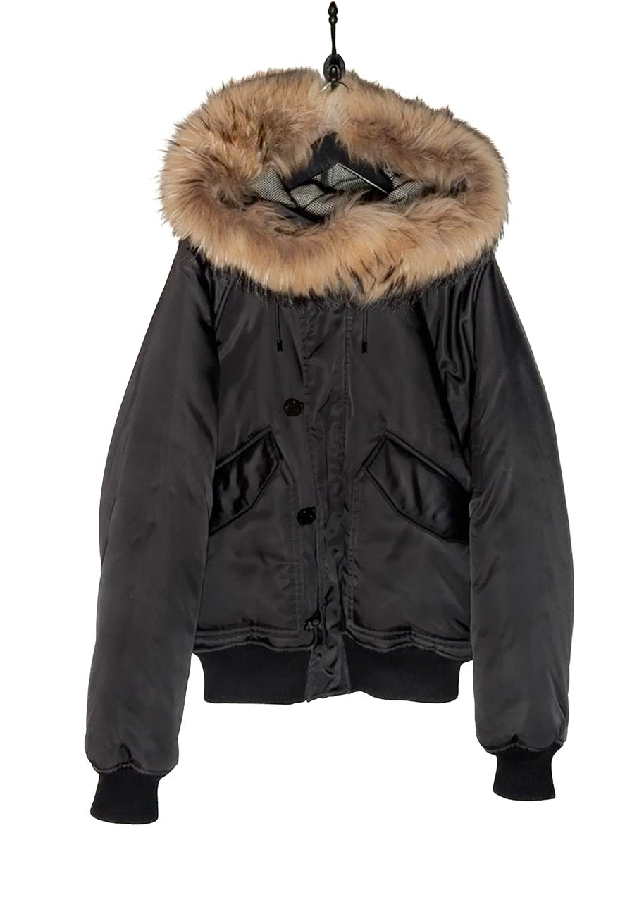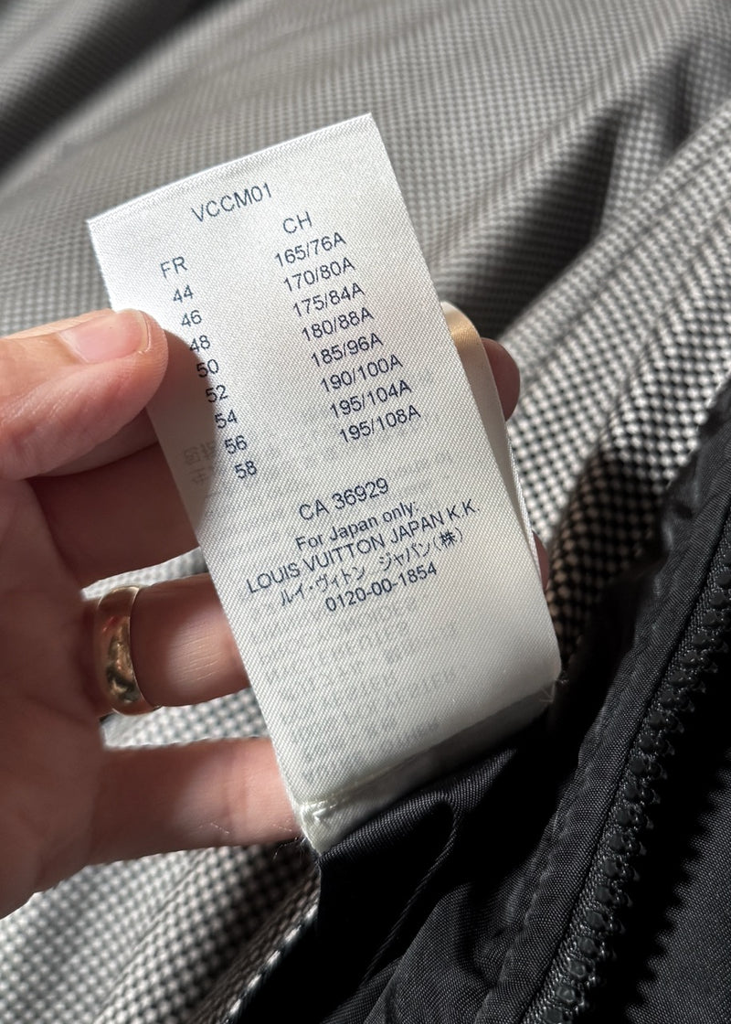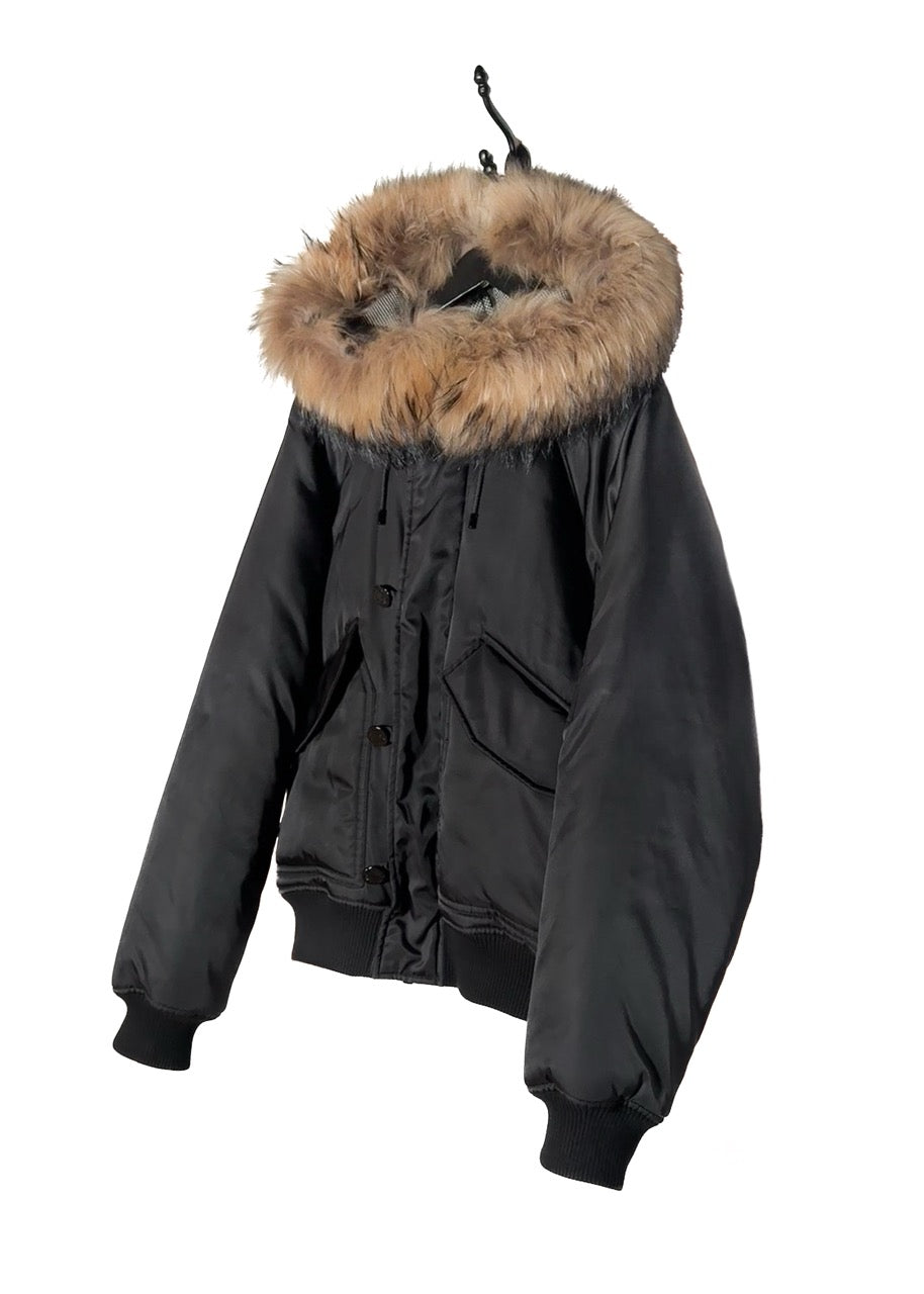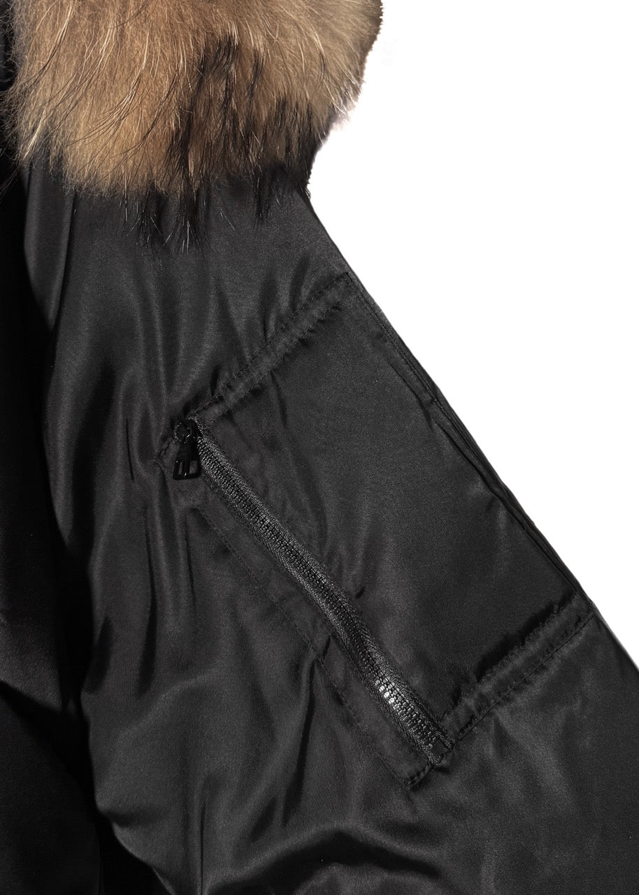Collaboration piece. Made in black polyamide. Relaxed, oversized aviator silhouette. The back is embellished with a multicoloured embroidery featuring clouds, lightning bolts, and a mountain with "LV MADE" lettering. Features a centrally zippered hood that opens down the middle, trimmed with removable natural Finnraccoon fur and lined with a checkered cotton-blend fabric embroidered with tonal LV logos for a refined finish. Large front flap pockets, a sleeve pocket with zip closure, ribbed trim and cuff, interior branding on the woven lining, and branded buttons and zipper pulls throughout. Made in France.