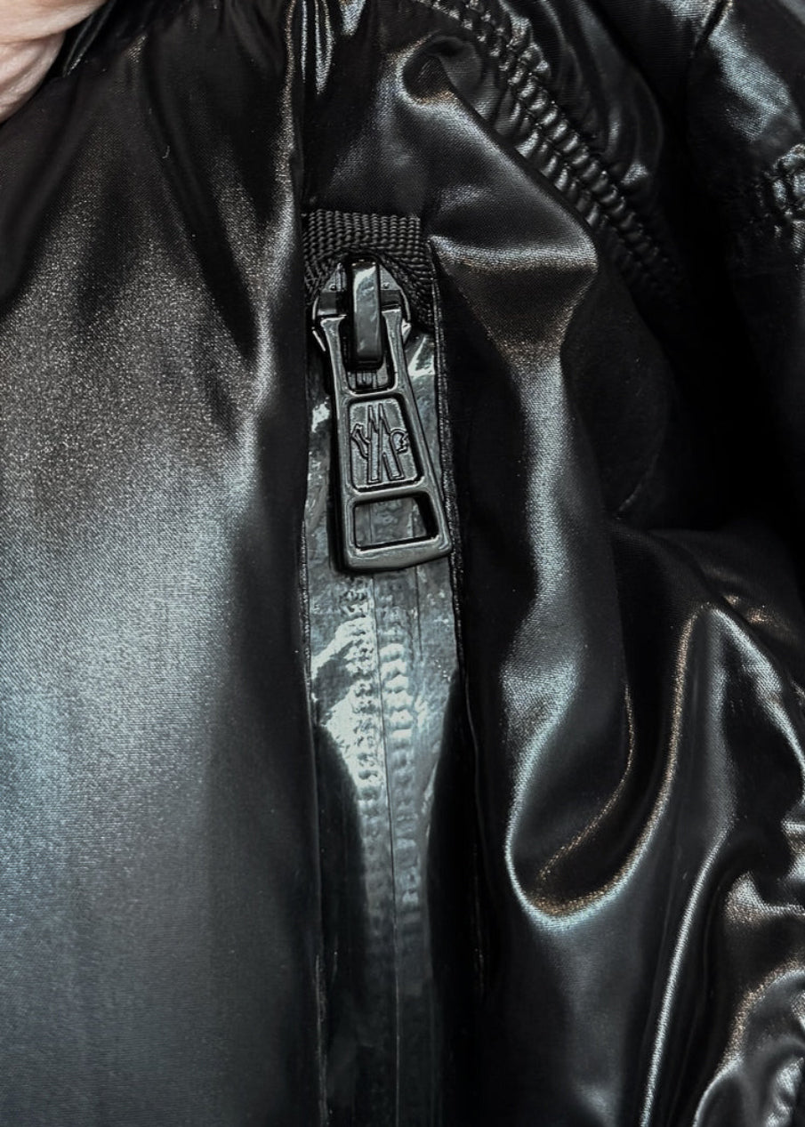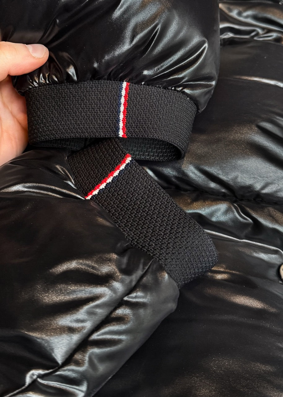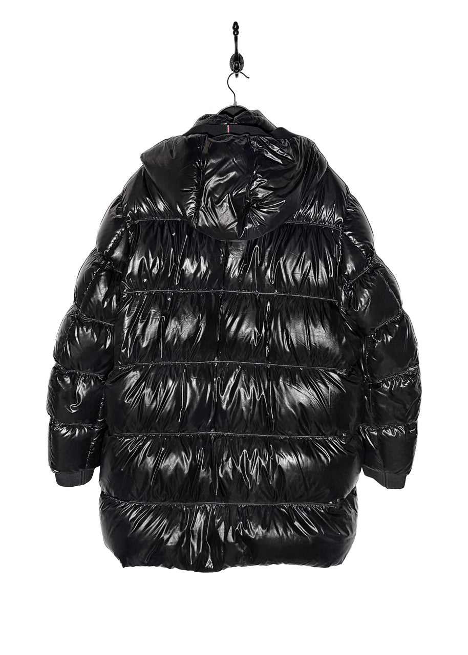 Long padded parka jacket with high-gloss nylon laqué finish. Features a detachable hood with Moncler logo jacquard lining and tricolour knit trim detail. Front closure with concealed zipper and snap buttons engraved with the Moncler logo. Two (2) vertical zip pockets at the front plus two (2) side pockets at sides. Logo patch embroidered on the left sleeve. Rib-knit cuffs with tricolour stripe accents. High-quality goose down filling for lightweight warmth and volume. Made in Romania. Comes with original tags.