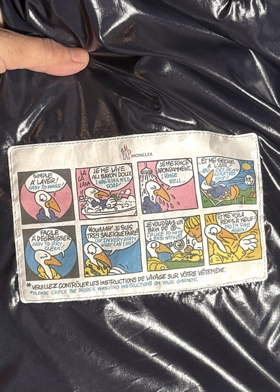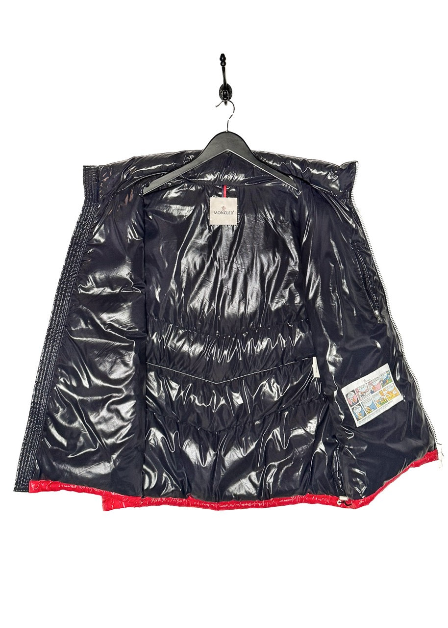 Quilted glossy nylon laqué with a tricolour colourblock panel design in navy blue, white, and red. Down filled. High padded collar with concealed snap-button attachment for an optional hood (the original hood is missing). Full-length two-way zip closure with branded Moncler white coated pullers. Two (2) side zip pockets. Signature Moncler logo patch at chest. Large chenille Moncler x Kith logo embroidery in tricolour detail at back. Large Moncler lettering embroidered across the back hem. Adjustable drawcord hem with branded toggles. Interior includes a tricolour grosgrain locker loop and Moncler’s comic strip label. Made in Romania.