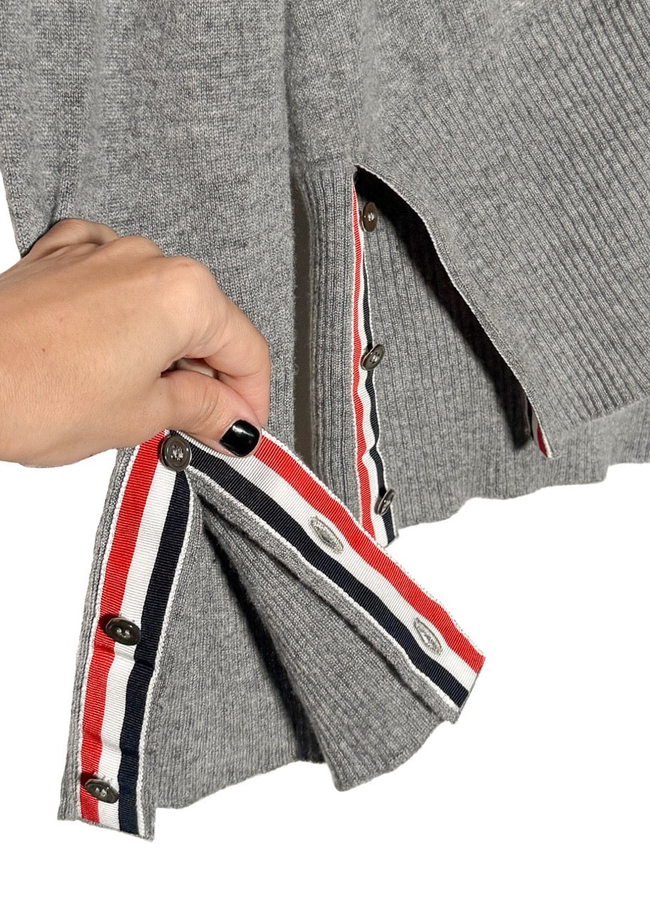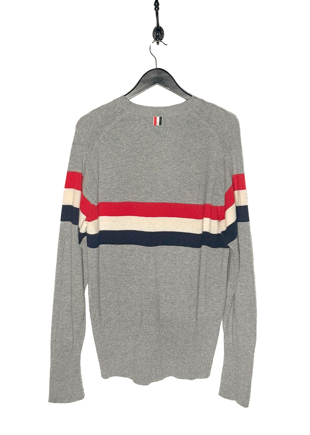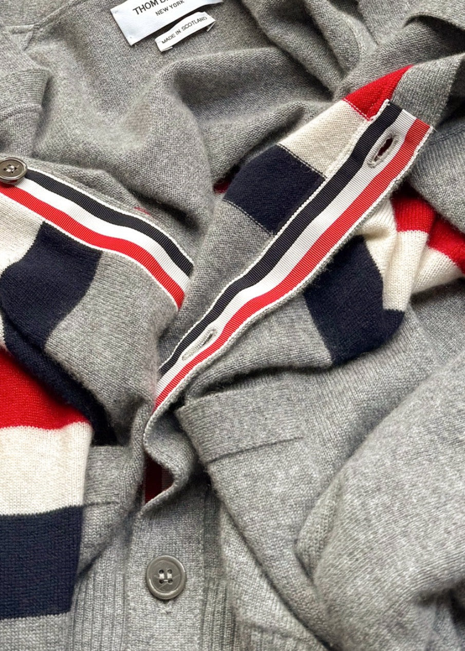 100% soft cashmere knitwear featuring Thom Browne’s signature red, white, and navy tricolour stripes across the chest and sleeves. Deep V-neckline, button-down front closure, and ribbed hem and cuffs. Tricolour grosgrain detail along the inner placket, side button vents and arm openings. Grey mother-of-pearl buttons. Two (2) front welt pockets. Made in Scotland.
