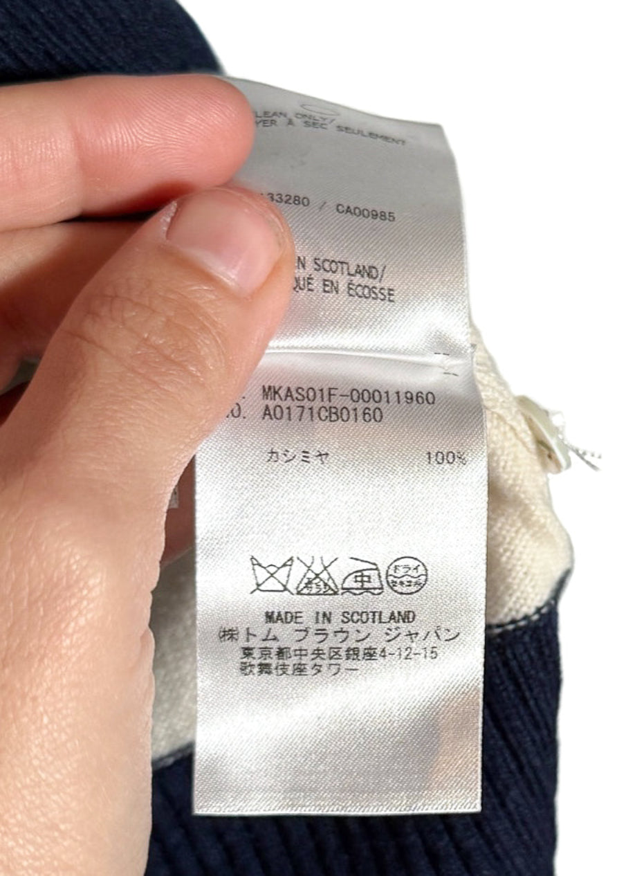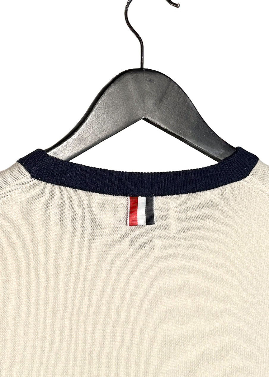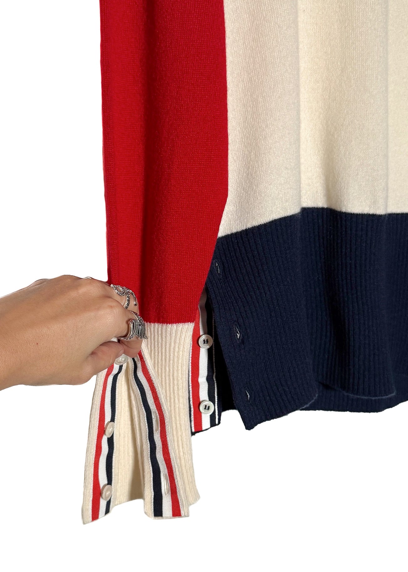 Pure cashmere. Ivory body with navy ribbed crewneck. Colourblock effect. Red right sleeve and navy left sleeve with Thom Browne’s signature four-bar stripes. Navy wide ribbed hem with functional side button plackets. Extended ribbed cuffs at sleeves with functional button plackets. Grosgrain tricolour loop tab at back neck and at plackets trims. Made in Scotland.