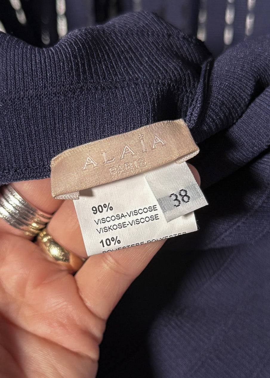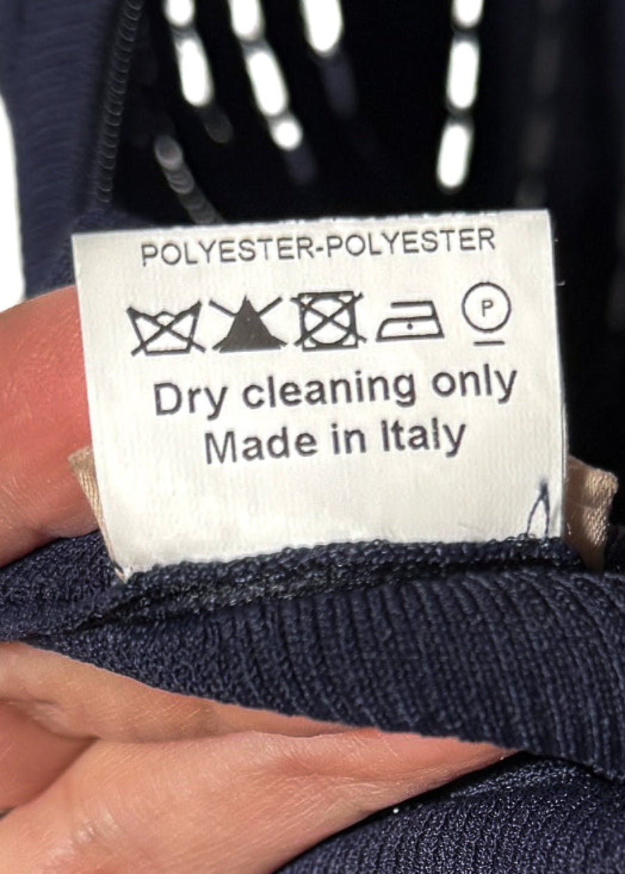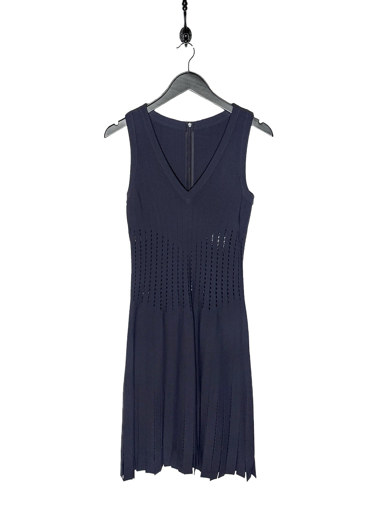 Sleeveless knit dress in deep navy. Mini length fit. V-neckline. Concealed back zip closure. Tight fine knit with vertical perforated detailing at the waist and skirt. Knit panels shape a fitted waist and flared hem. The skirt cutouts give a fringe effect at bottom. Ribbed trims at armholes and collar. Made in Italy.