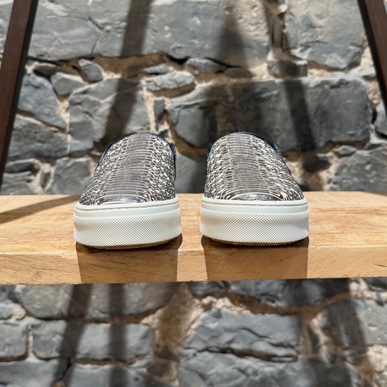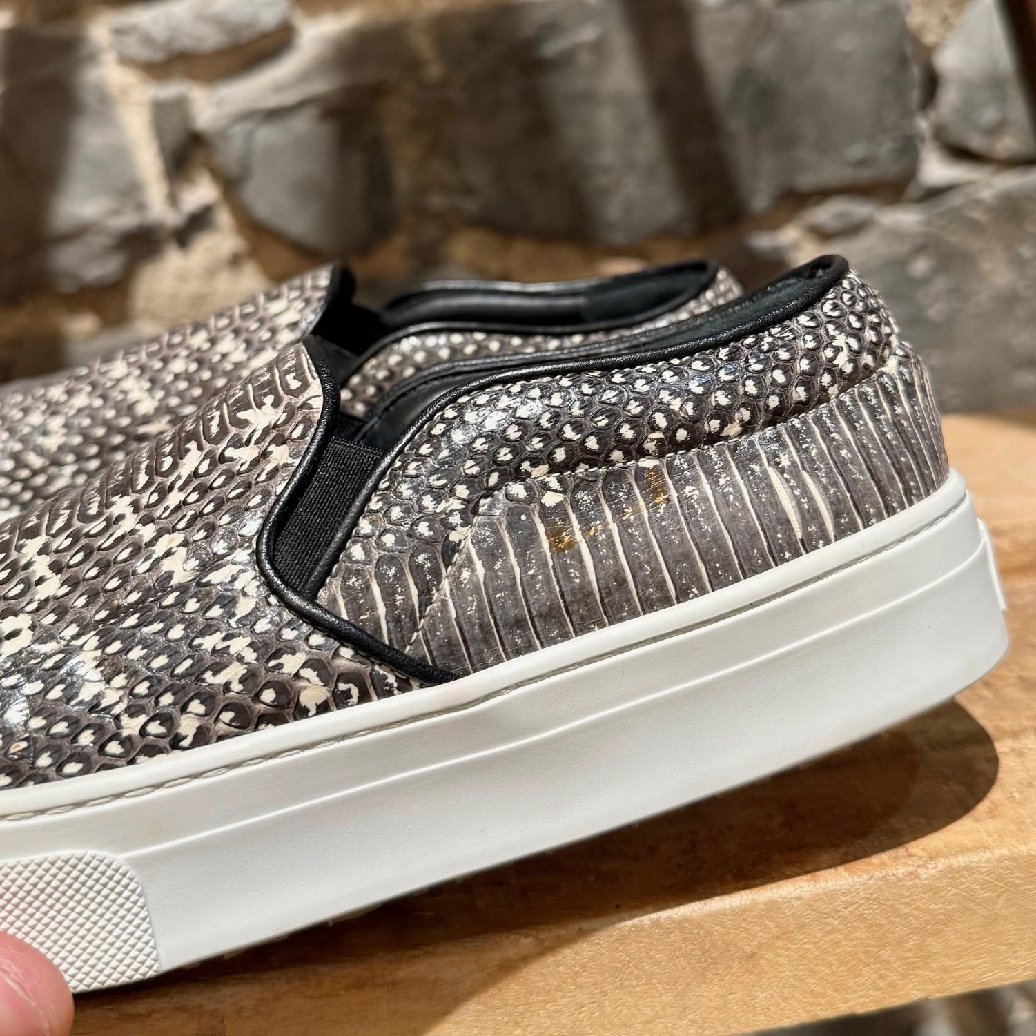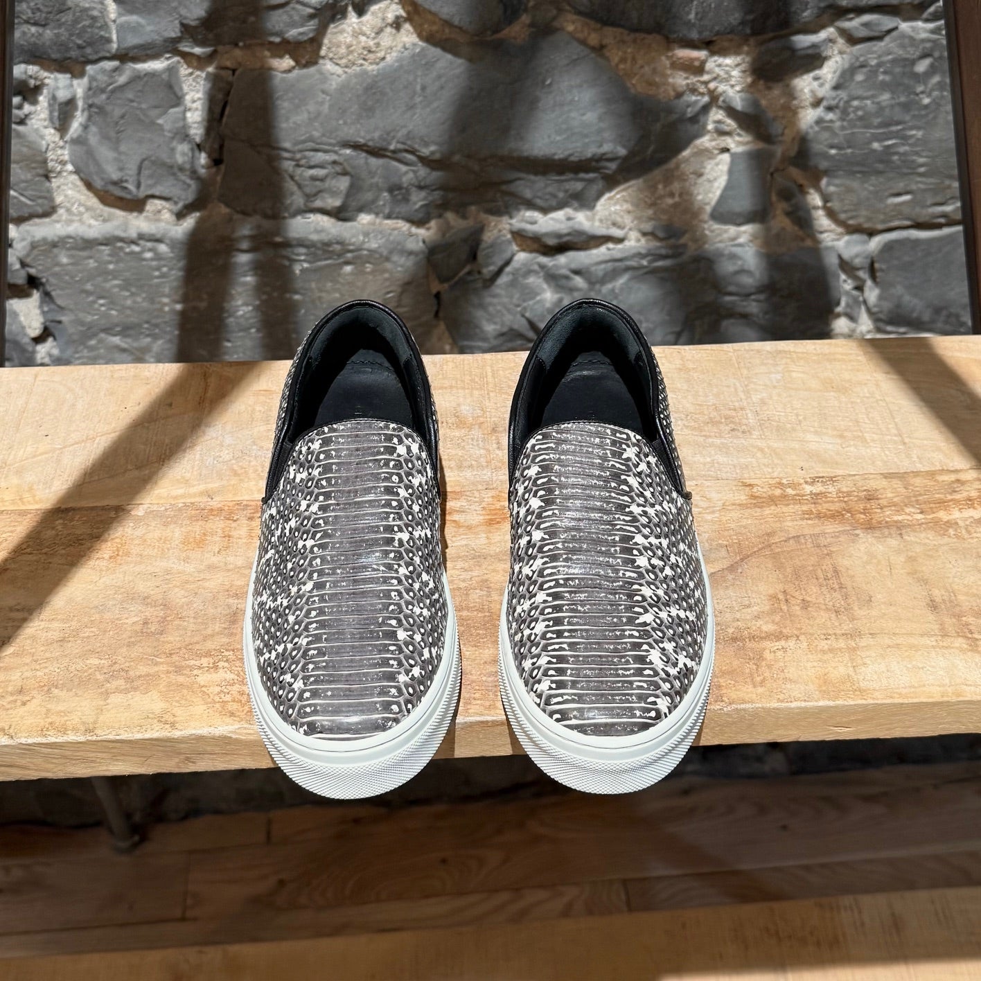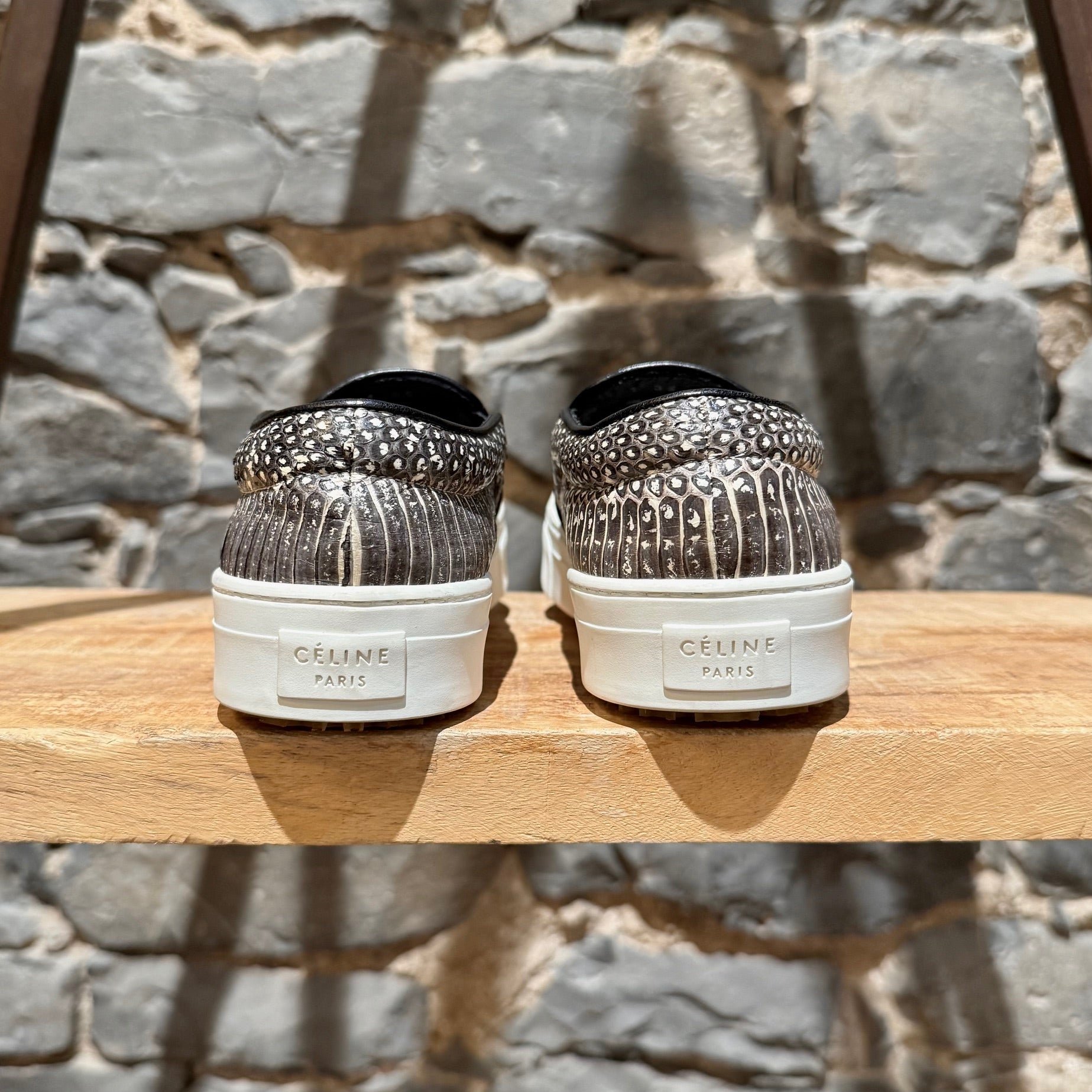 Low-profile skate-style slip-on sneakers with a rounded toe. Natural python skin upper with scaled texture and tonal pattern variation in black, grey and neutral tones. Elastic gore panels at the instep. Padded collar with black leather trim. Smooth leather lining. Flat white rubber midsole with textured foxing. Gum rubber outsole with honeycomb tread pattern. Embossed Céline Paris logo at the back heel. Made in Italy. Come with Céline dustbag.