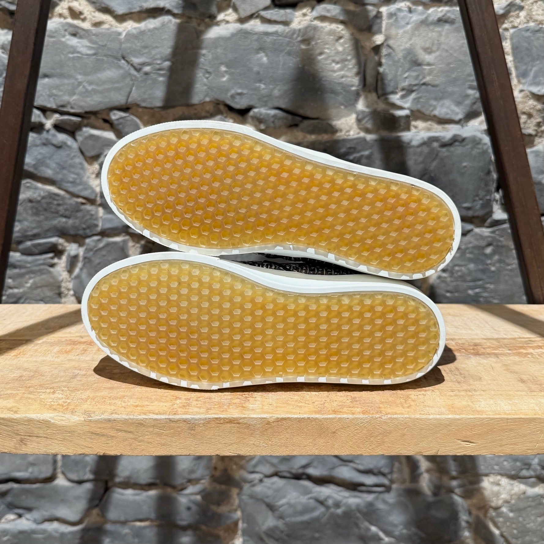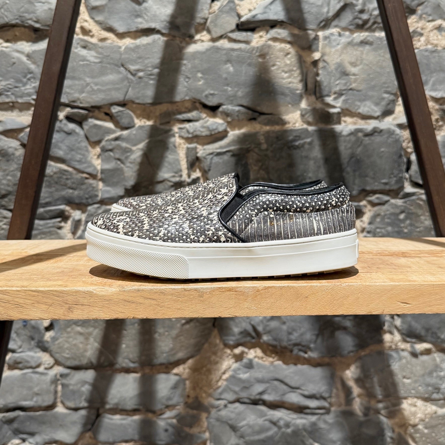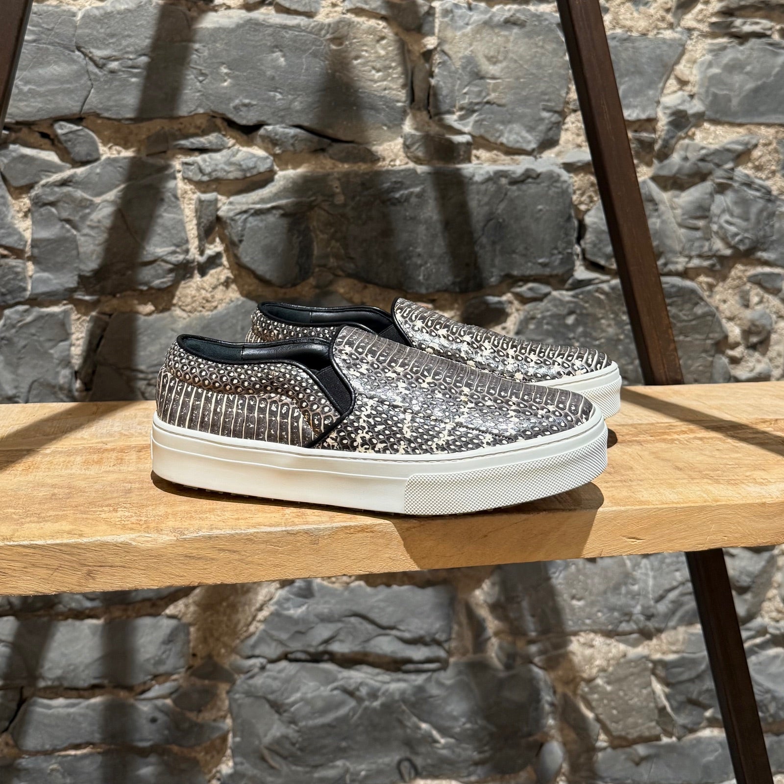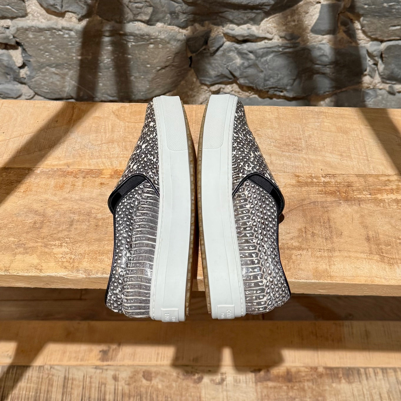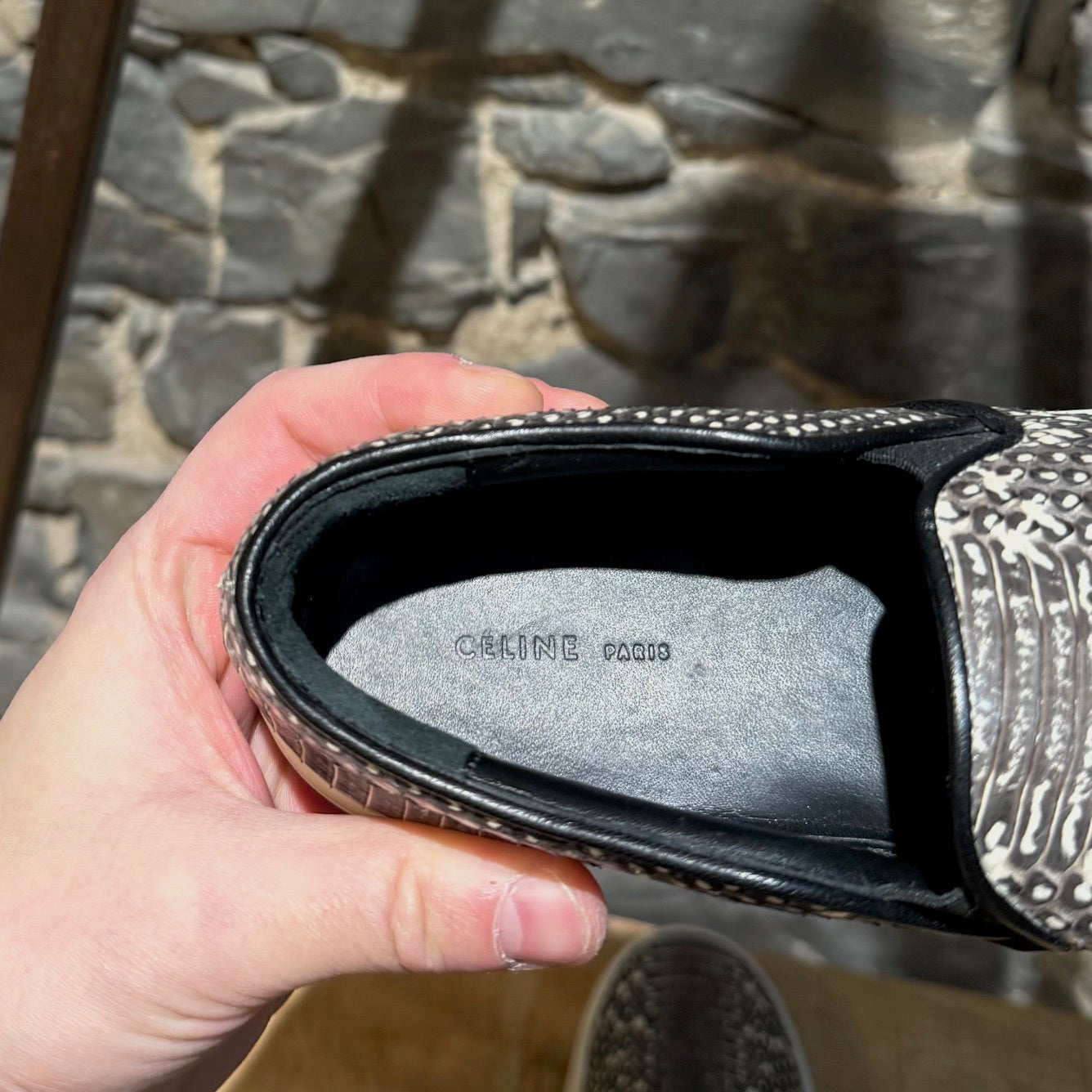 Low-profile skate-style slip-on sneakers with a rounded toe. Natural python skin upper with scaled texture and tonal pattern variation in black, grey and neutral tones. Elastic gore panels at the instep. Padded collar with black leather trim. Smooth leather lining. Flat white rubber midsole with textured foxing. Gum rubber outsole with honeycomb tread pattern. Embossed Céline Paris logo at the back heel. Made in Italy. Come with Céline dustbag.