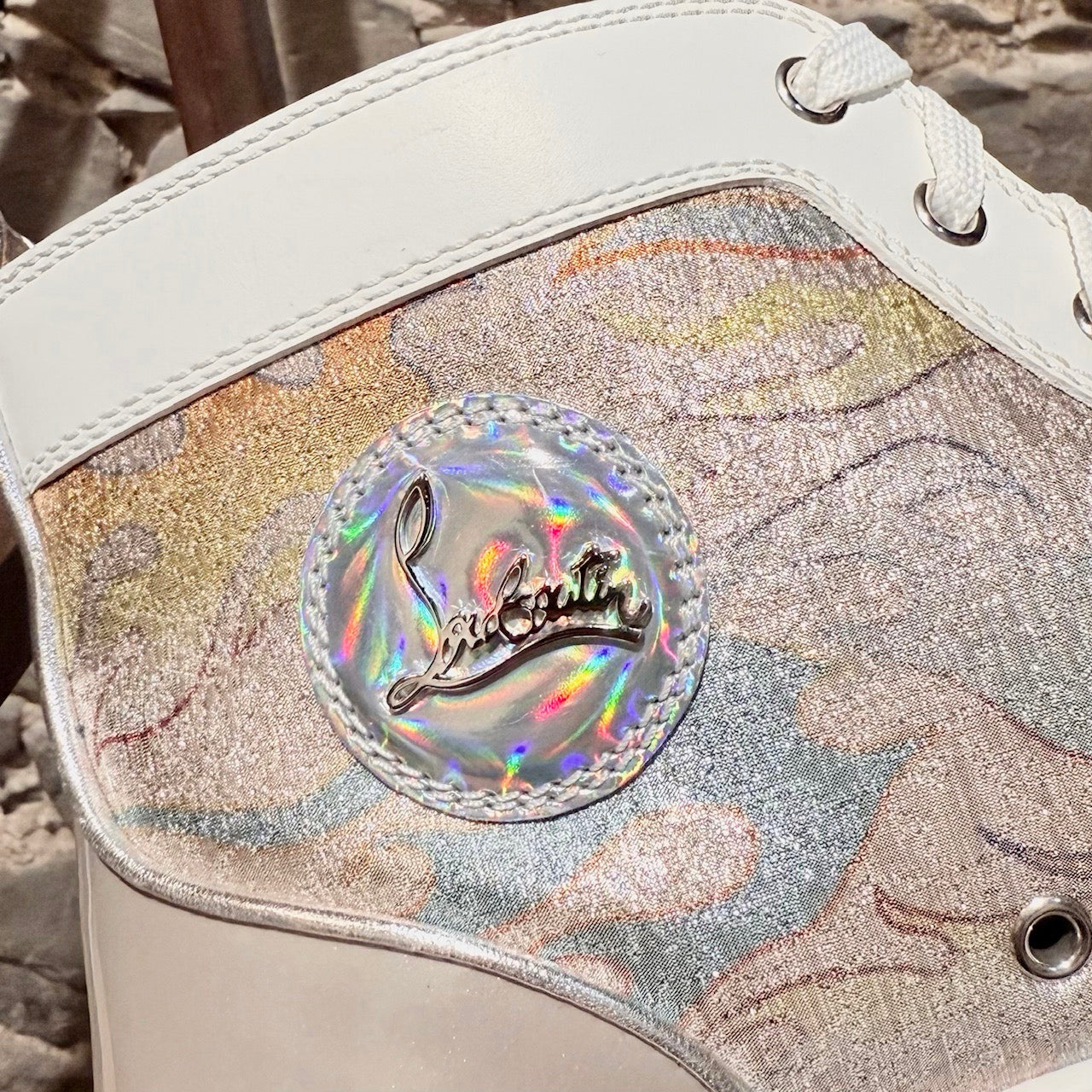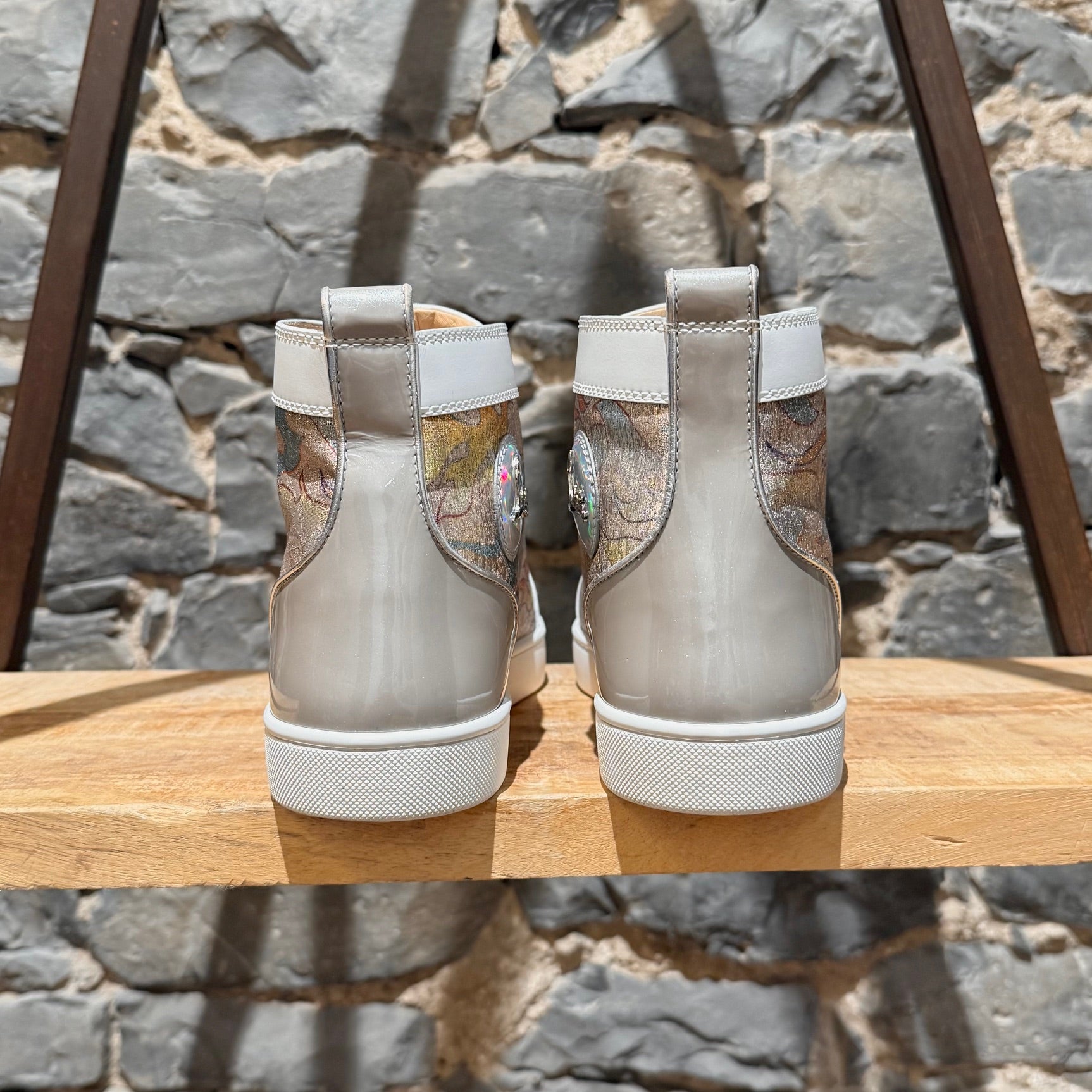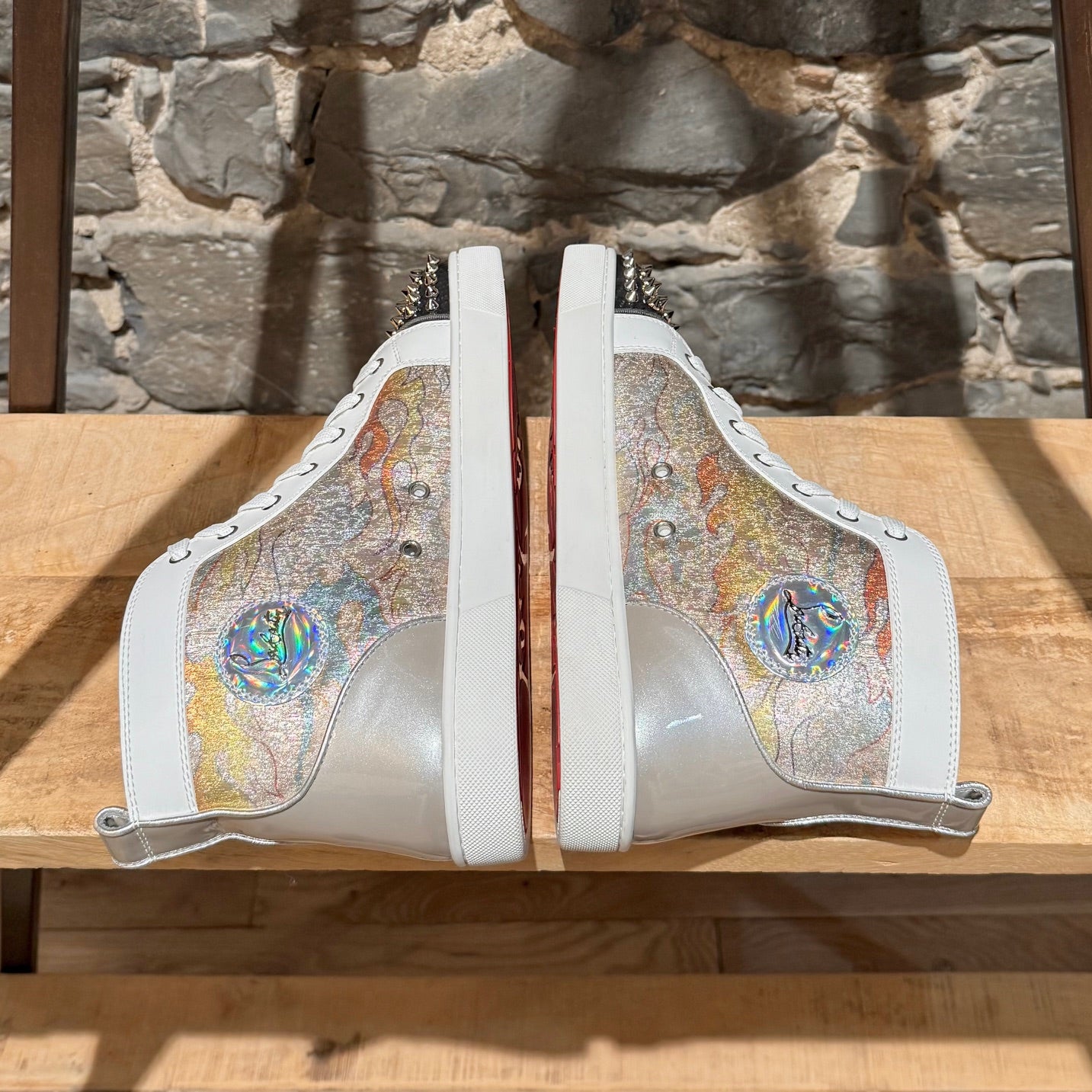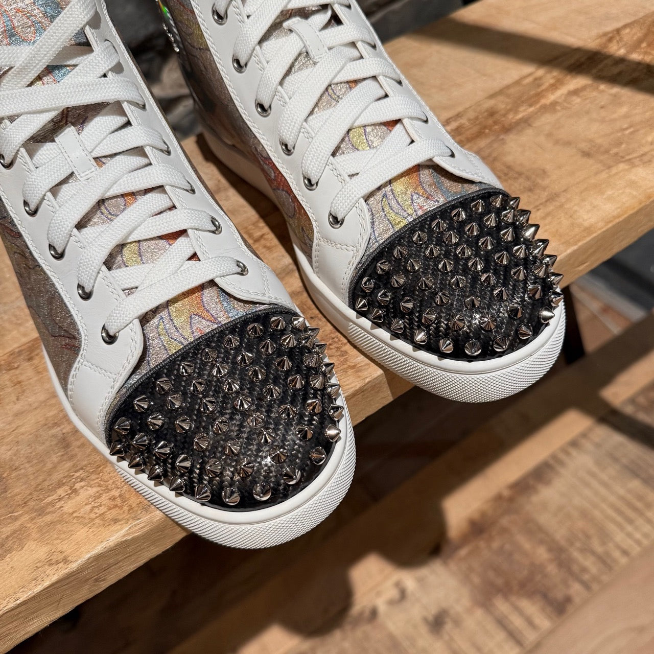 High-top lace-up sneakers. White leather trim. Grey patent panel at back. Multicolour flame-pattern lurex fabric panels with a metallic finish. Charcoal patterned toe caps embellished with signature silver-tone metal spikes. Round toe. Iridescent signature logo patch at inner ankle. Flat white rubber midsoles. Signature red rubber outsoles with embossed Louboutin branding. Padded collars and tongues. Beige leather lining. Removable leather insoles. Pull tabs at the back. Made in Italy. Come with extra laces, Louboutin box and dustbag.