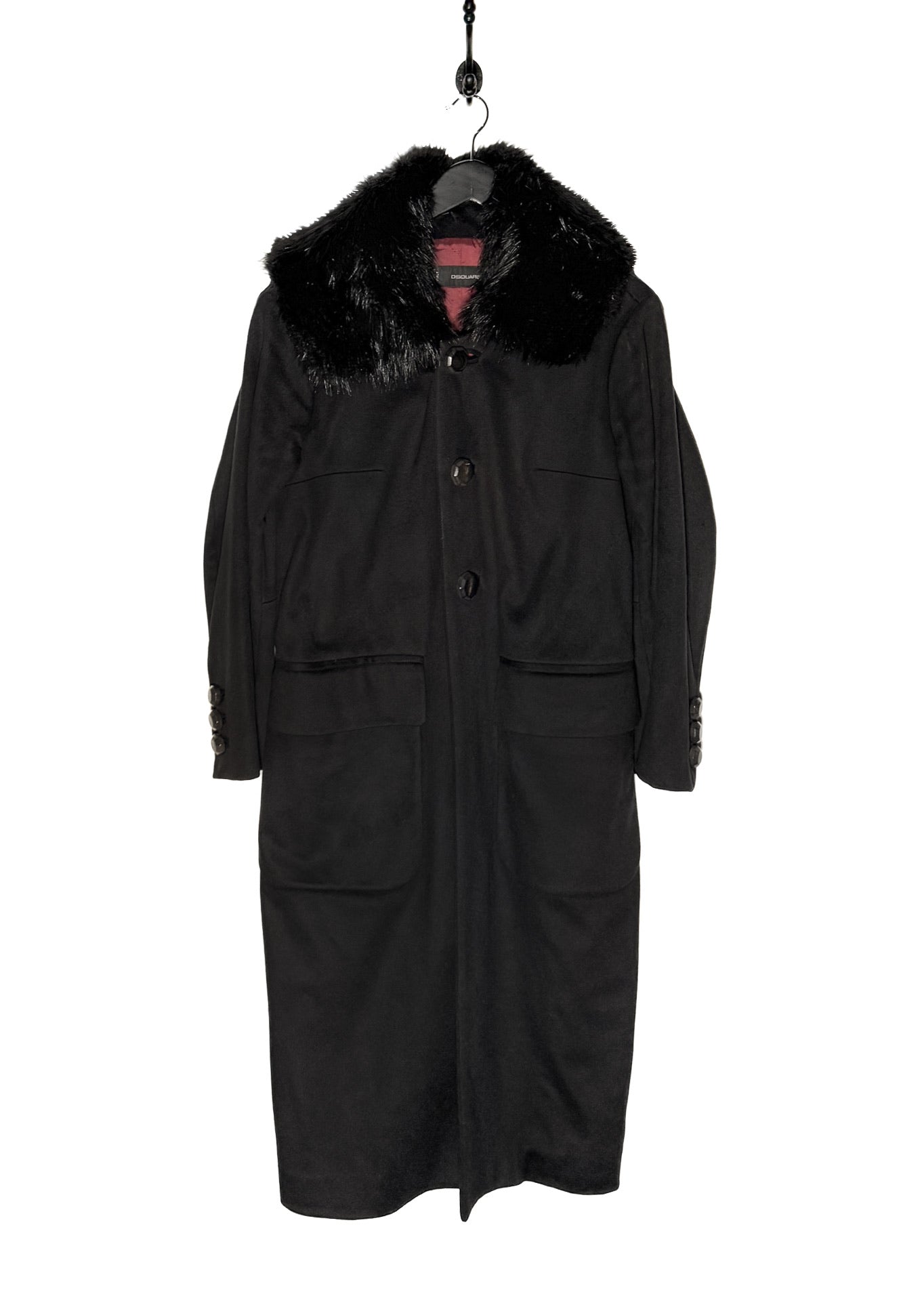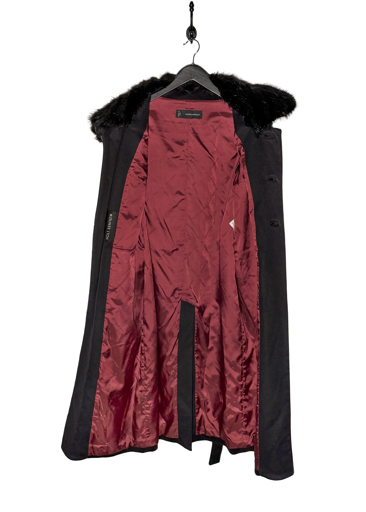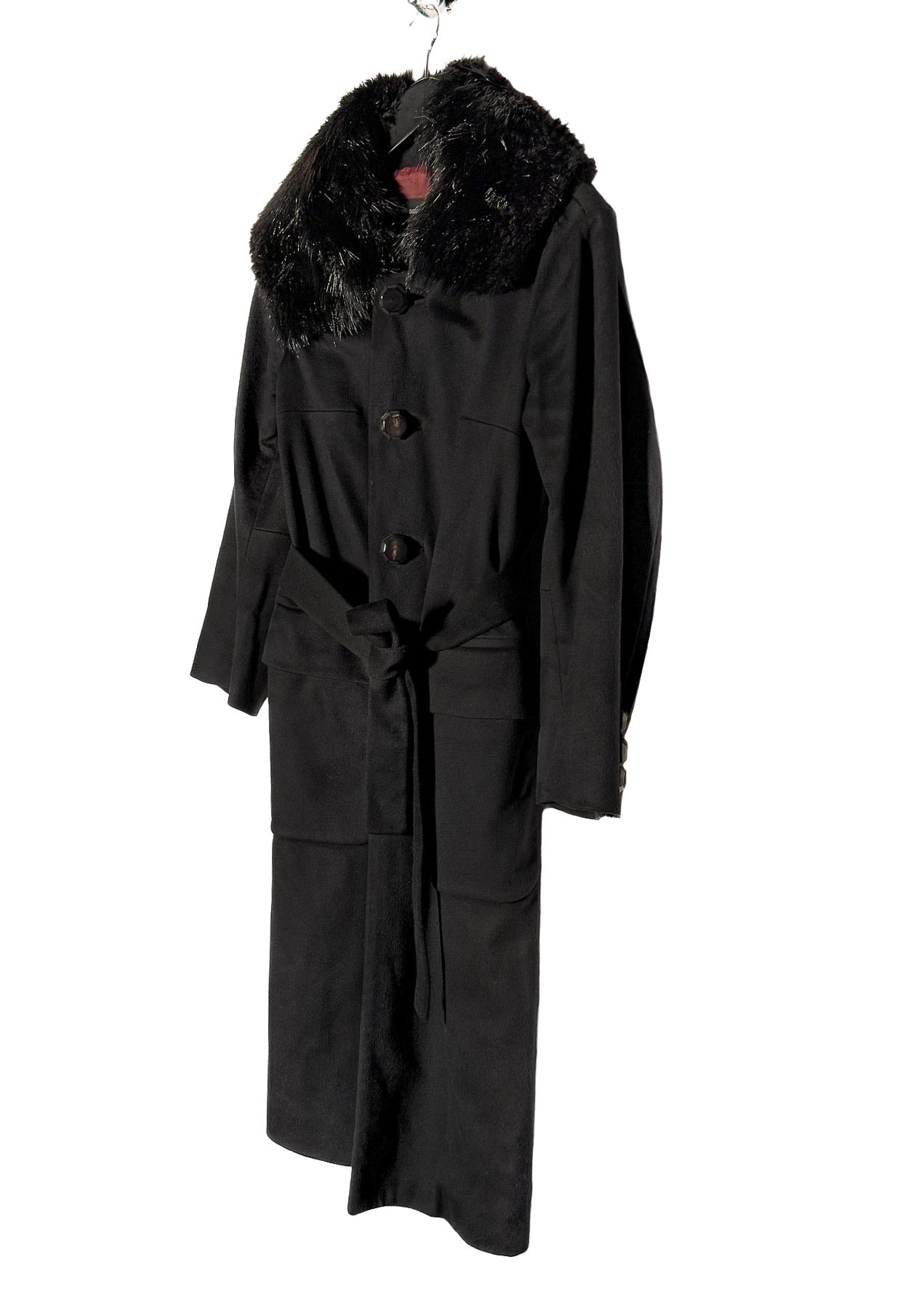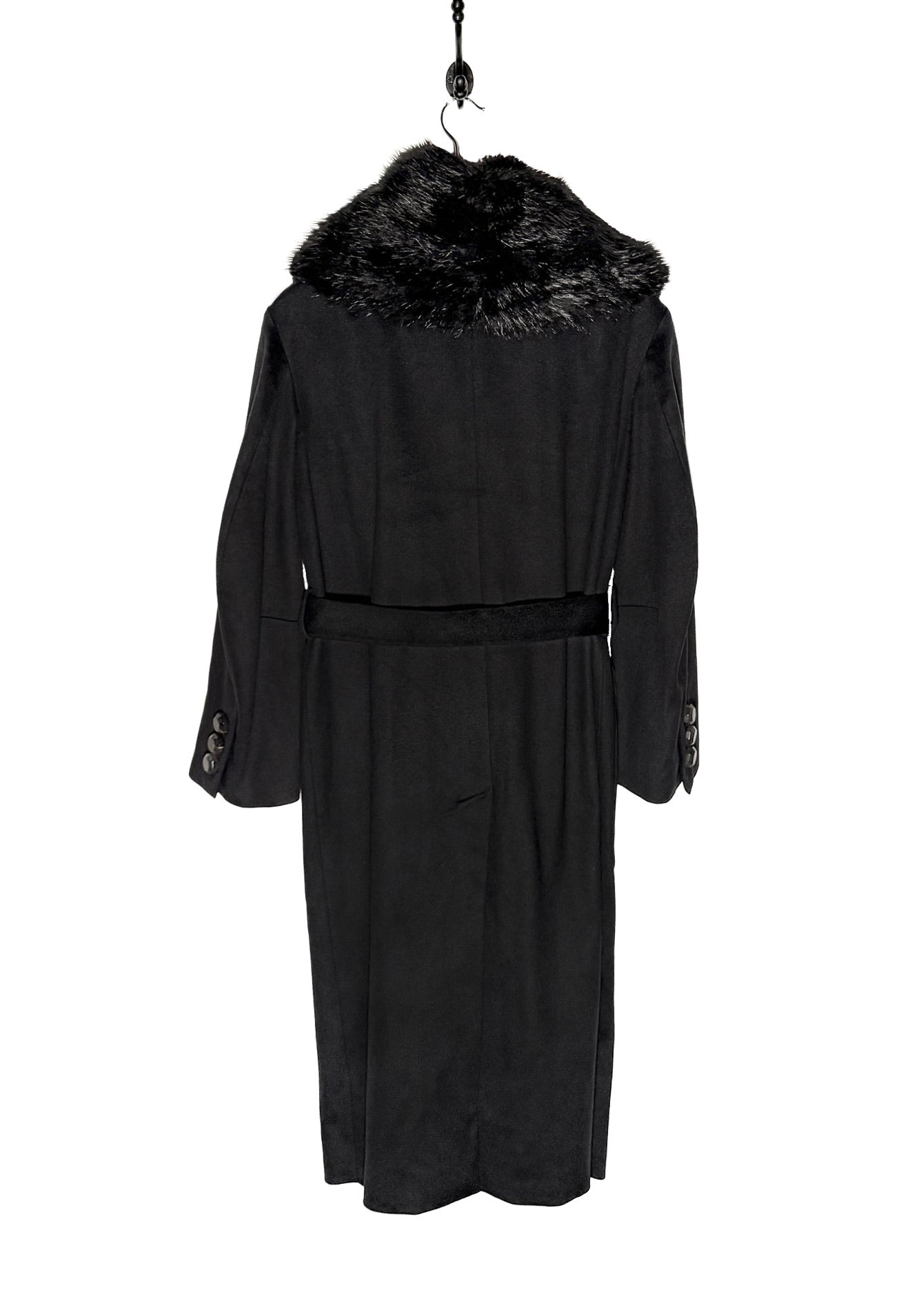 Long black coat with genuine beaver fur collar and removable waist belt. Relaxed silhouette. Three (3) large dark octagonal faceted buttons with a wood-like finish at front closure. Sleeves finished with three (3) smaller matching buttons at cuffs. Two (2) front flap pockets. Single rear vent. Deep burgundy logo-patterned jacquard lining. Made in Italy.