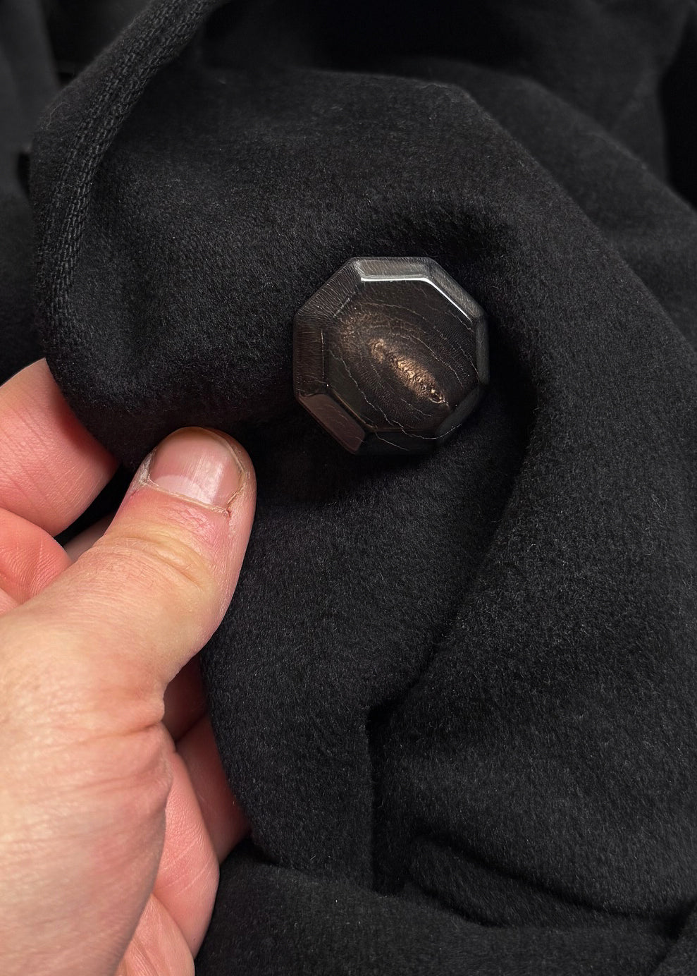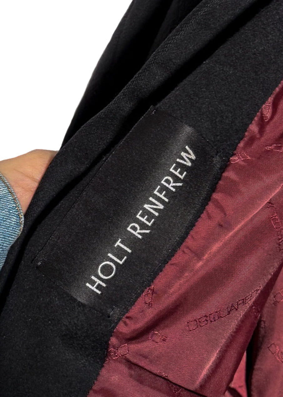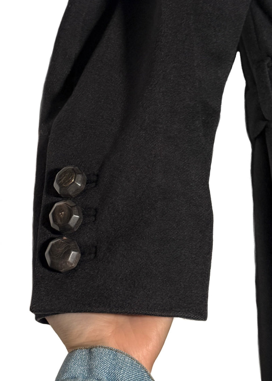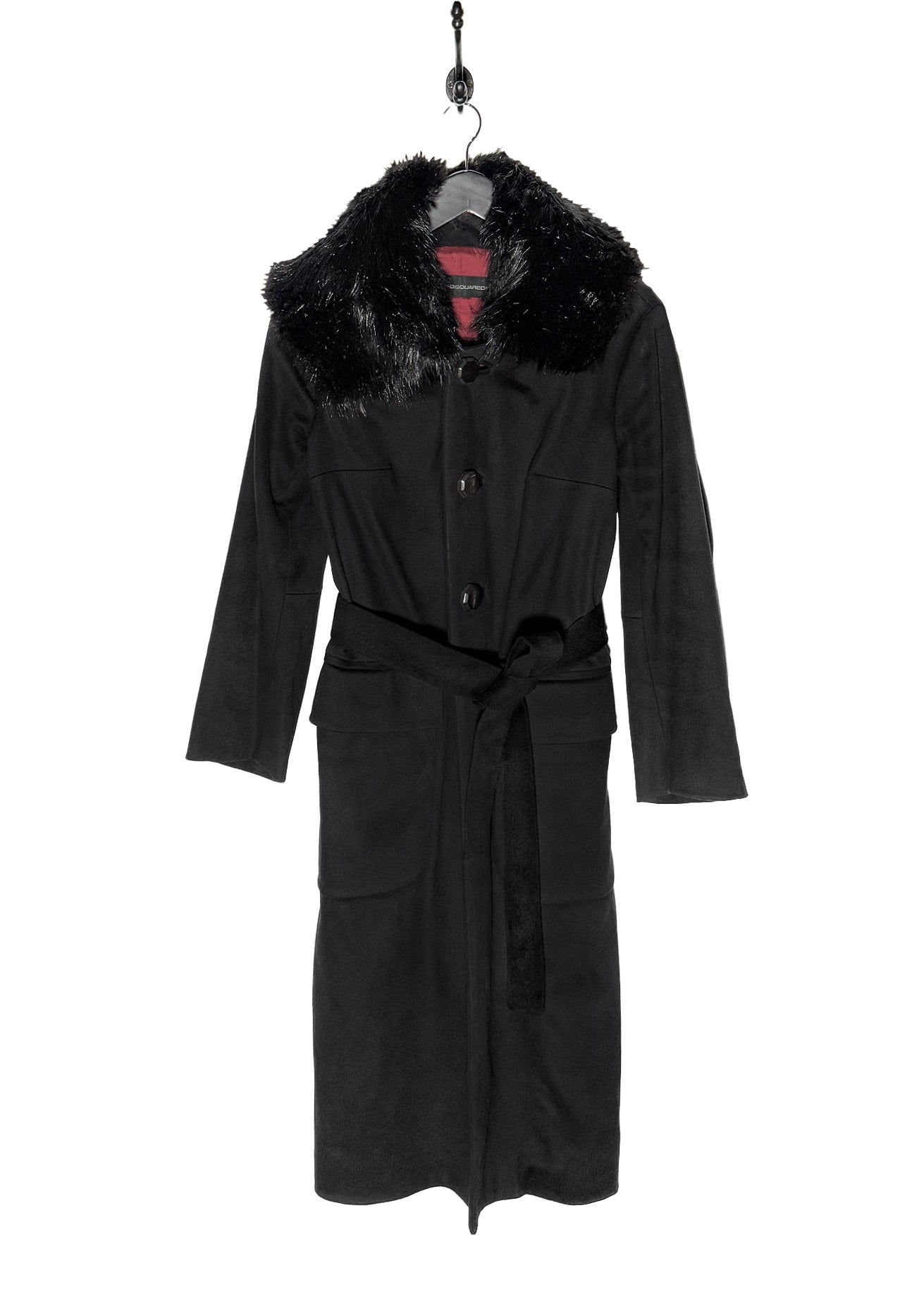 Long black coat with genuine beaver fur collar and removable waist belt. Relaxed silhouette. Three (3) large dark octagonal faceted buttons with a wood-like finish at front closure. Sleeves finished with three (3) smaller matching buttons at cuffs. Two (2) front flap pockets. Single rear vent. Deep burgundy logo-patterned jacquard lining. Made in Italy.