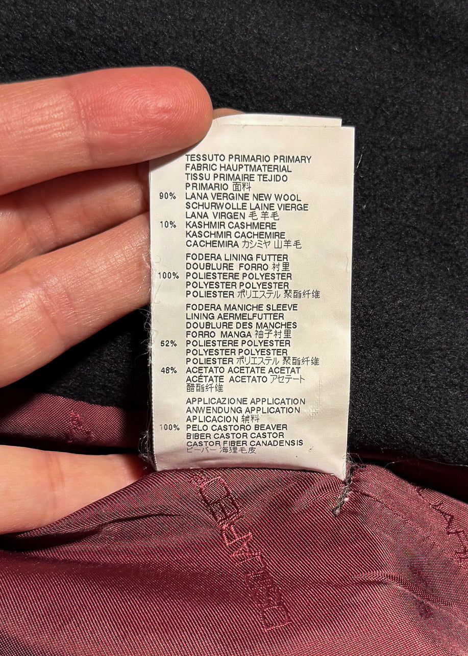 Overall length: 43"MATERIAL(S): 90% new wool, 10% cashmere. Lining: 100% polyester. Sleeve lining: 52% polyester, 48% acetate. Application: 100% beaver fur.