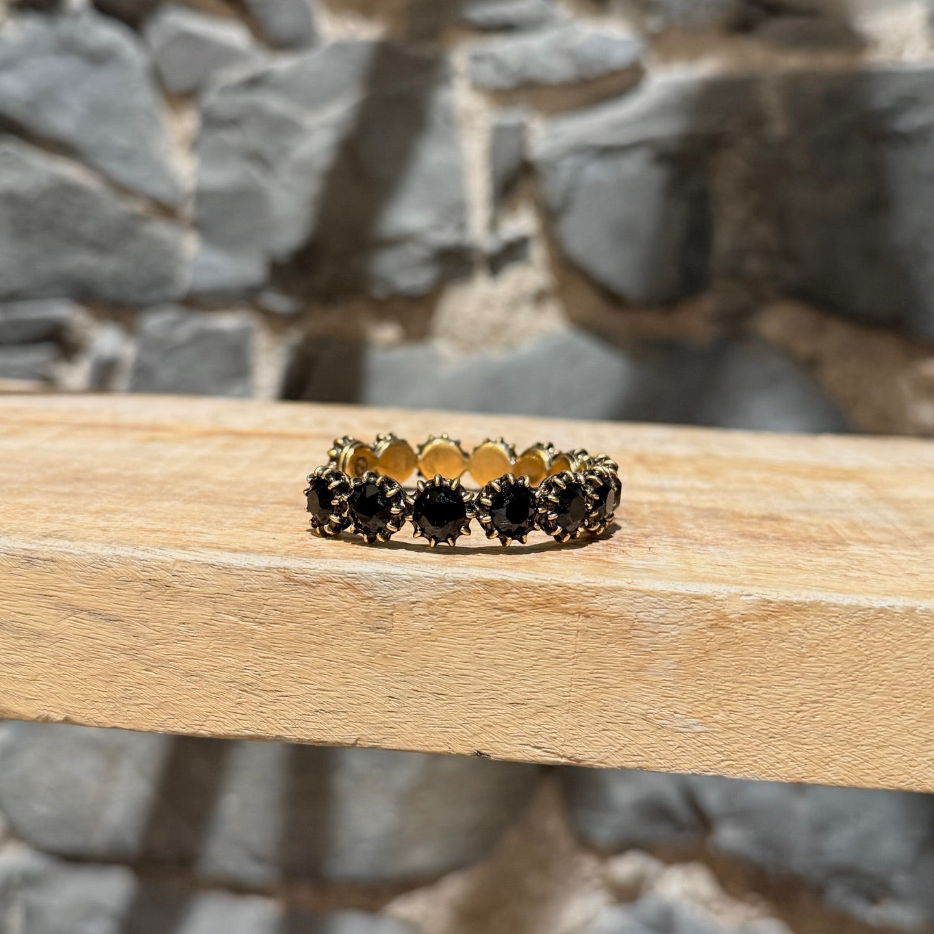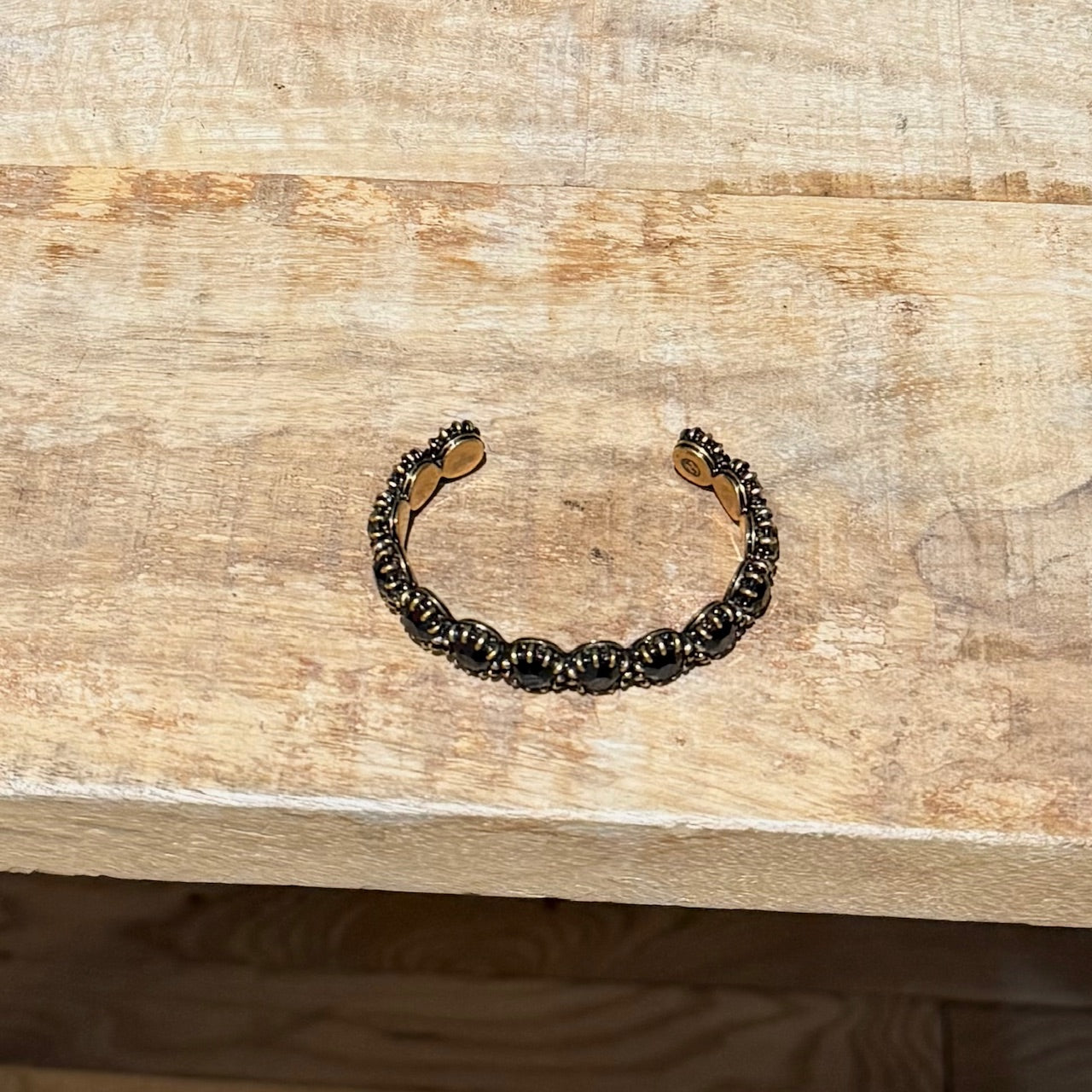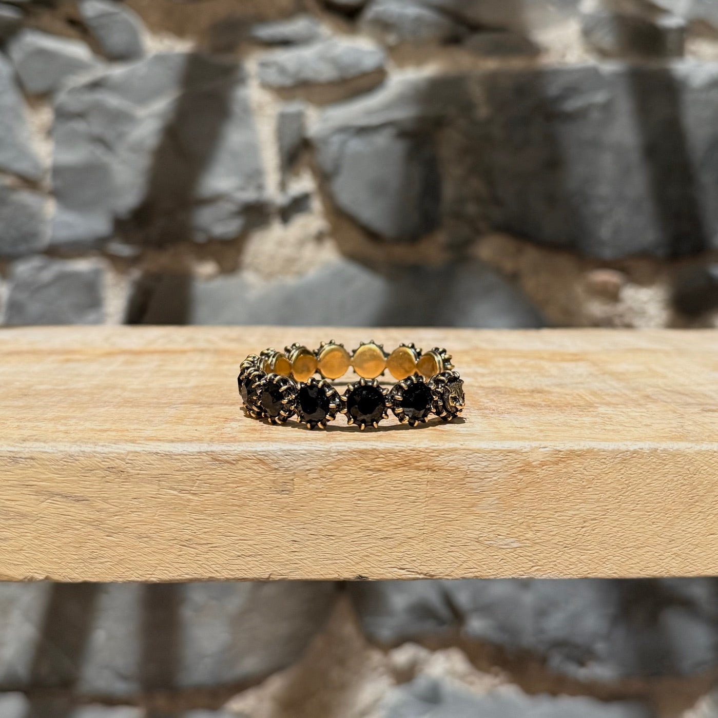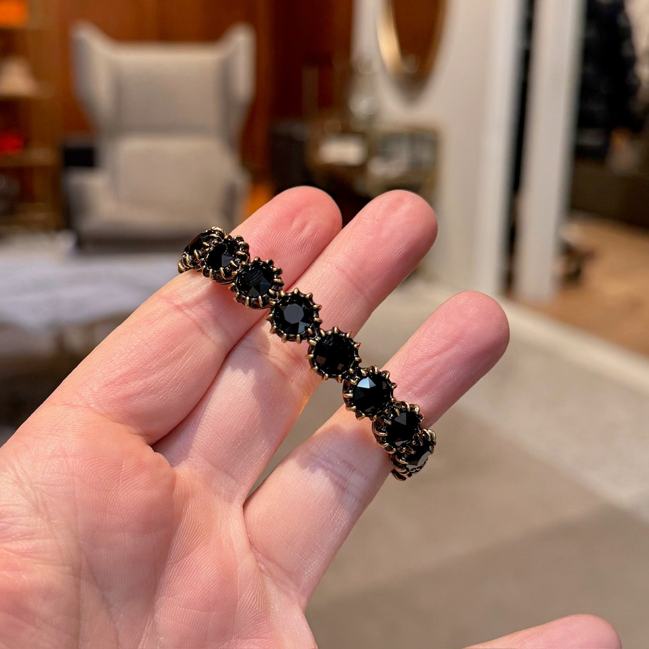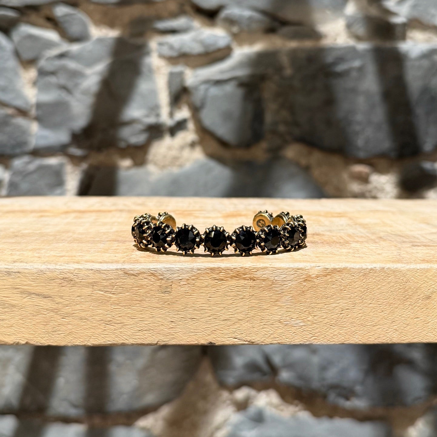 Width: 0.5" approx.MATERIAL(S): Gold-tone metal. Black faceted stones.