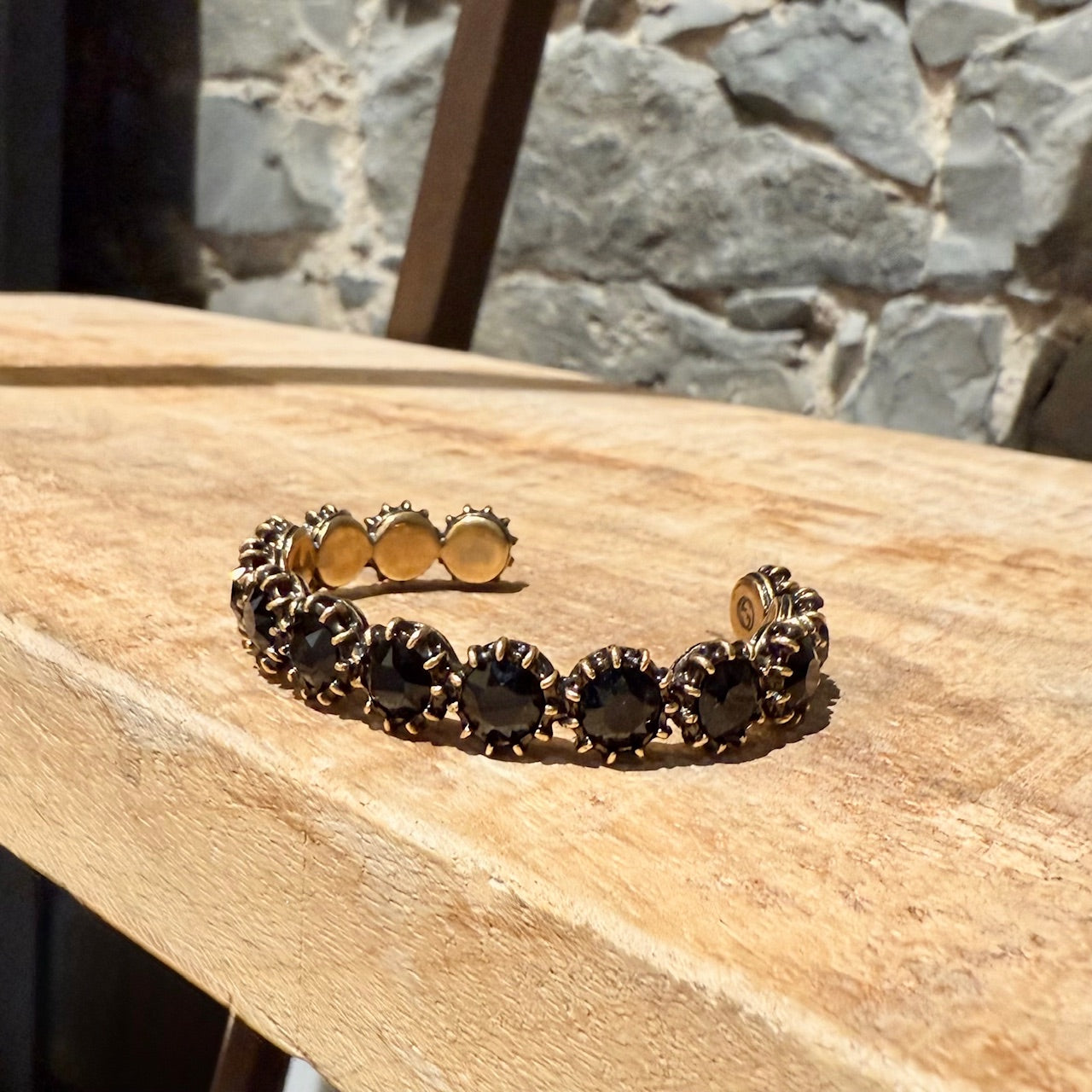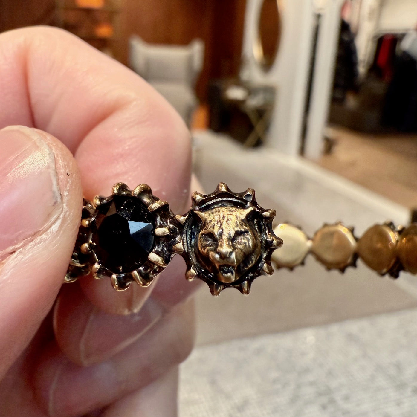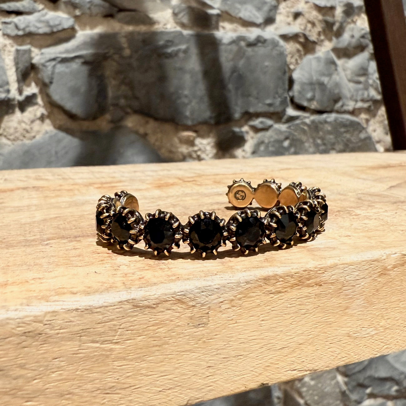 Open cuff bracelet design. Alternating round black faceted stones secured by raised prongs. Gold-tone metal with an antiqued finish. Sculpted feline head at one end. Gucci logo engraved on the interior. Made in Italy. Comes as is.
