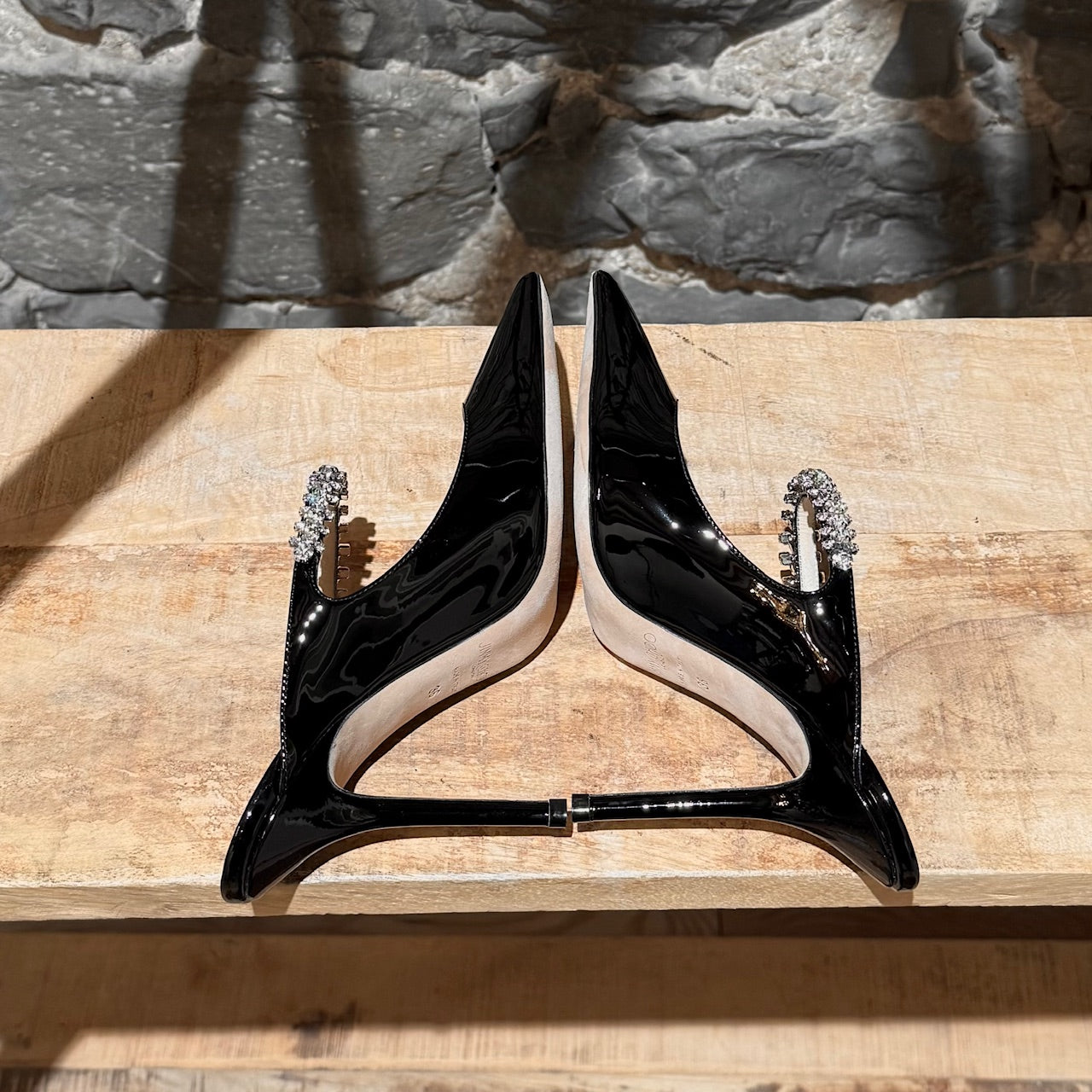 Slip-on mule design. Black patent leather upper with glossy finish. Crystal-embellished strap across the instep. Pointed toe. Slim stiletto heel. Beige leather insole and outsole. Made in Italy. Come as is.