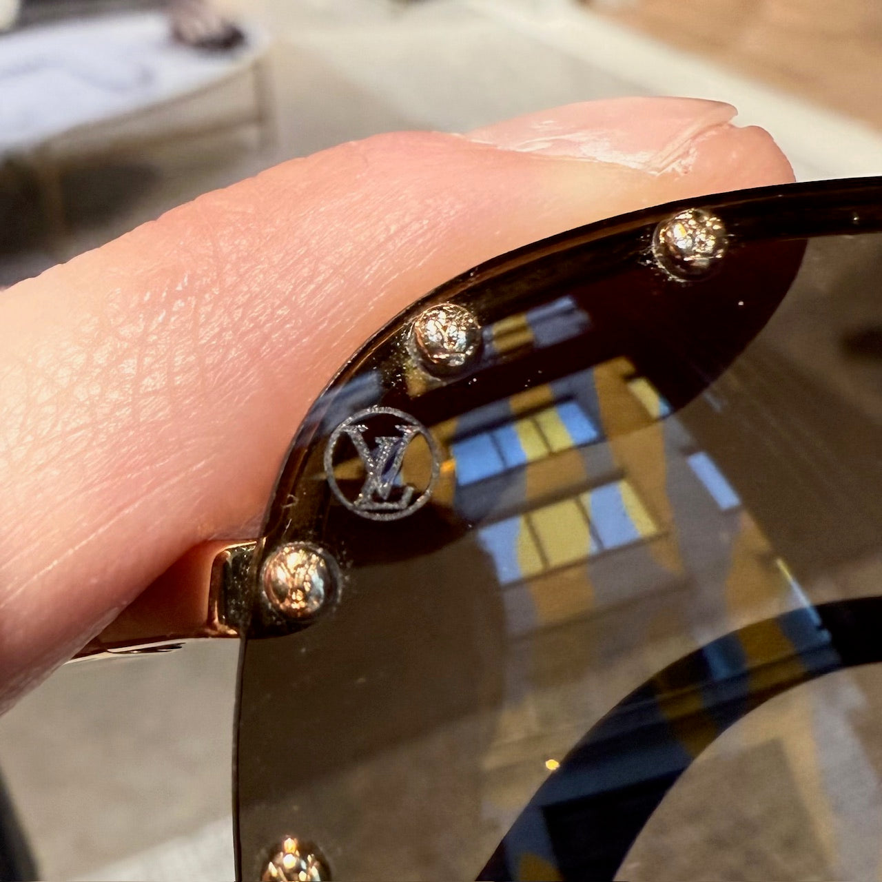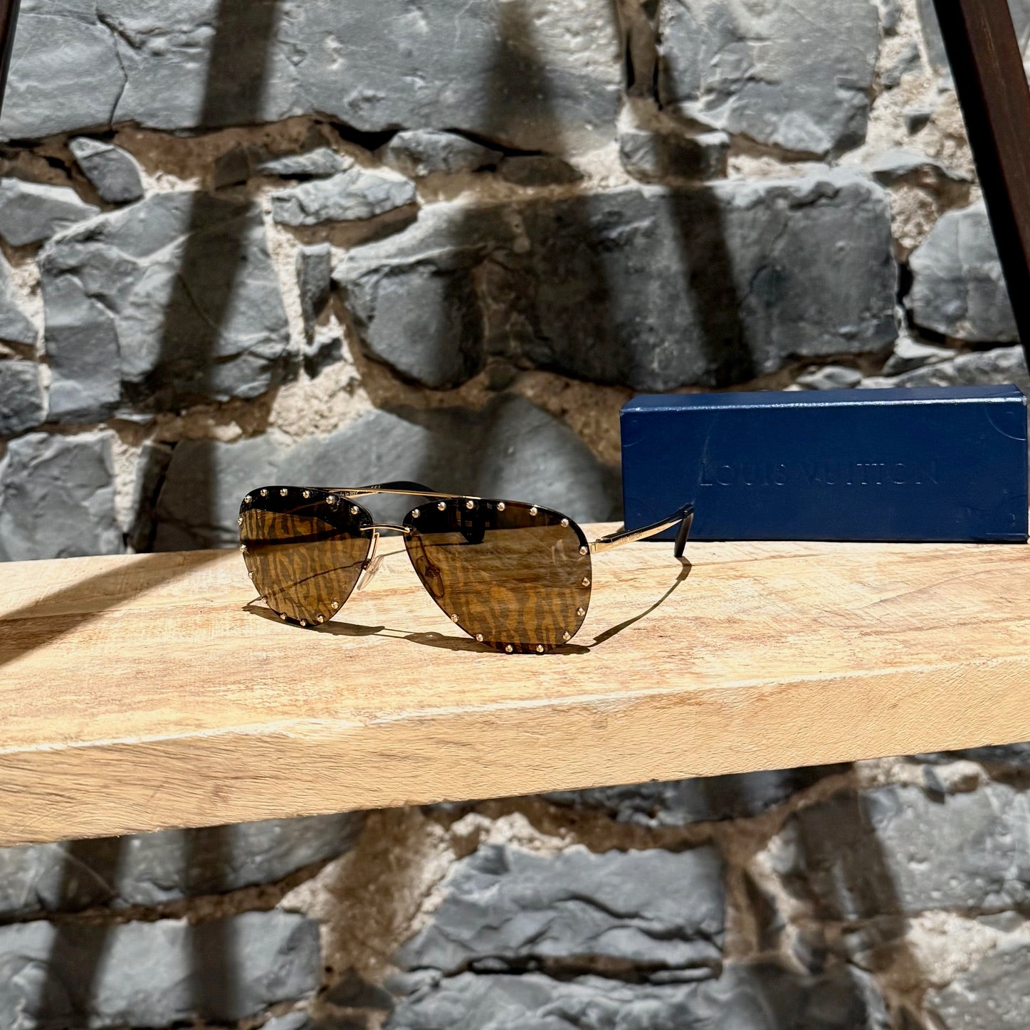 Gold-tone metal aviator frame with dark tinted lenses featuring a tiger print pattern. Small branded gold-tone studs outlining the lenses. Thin metal temples engraved with the Louis Vuitton signature. Double bridge. Clear nose pads with blossom motif. Black rubber insert at branches with LV engraving at tips. LV circle logo on the right lens and at the end of the branch tips. Made in Italy. Come with a case and a dustbag.