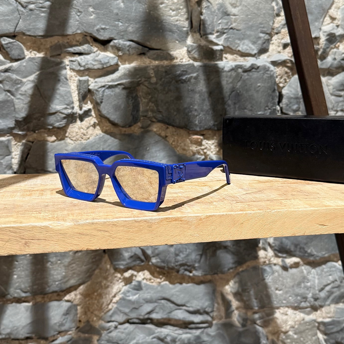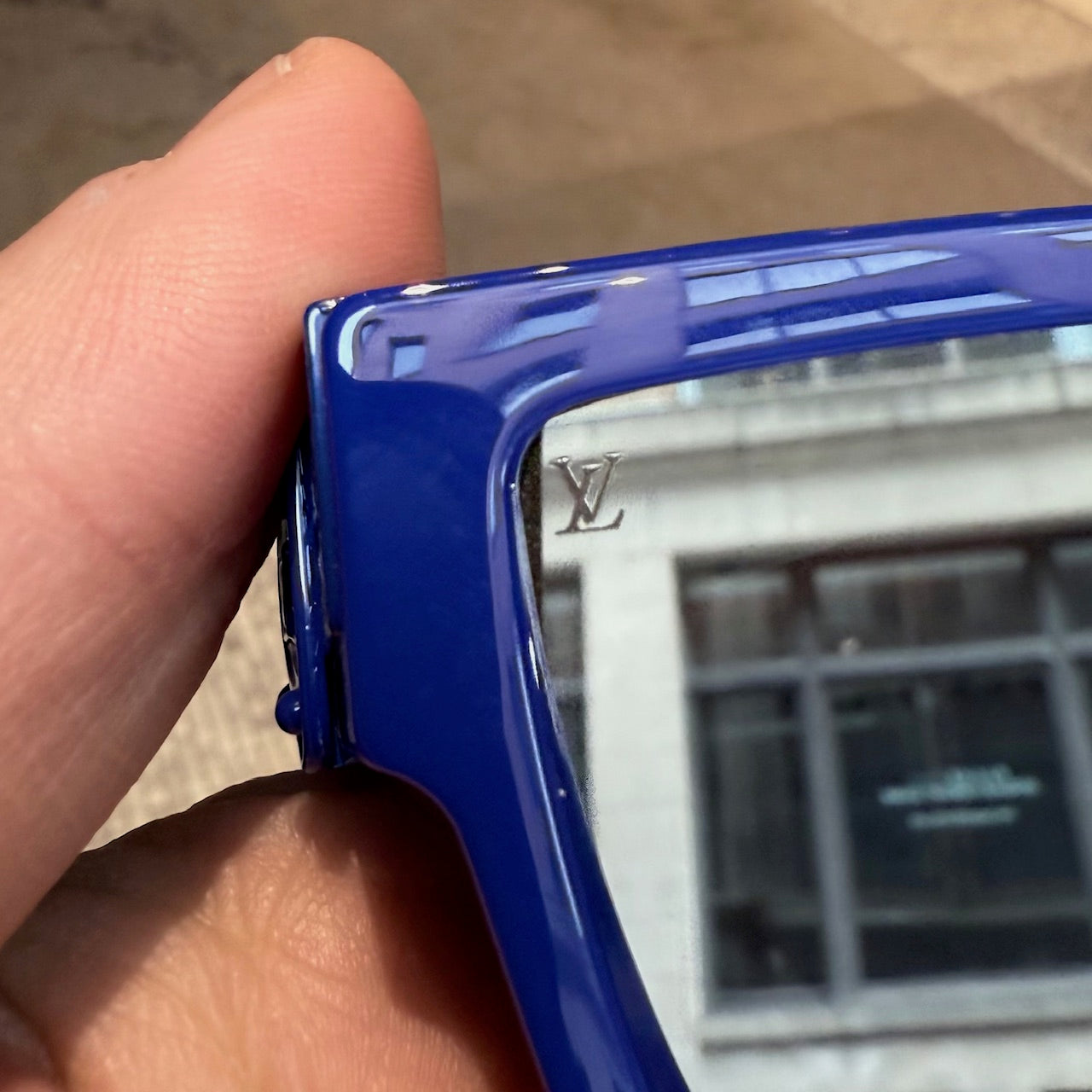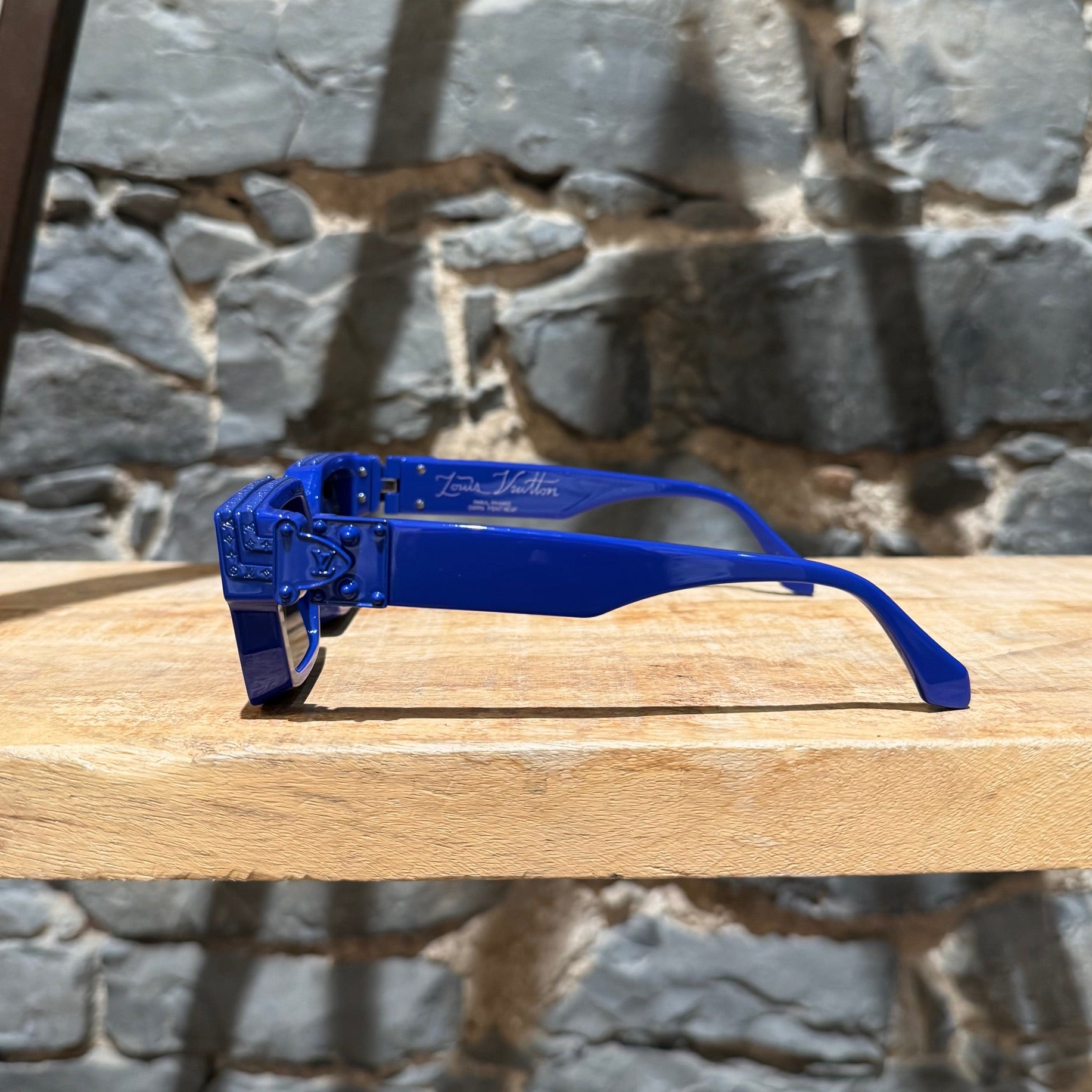Rectangular full-rim frame in glossy cobalt blue acetate. Bold geometric 1.1 Millionaires iconic silhouette. Mirrored lenses with LV logo etched at the corner. Sculpted branches with raised tonal Monogram detailing. S-lock hinges. Flower monogram top rim. Integrated saddle-style nose bridge. Wide branches with engraved interior branding. Made in Italy. Come with Louis Vuitton case and dustbag.