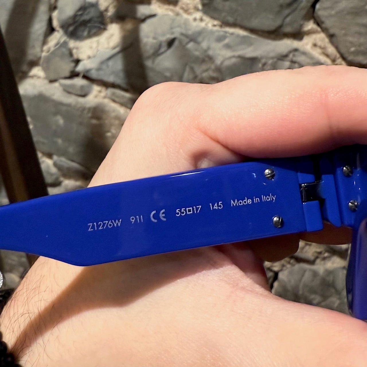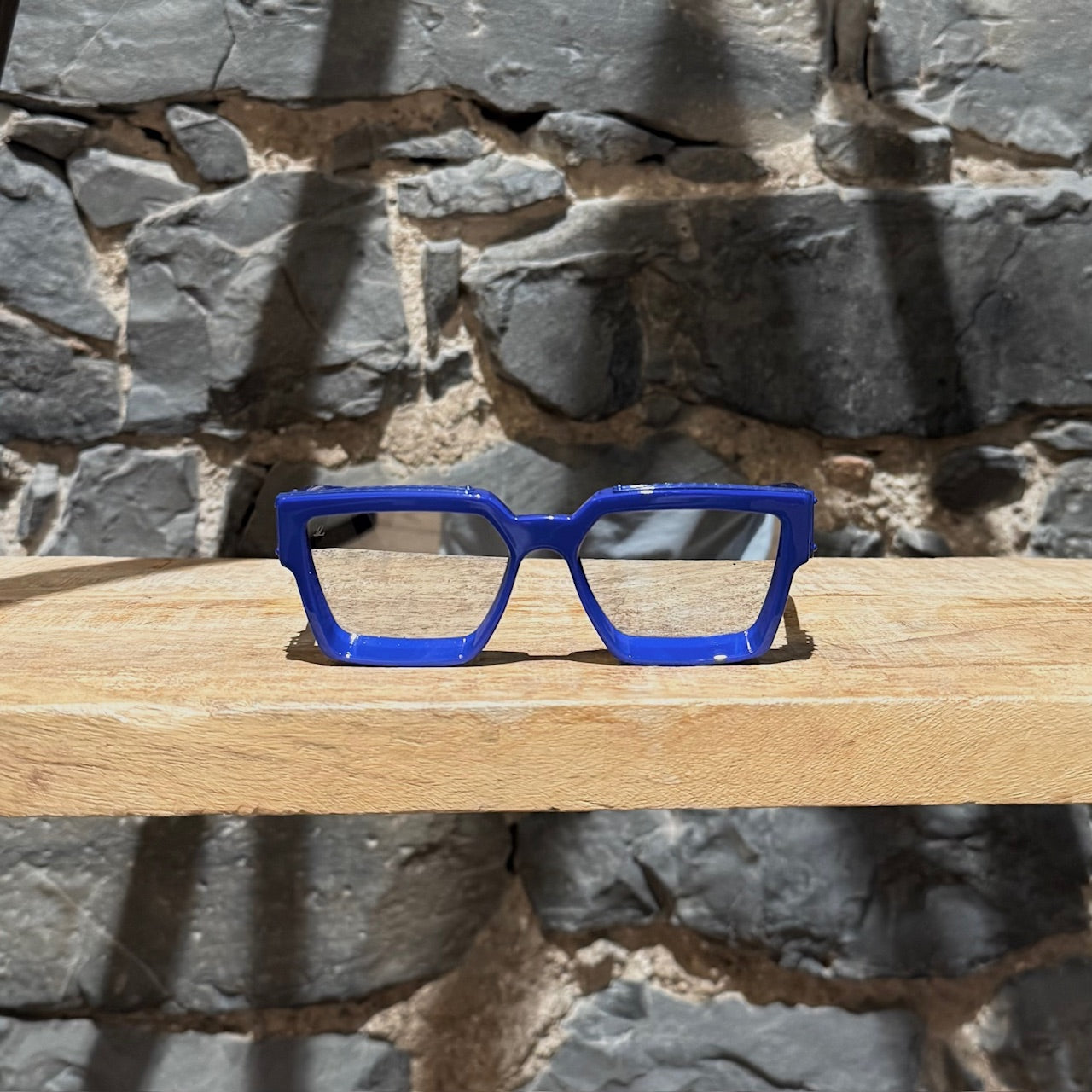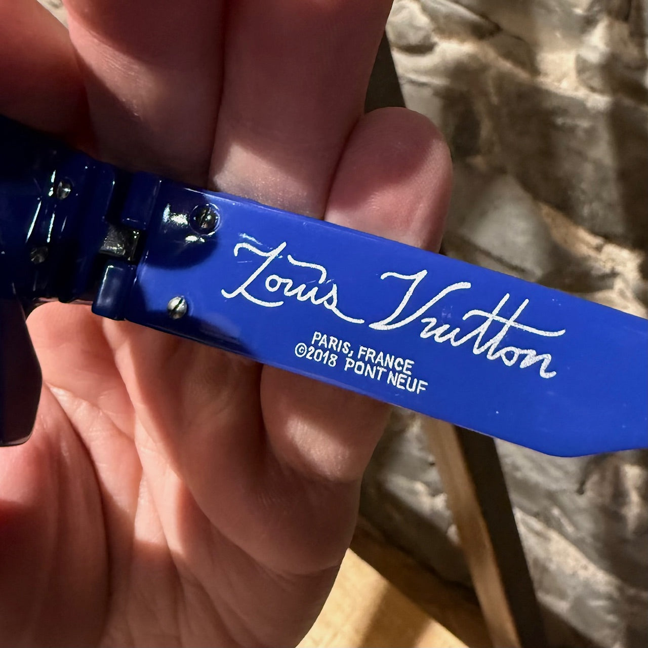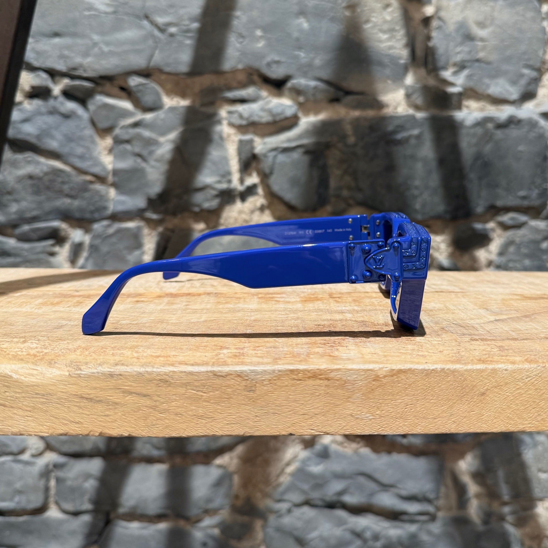 Rectangular full-rim frame in glossy cobalt blue acetate. Bold geometric 1.1 Millionaires iconic silhouette. Mirrored lenses with LV logo etched at the corner. Sculpted branches with raised tonal Monogram detailing. S-lock hinges. Flower monogram top rim. Integrated saddle-style nose bridge. Wide branches with engraved interior branding. Made in Italy. Come with Louis Vuitton case and dustbag.