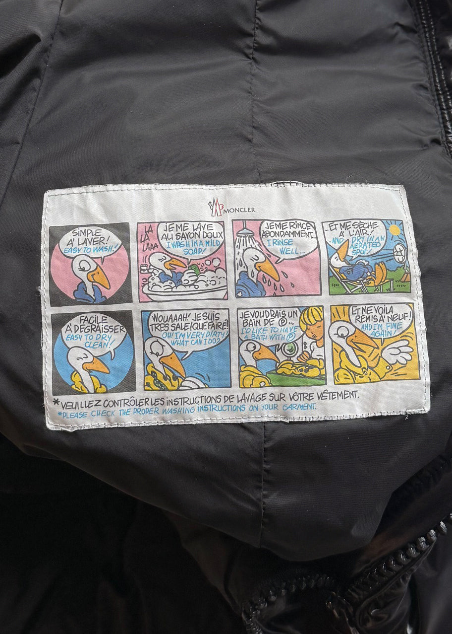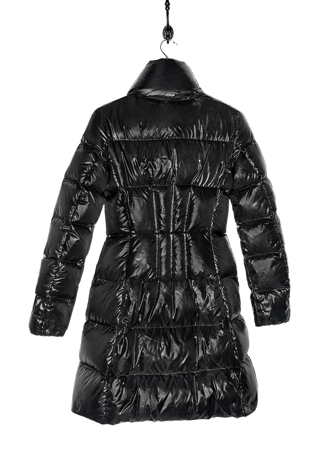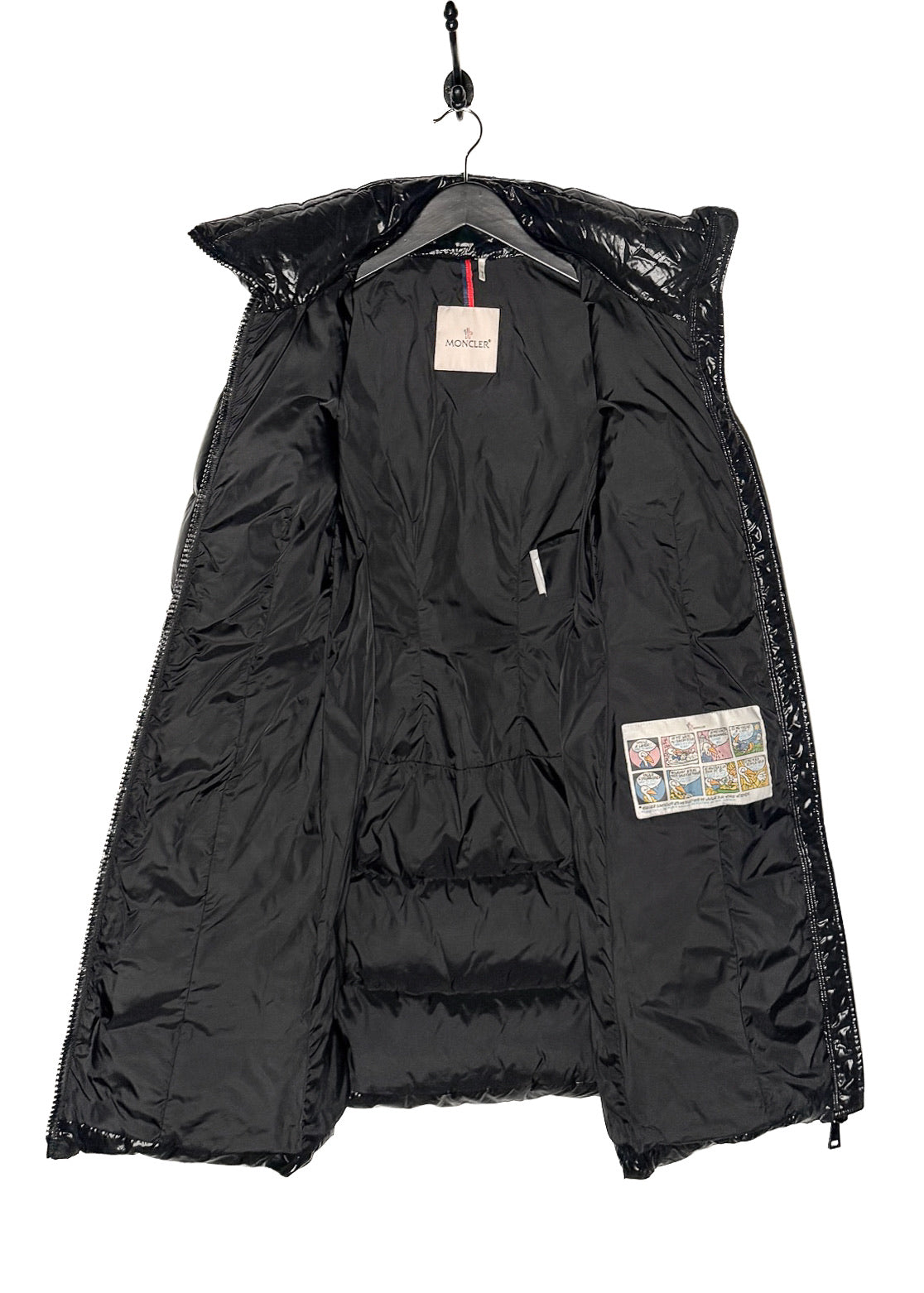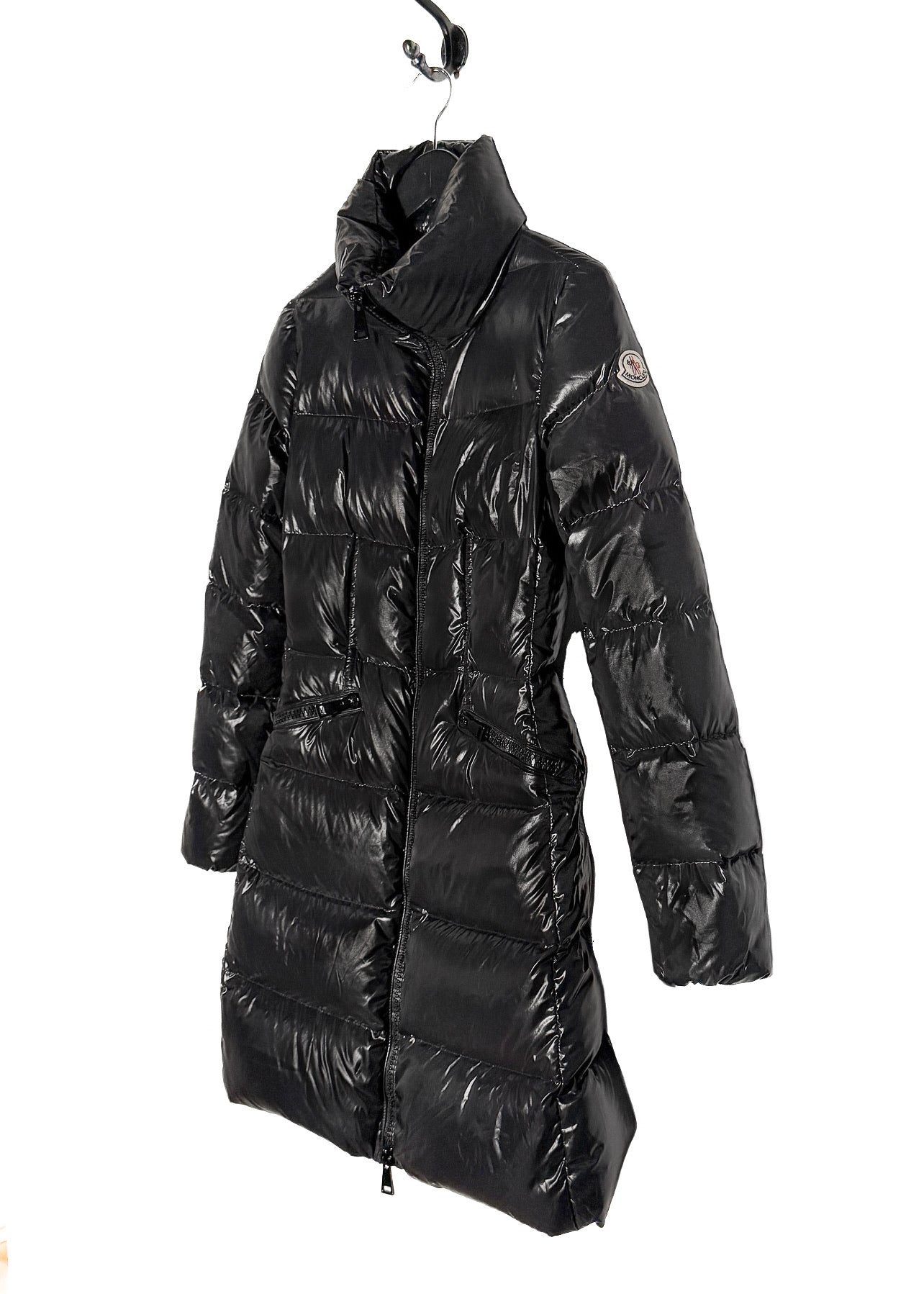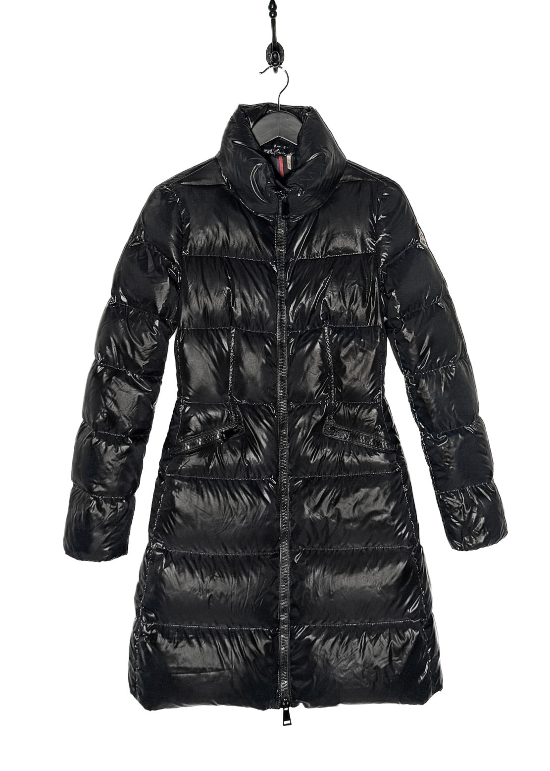Glossy black quilted exterior. Long fitted silhouette. High padded stand collar. Full-length front dual zip closure with metal pull tab. Branded hardware. Cinched waist. Two (2) zippered waist pockets. Long sleeves. Signature Moncler felt logo patch at left arm. Smooth black interior lining with iconic Moncler comic-style care label. Down-filled insulation. Made in Romania.