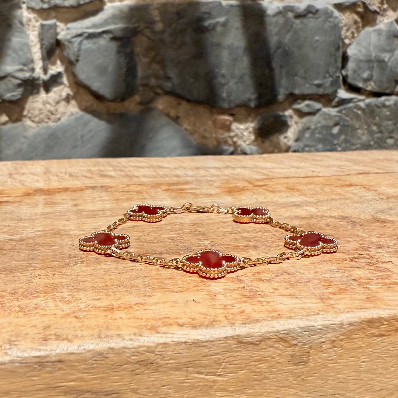 Vintage Alhambra bracelet with five (5) clover-shaped motifs set along a fine gold-tone cable chain. Beaded gold frames with polished red carnelian inlays. Lobster clasp closure with engraved Van Cleef & Arpels hallmark. Stamped Au750. Serial number engraved on the reverse of a motif. Made in France. Comes with a presentation box.
