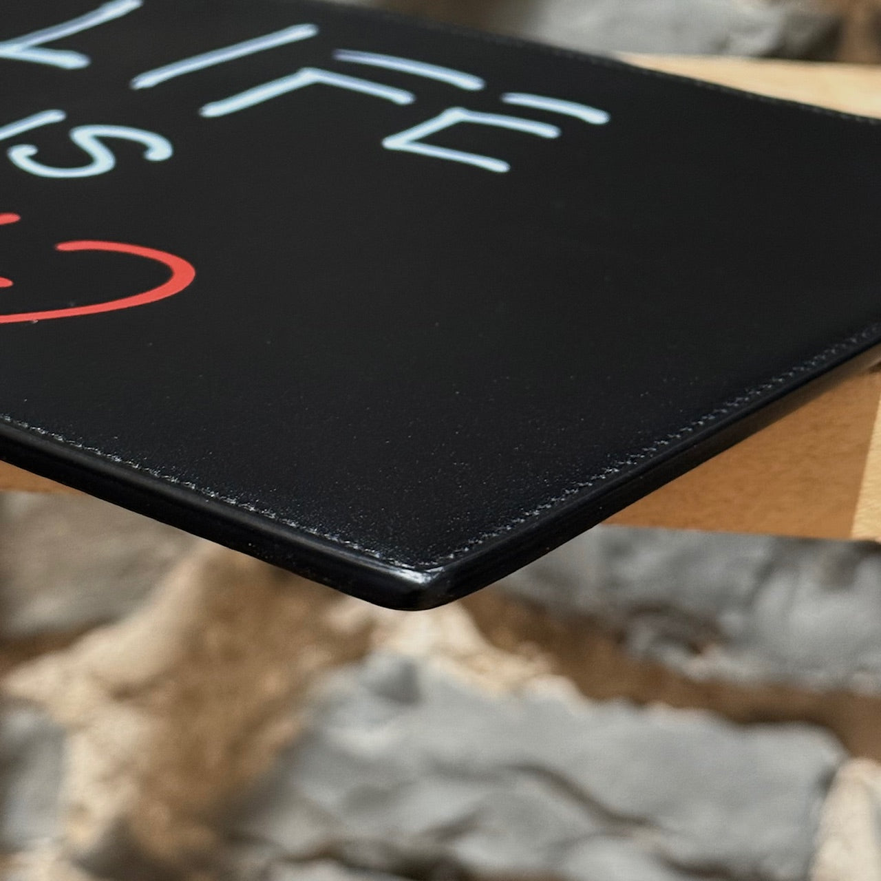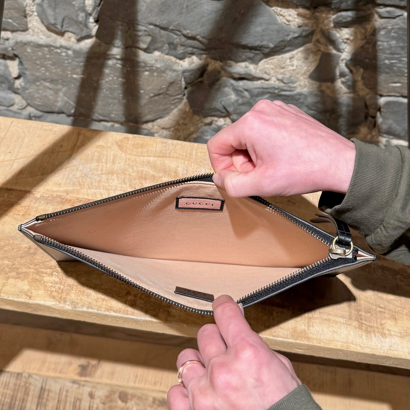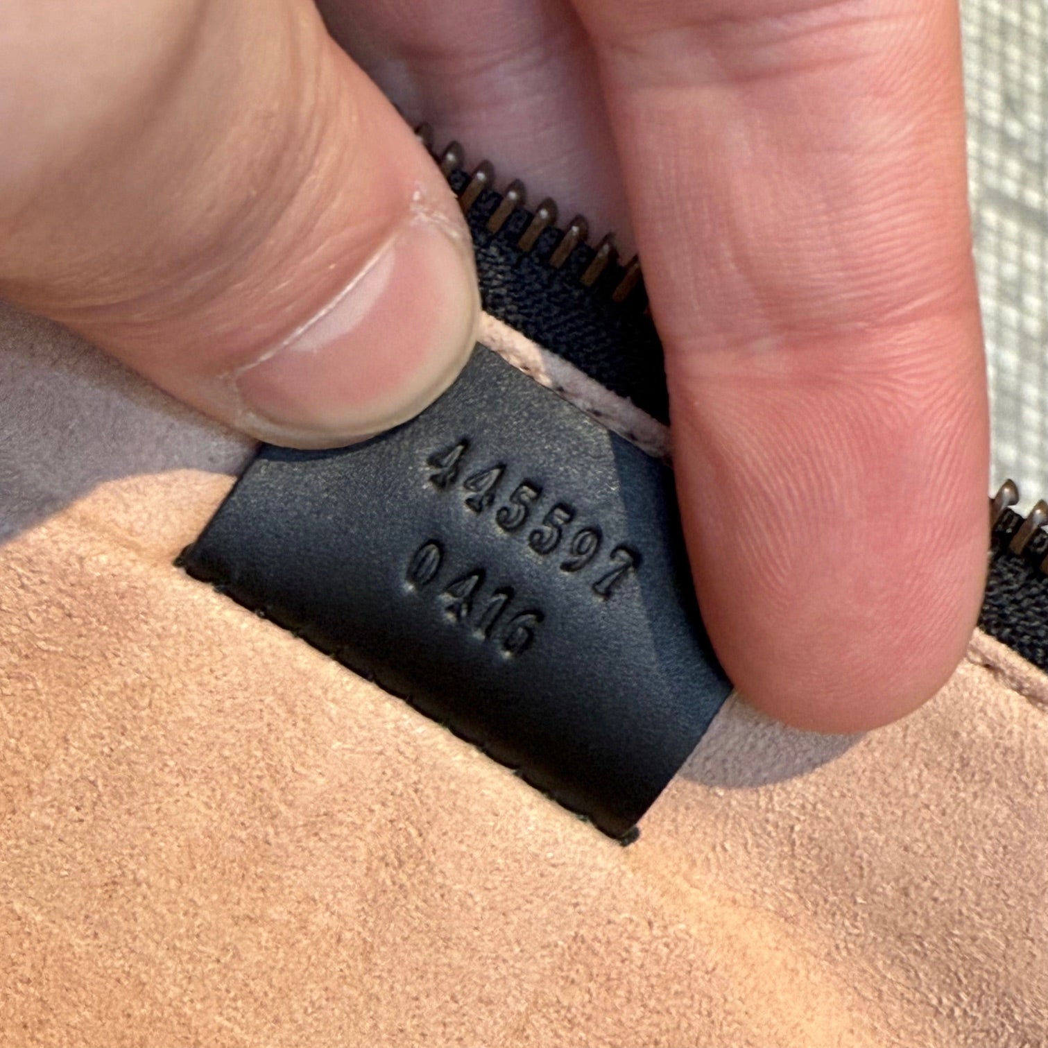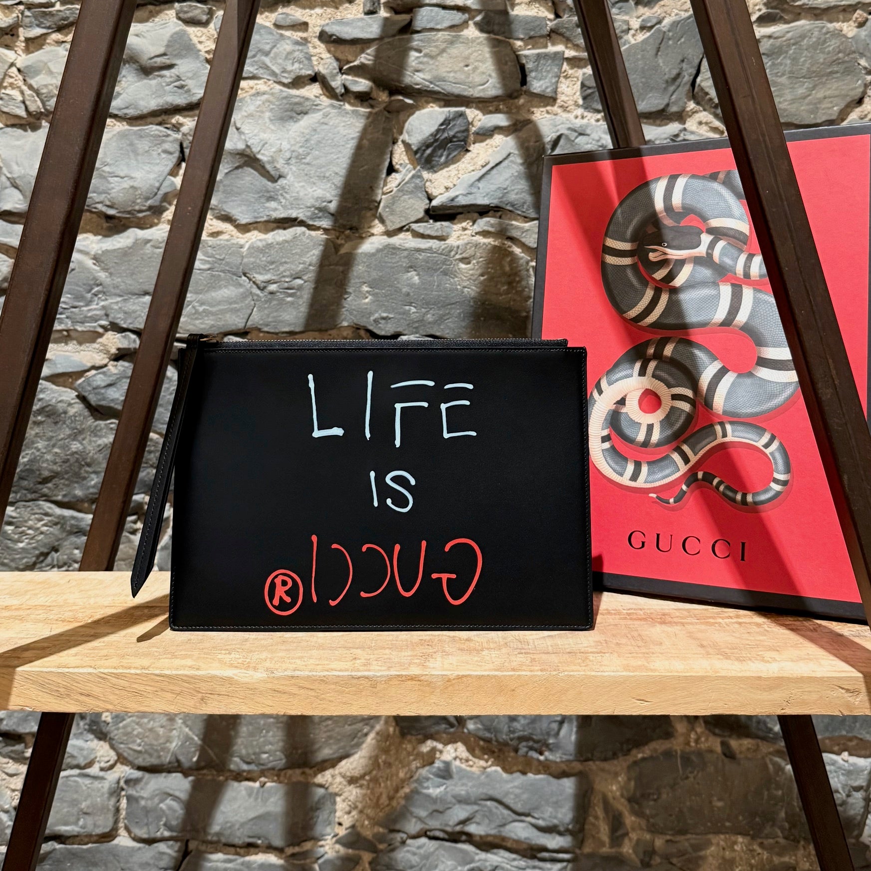 Fall/Winter 2016. Gold-tone hardware. Top zip closure. Pale blue and red "Life is Gucci" print at front. Gucci embossed logo at the back bottom. Long leather tab. Pale pink suede lining. Made in Italy. Comes with the original box and dustbag.