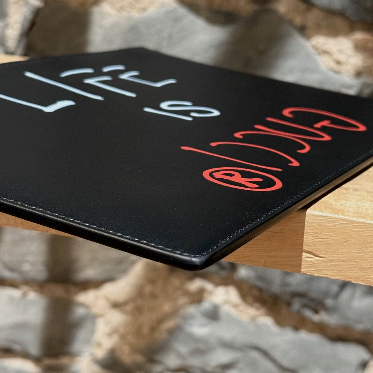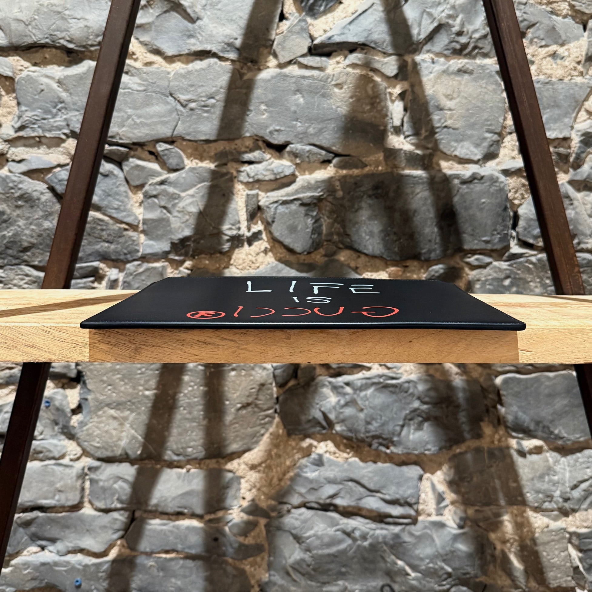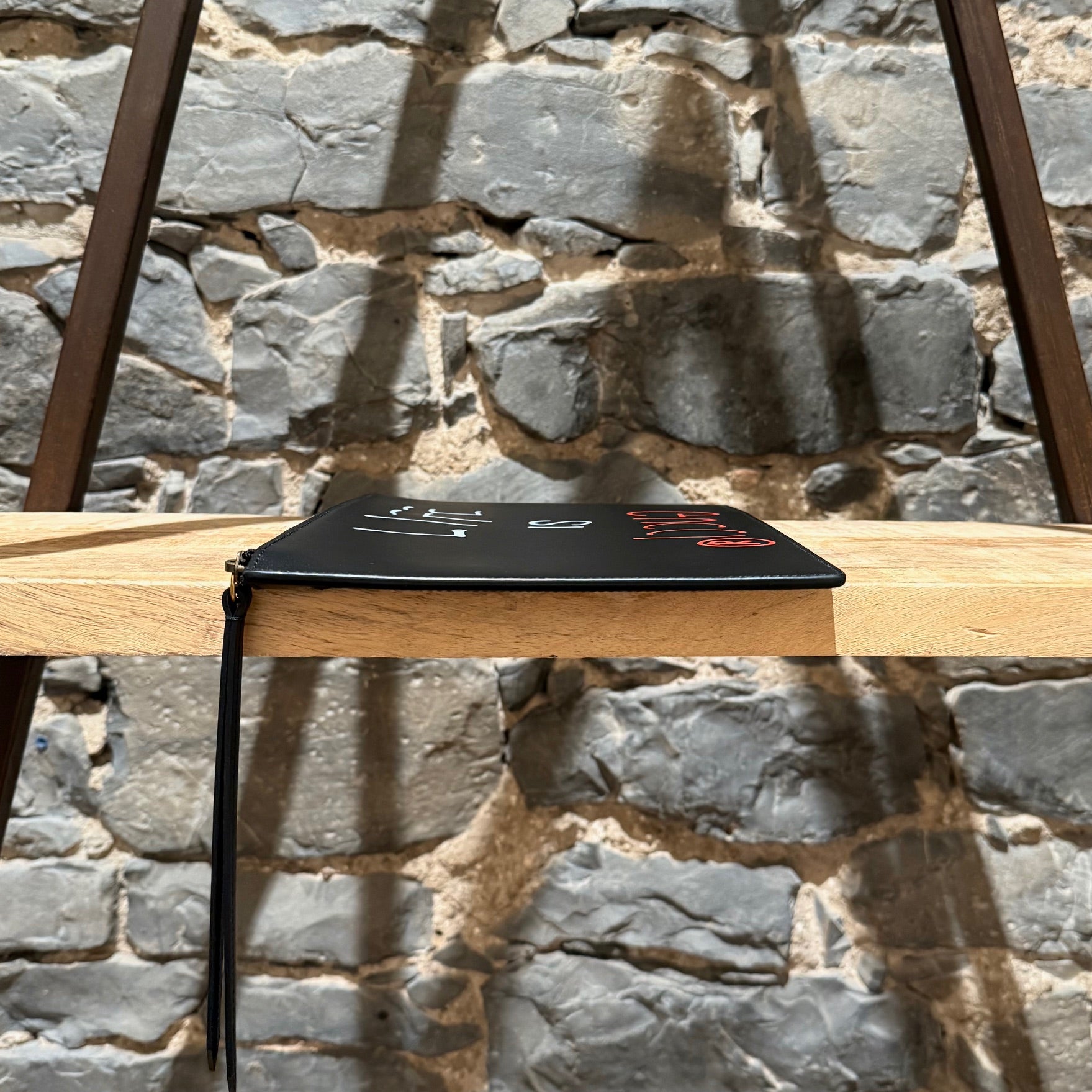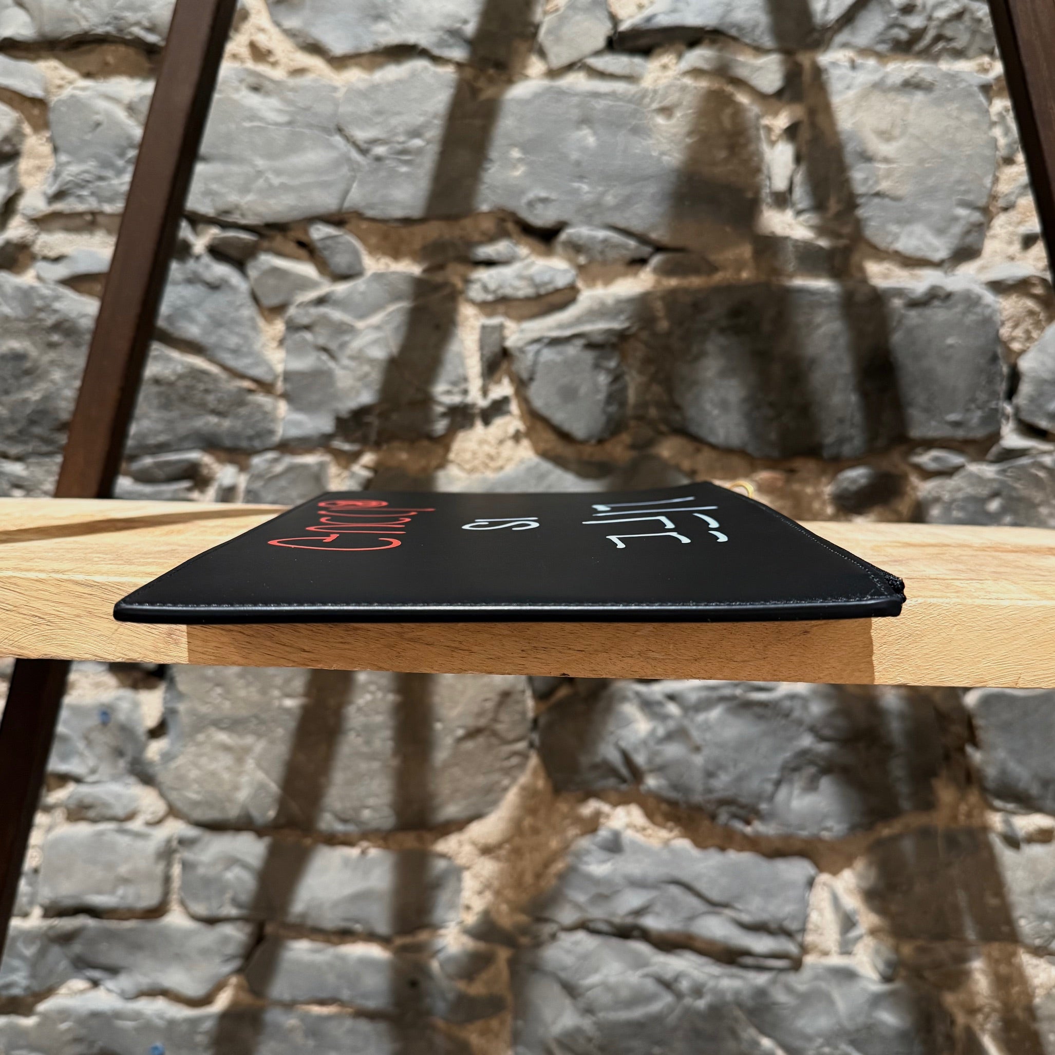 Fall/Winter 2016. Gold-tone hardware. Top zip closure. Pale blue and red "Life is Gucci" print at front. Gucci embossed logo at the back bottom. Long leather tab. Pale pink suede lining. Made in Italy. Comes with the original box and dustbag.