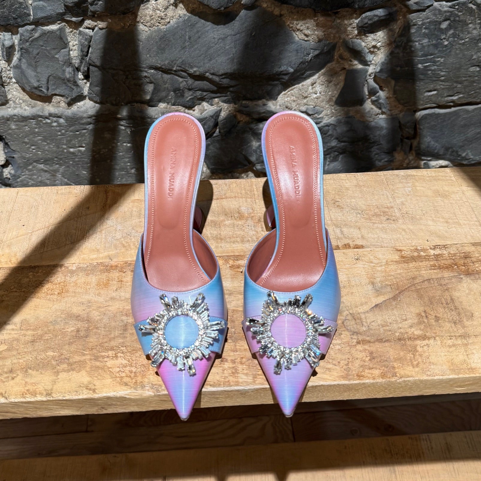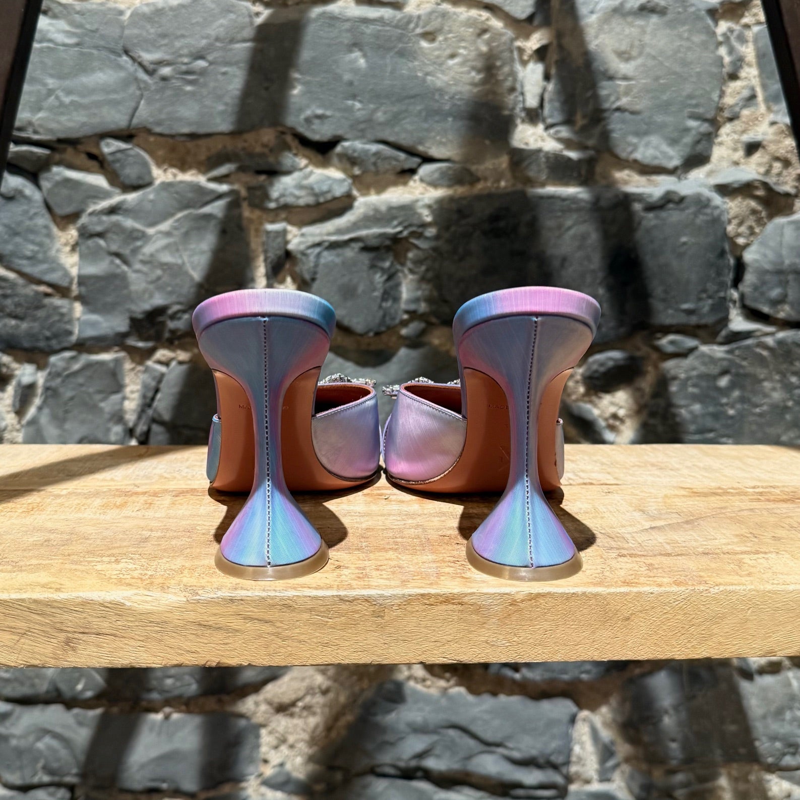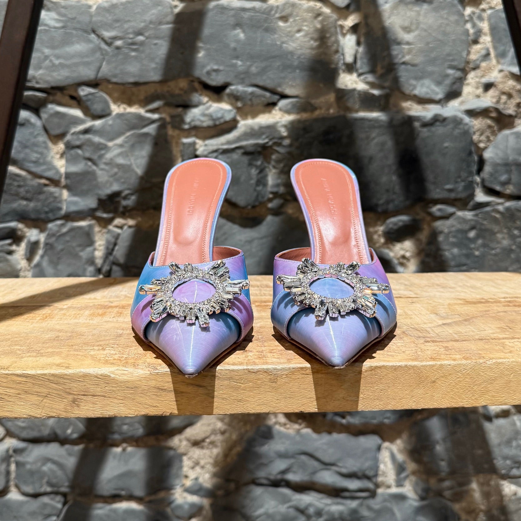 Pointed-toe slip-on mules from the Begum line. Iridescent blue and lilac fabric upper. Flared heel. Crystal-embellished sunburst brooch at front. Leather lining, insole and outsole. Made in Italy. Come as is.