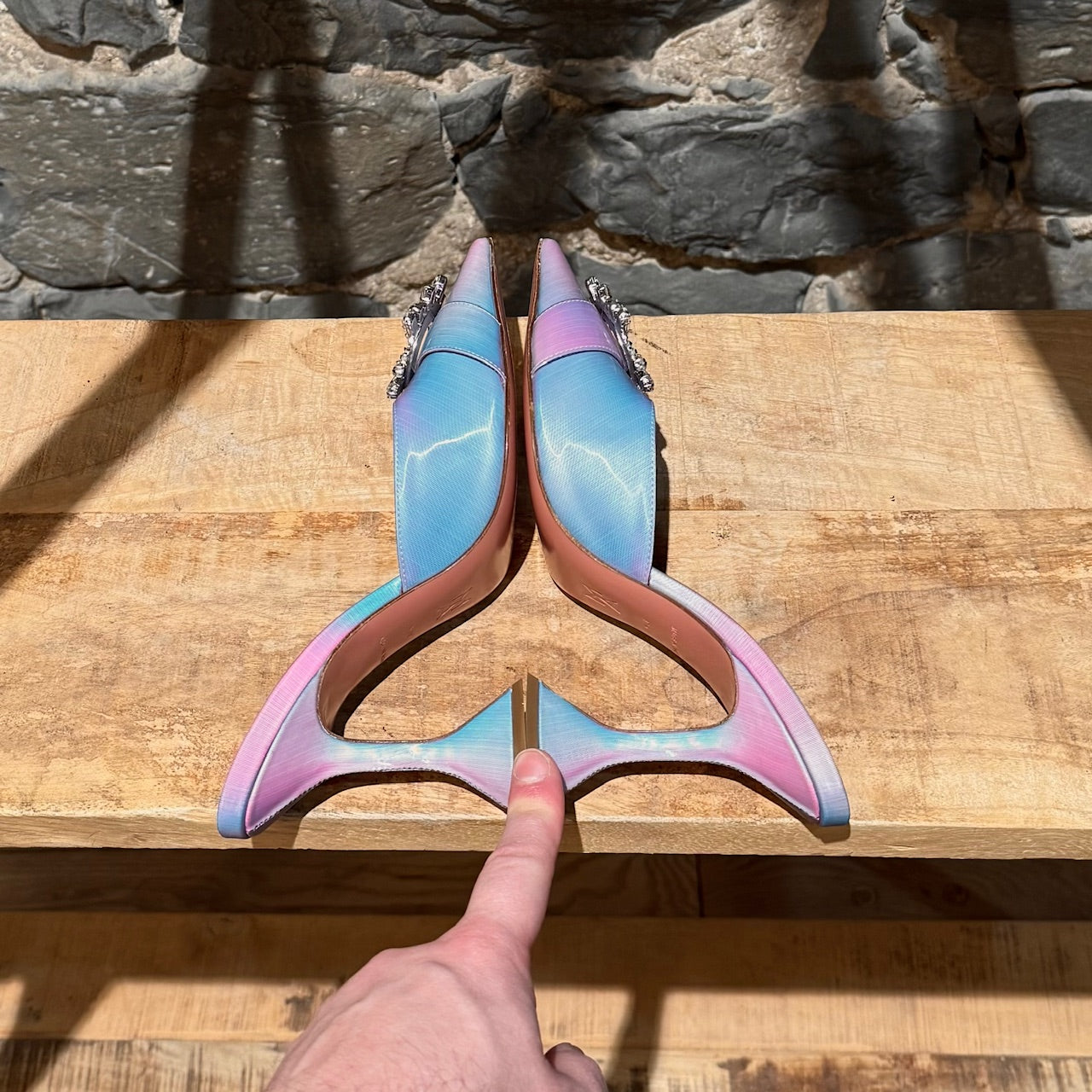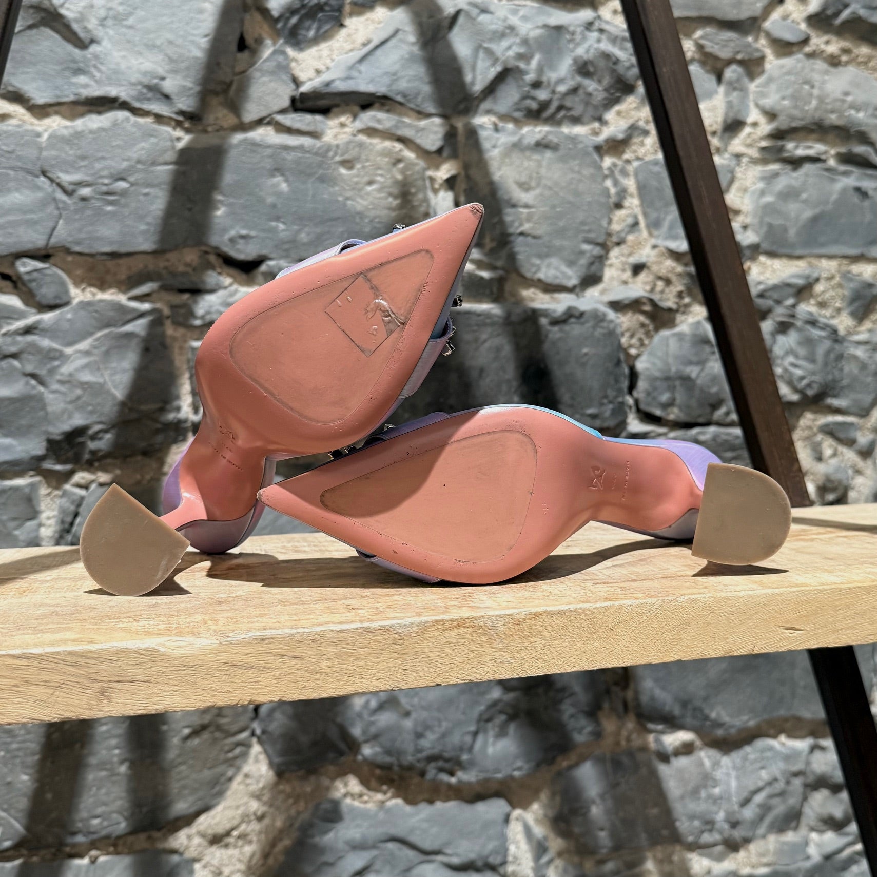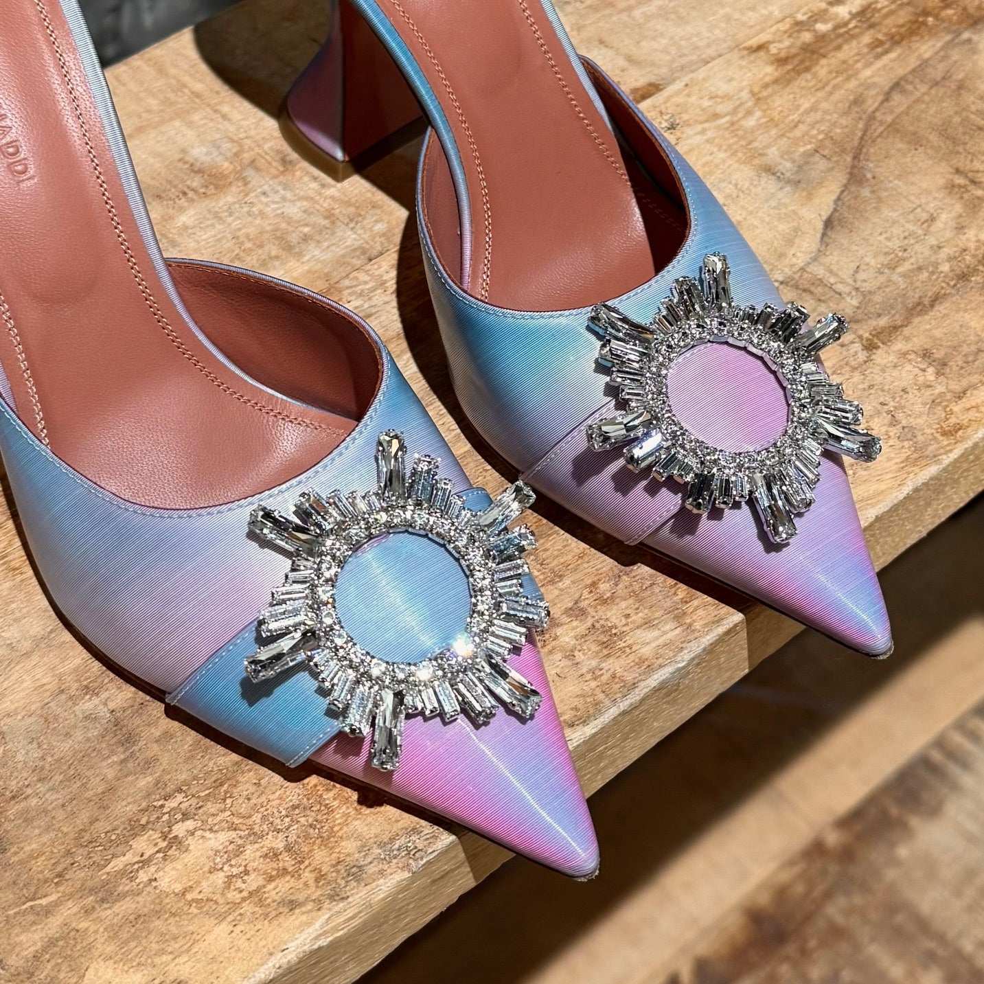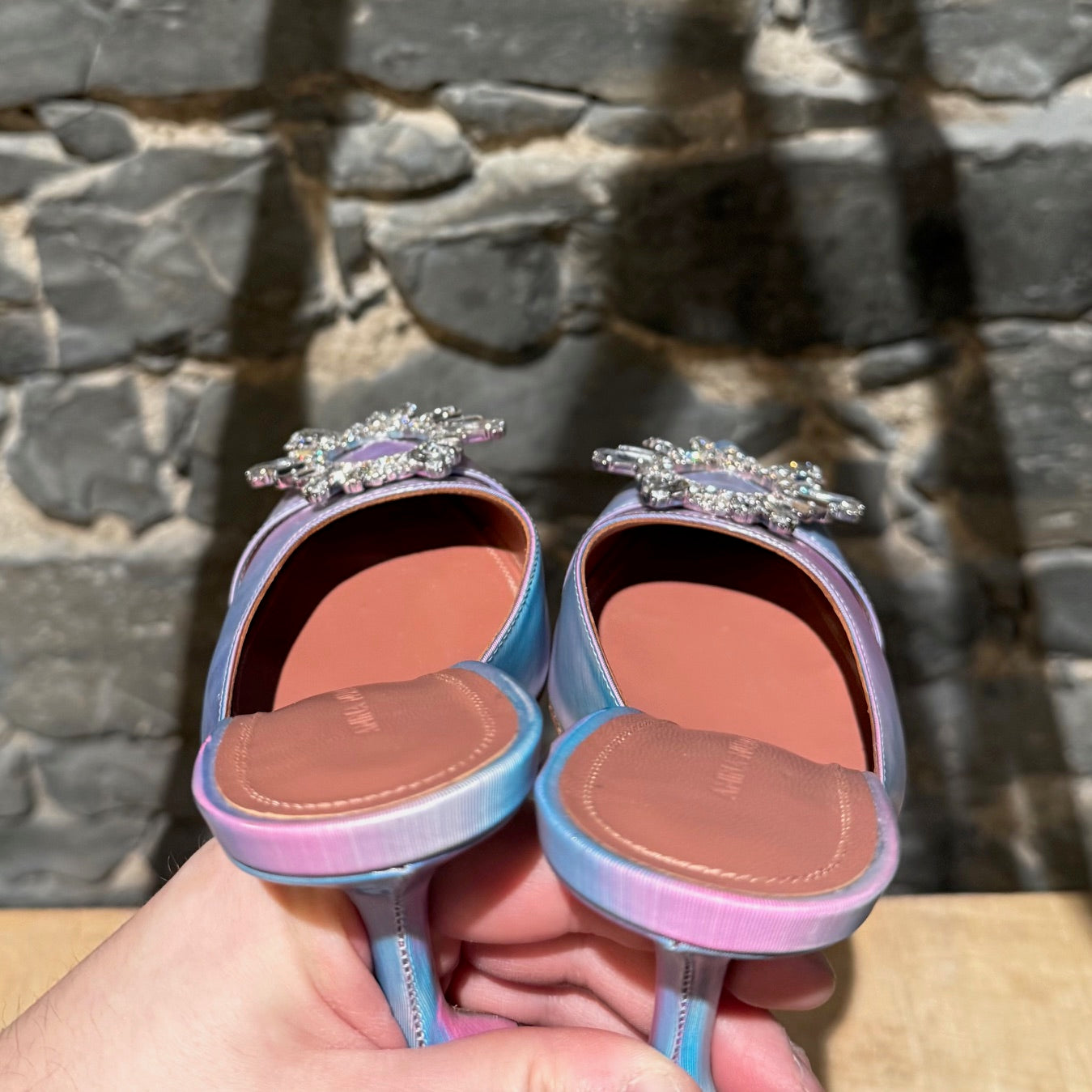 Pointed-toe slip-on mules from the Begum line. Iridescent blue and lilac fabric upper. Flared heel. Crystal-embellished sunburst brooch at front. Leather lining, insole and outsole. Made in Italy. Come as is.