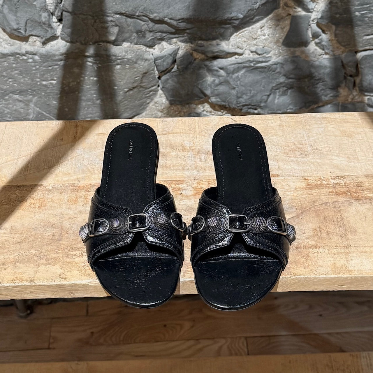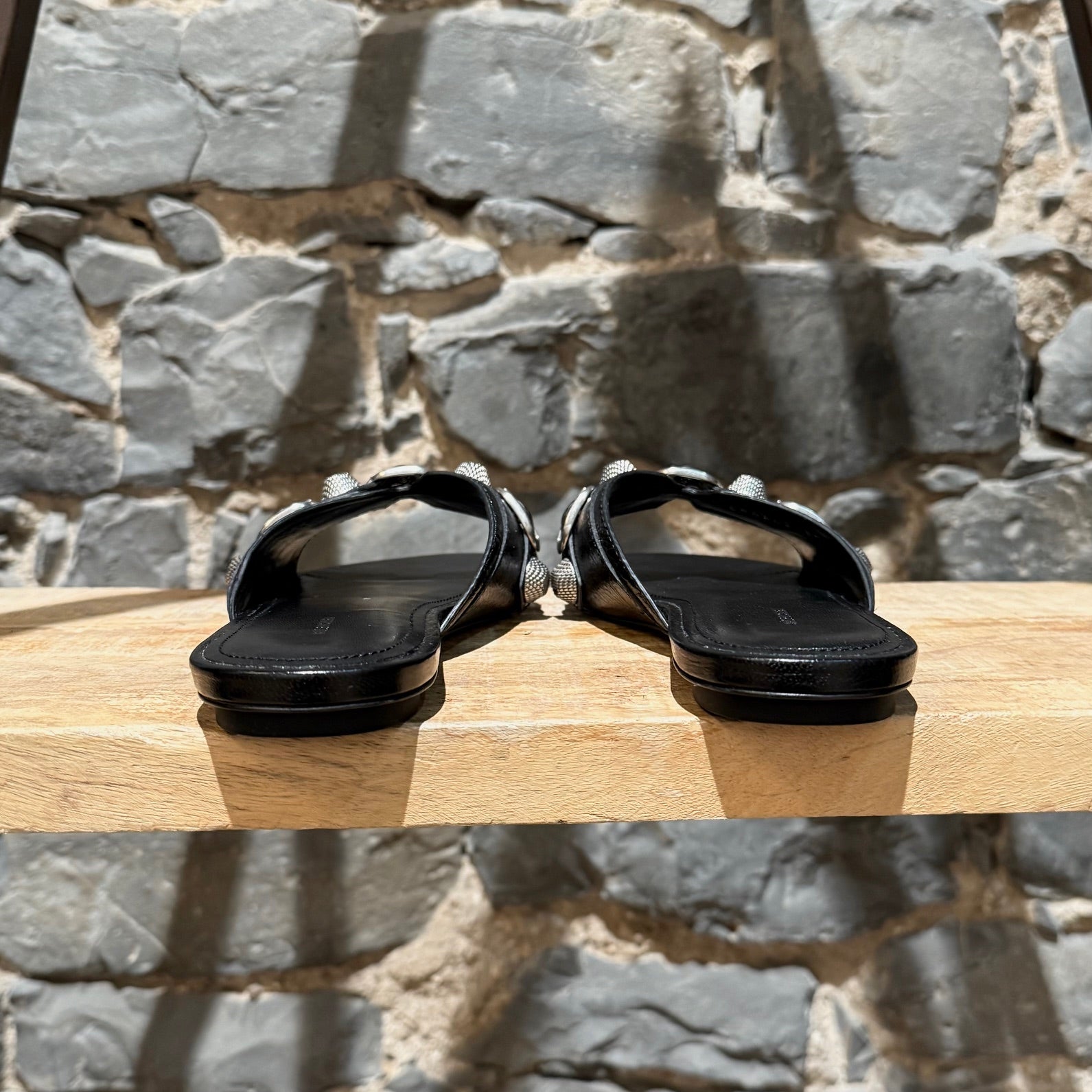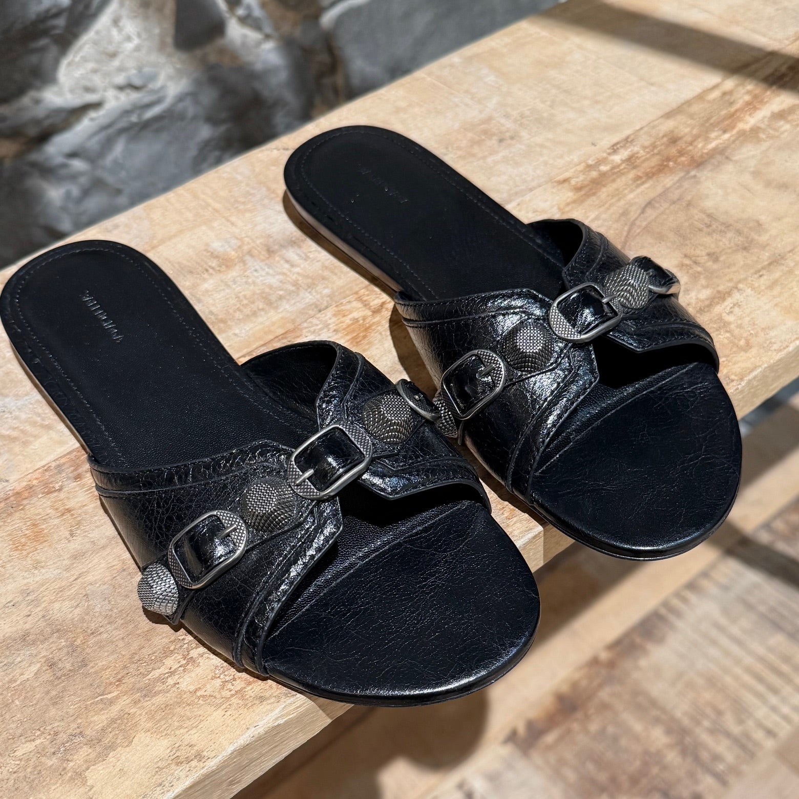 Flat slide open toe design. Black textured lambskin leather upper. Wide front strap with aged silver-tone studs and buckle hardware. Smooth padded leather insole. Low flat leather sole with BB rubber heel insert. Made in Italy. Come as is.