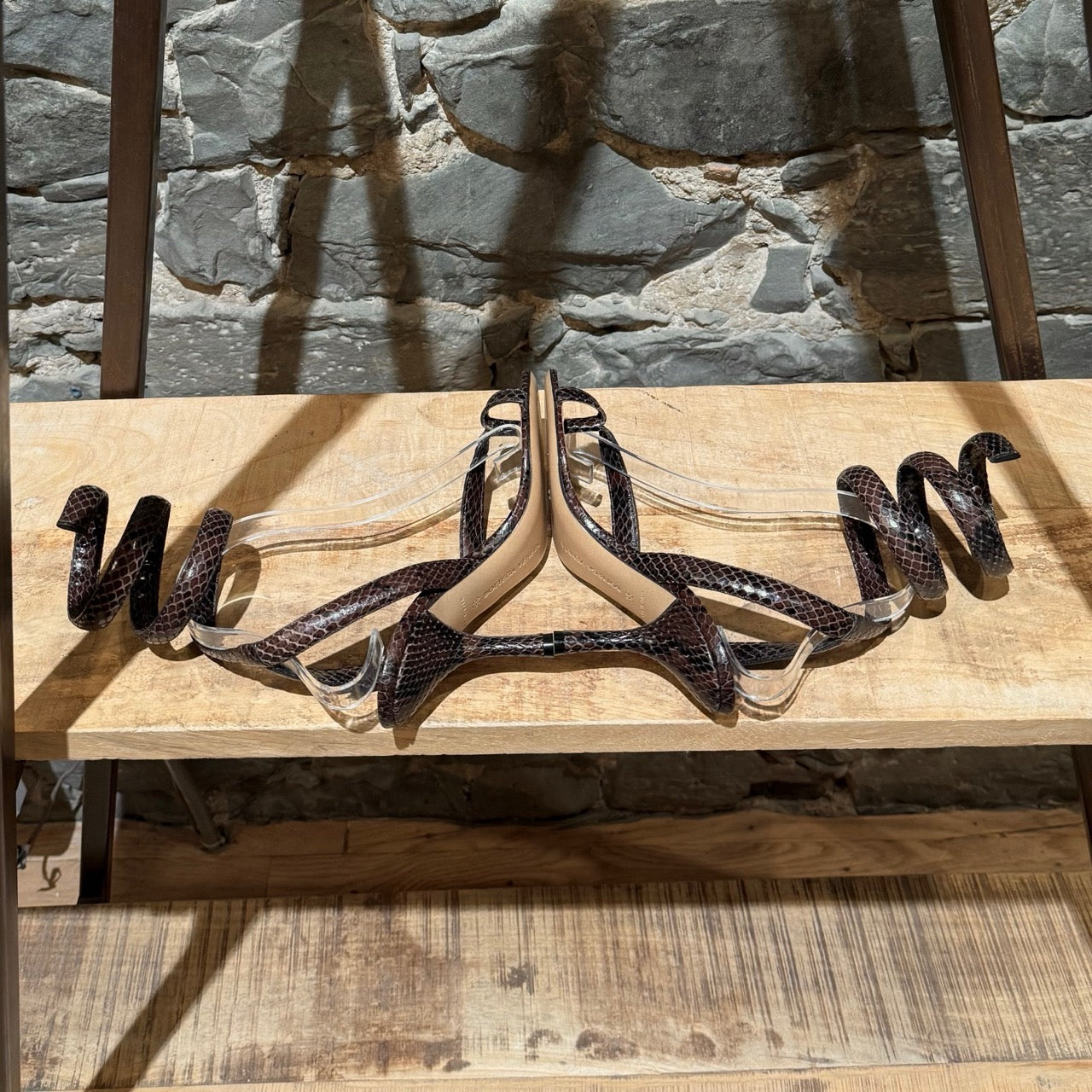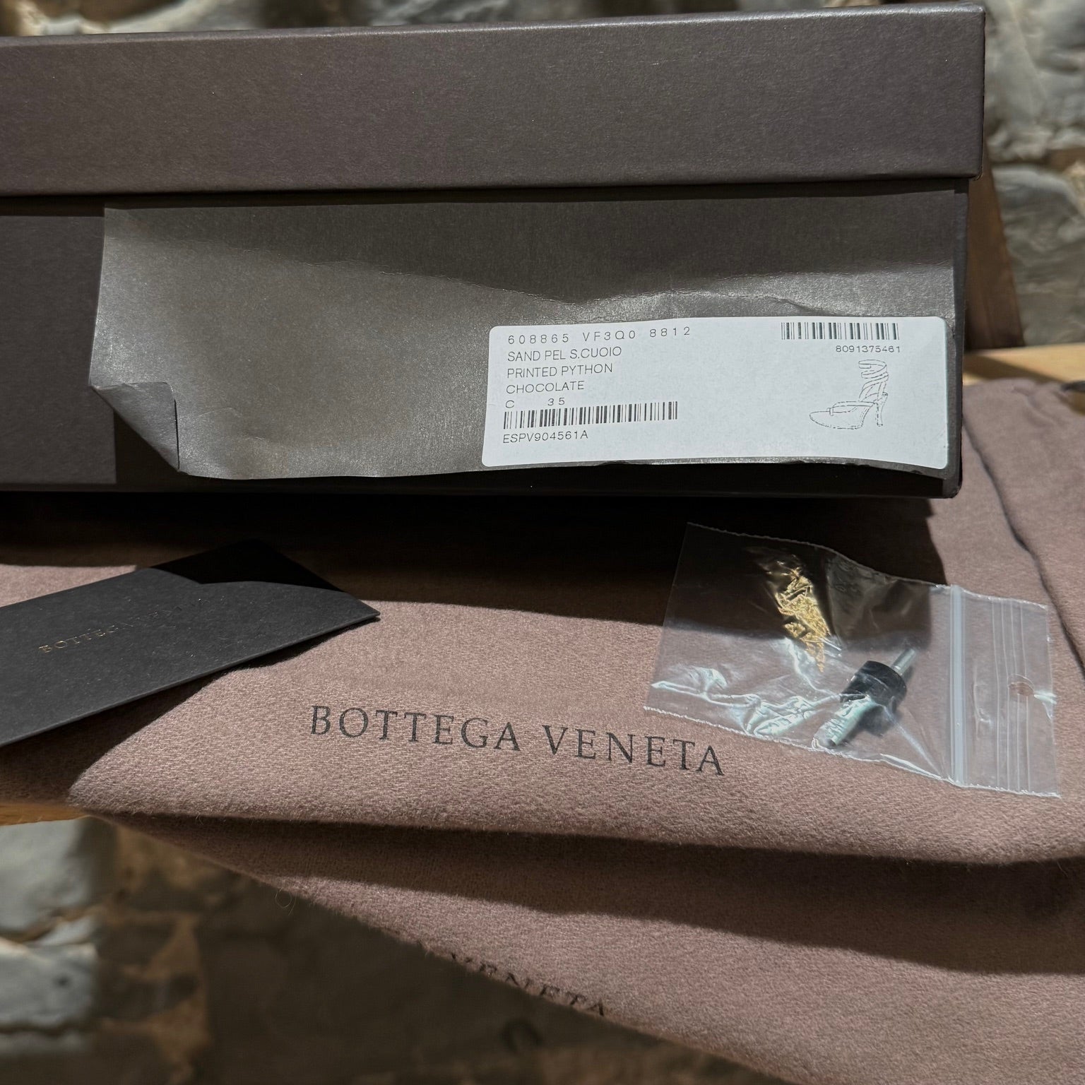 Bottega Veneta Brown Python Embossed The Spiral Heeled Sandals. Brown leather embossed with a python print. Spiral ankle wrap that coils up the leg. Thong-style front strap and slim stiletto heel. Stamped leather outsole and embossed insole branding. Made in Italy. Comes with original box, branded dustbag, product card, and replacement heel tips.
