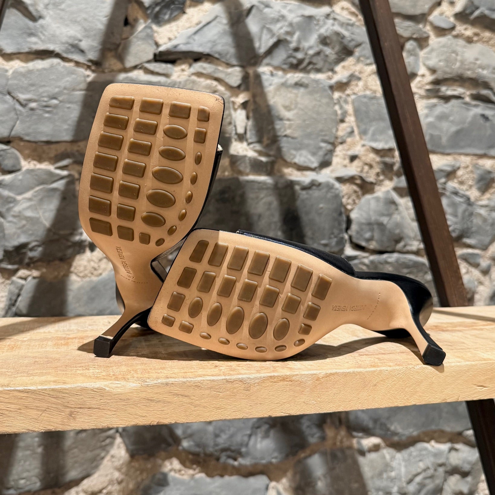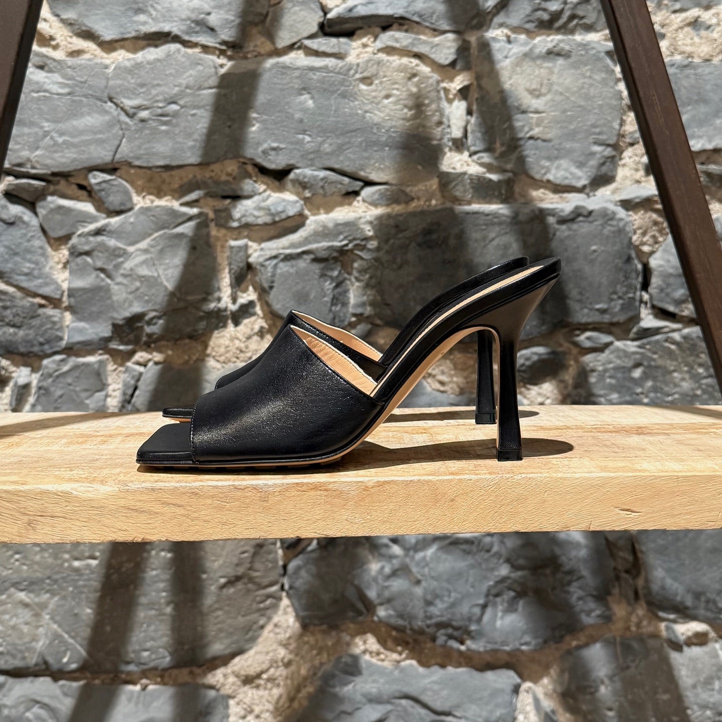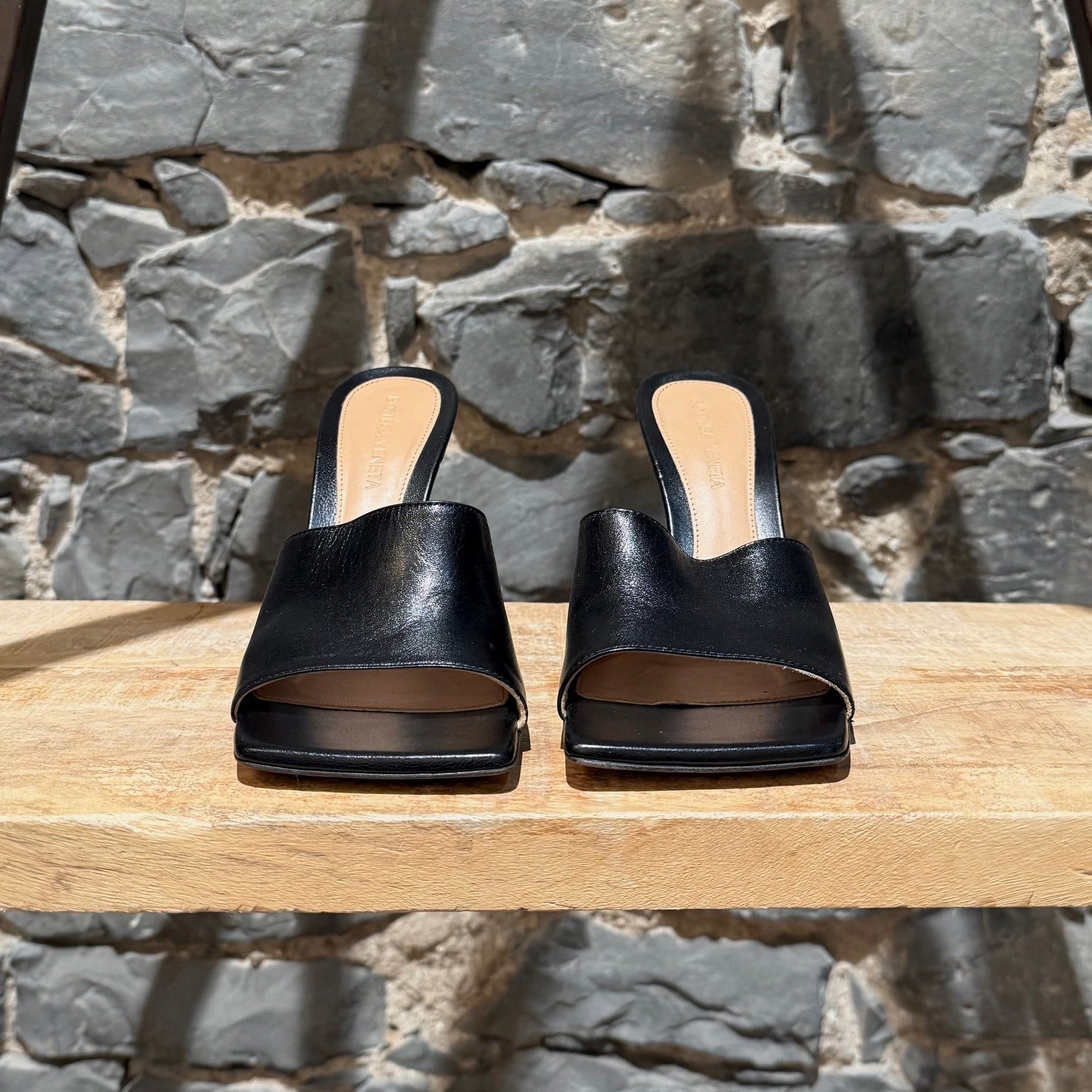 Slip-on mule design. Smooth black leather upper. Square open toe. Single wide vamp strap. Open back design. Slim high heel. Beige leather insole. Leather outsole with rubber grip inserts. Made in Italy. Come as is.