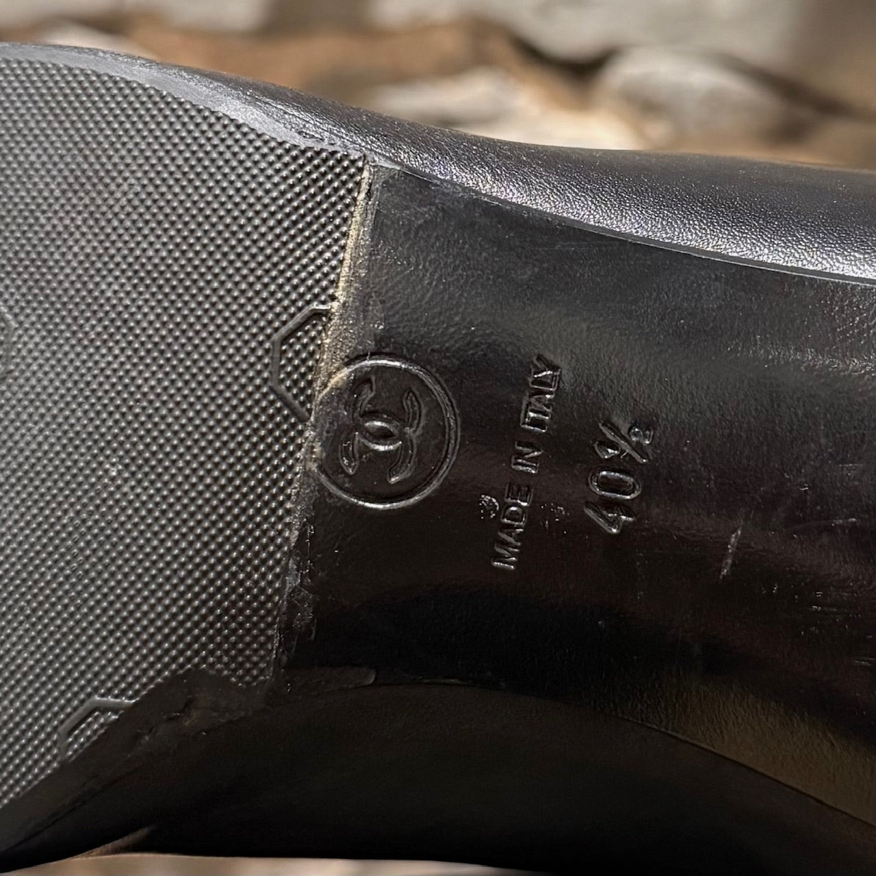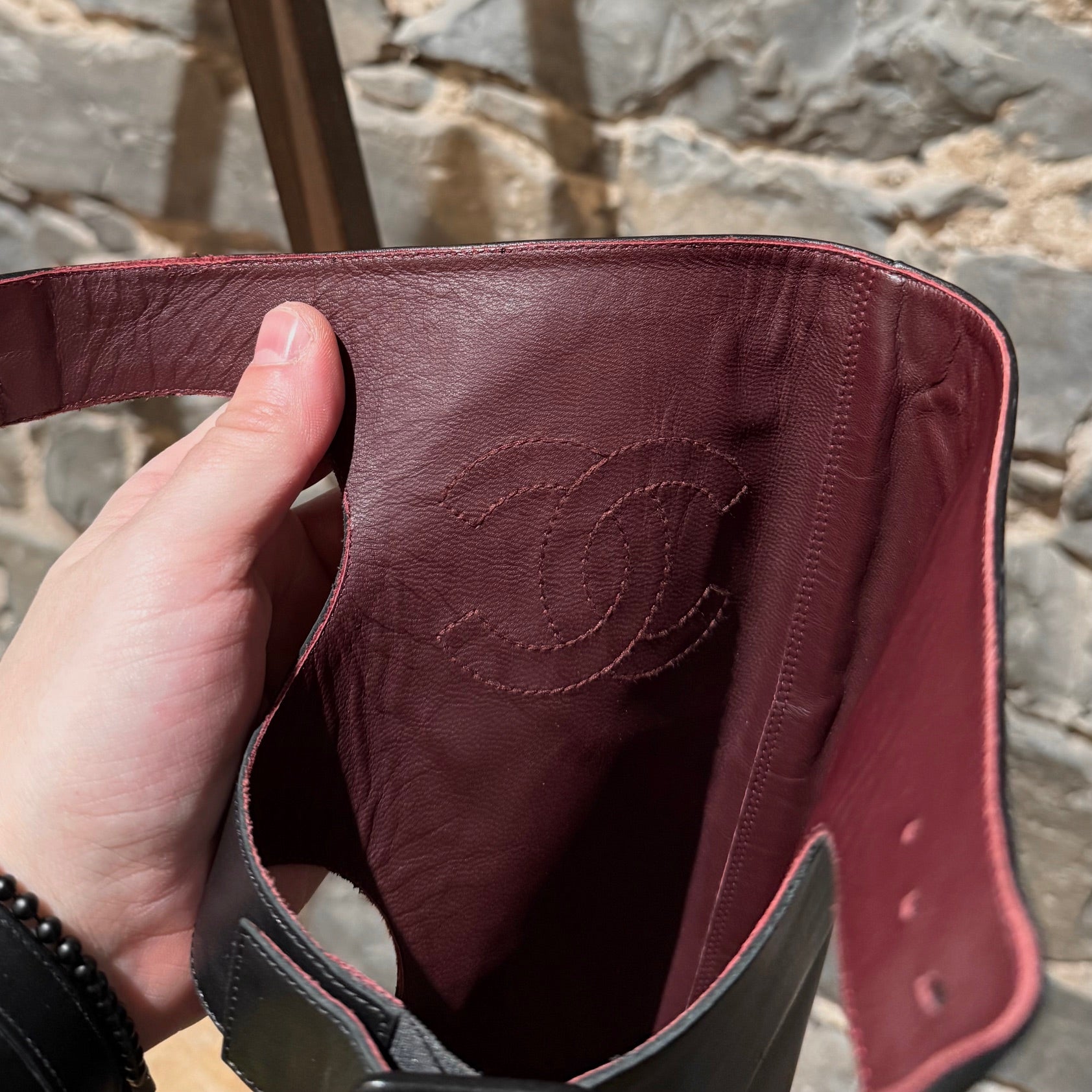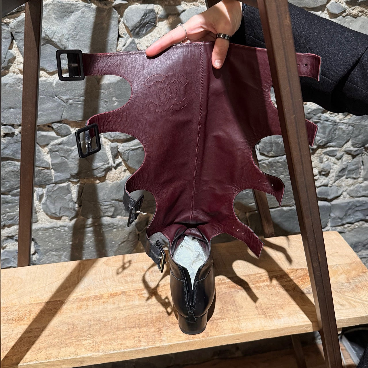 Smooth black calfskin leather with a structured knee-high silhouette. Cut-out panels along the shaft with four (4) adjustable buckle straps. Tonal stitched CC at first straps. Back zip closure with leather pulls. Almond-shaped patent leather cap toe. Low block heel. Lined in burgundy leather embossed with the Chanel logo. Leather outsoles and insoles. Made in Italy. Come with Chanel dustbags.