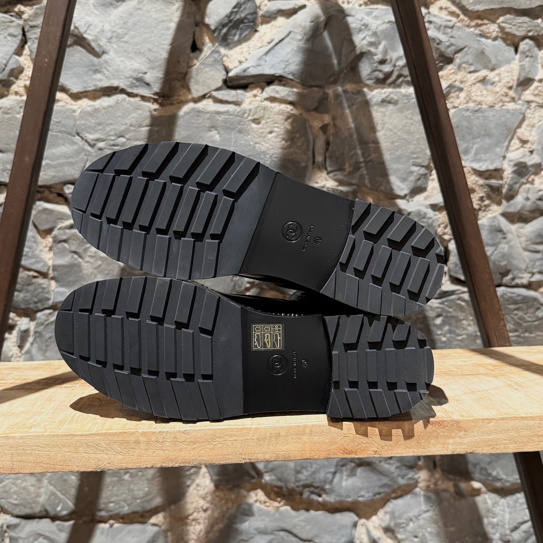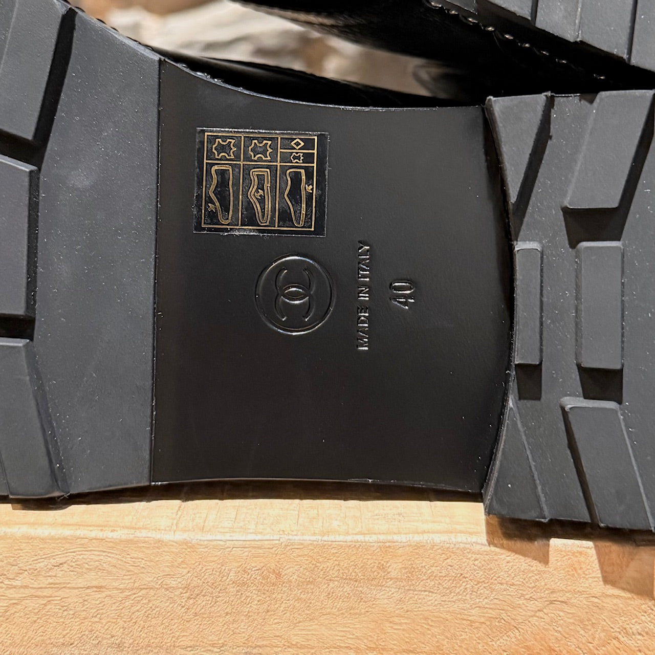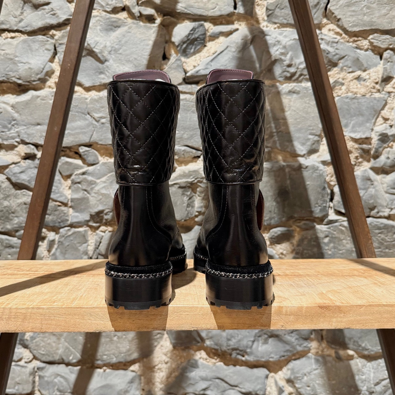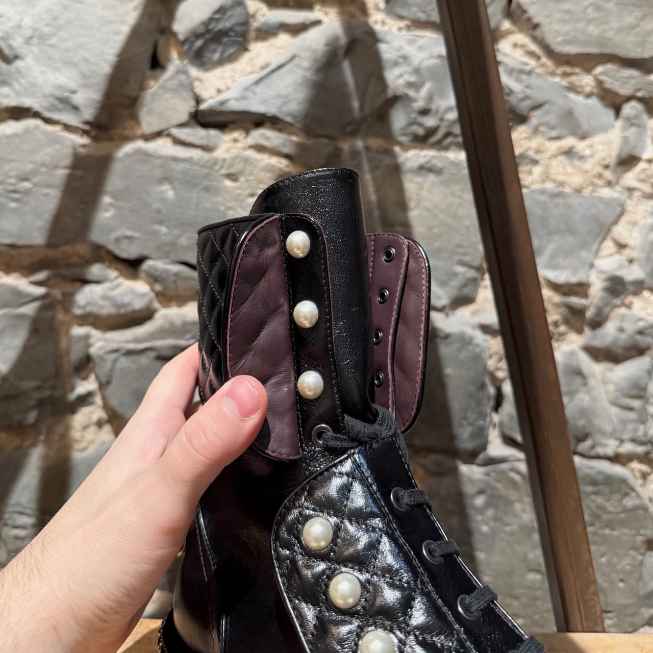 Black shiny leather with a quilted shaft featuring overlapping panels and pearl details. Lace-up closure set slightly to the side with quilted flap, secured by snap buttons hidden under pearl accents. Small metal CC logo. Stitched CC logo on the toe cap. Thick lug rubber outsole with silver-tone chain trim, topped with black velvet trim. Burgundy quilted leather lining. Made in Italy. Come with original branded box, dustbag, and care booklet.