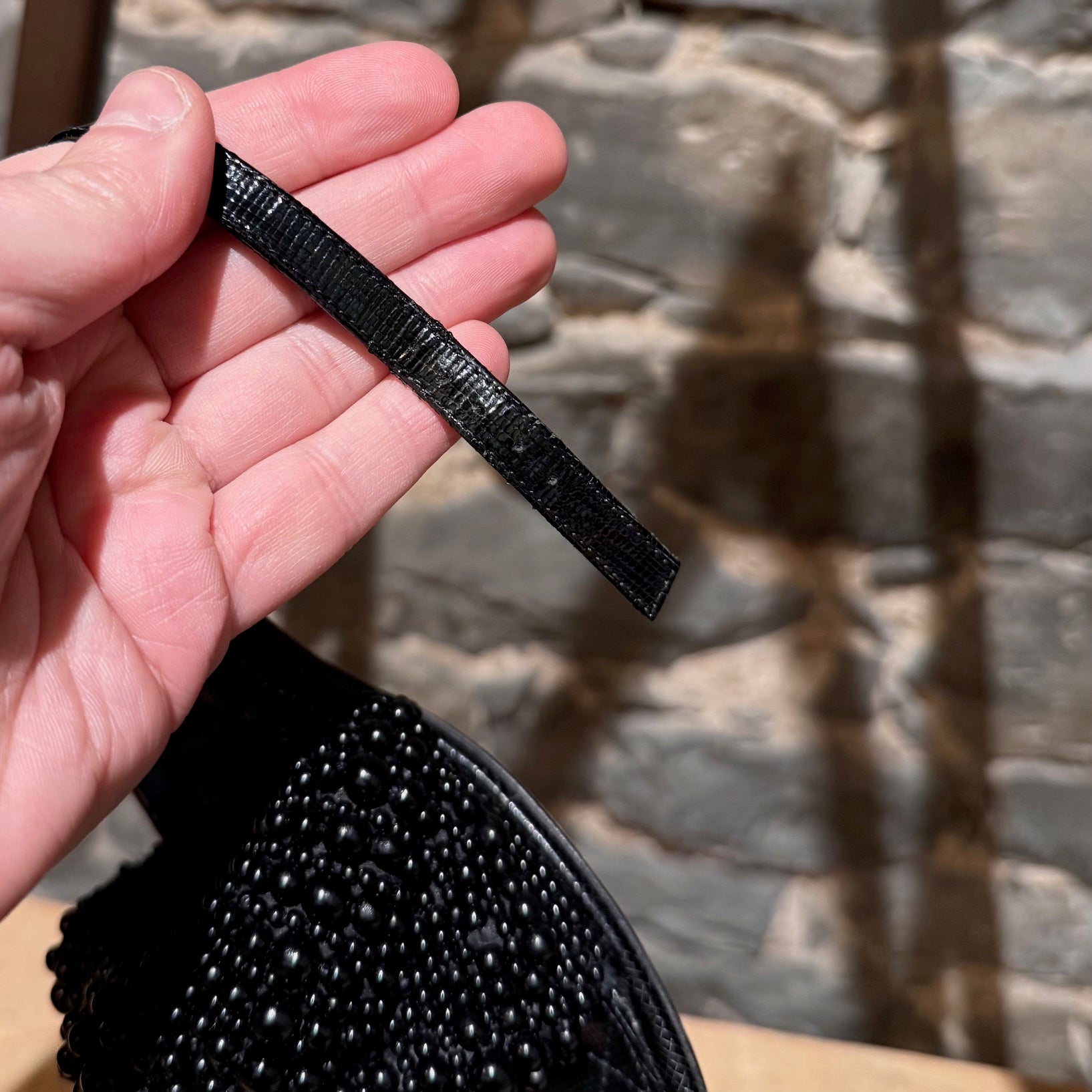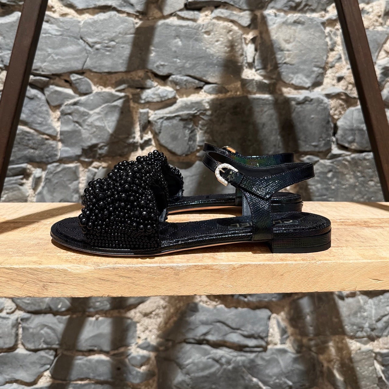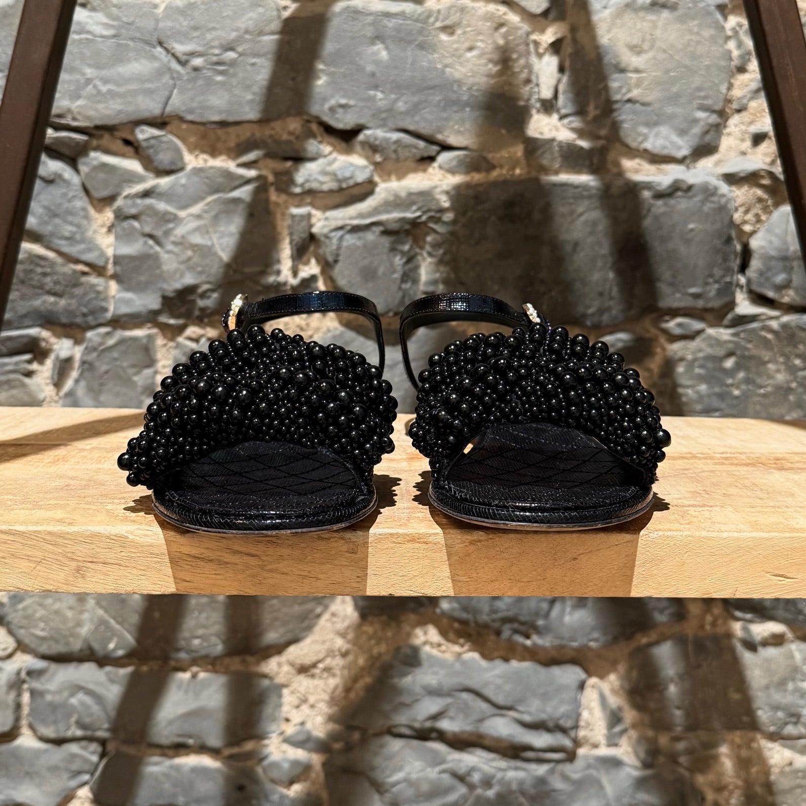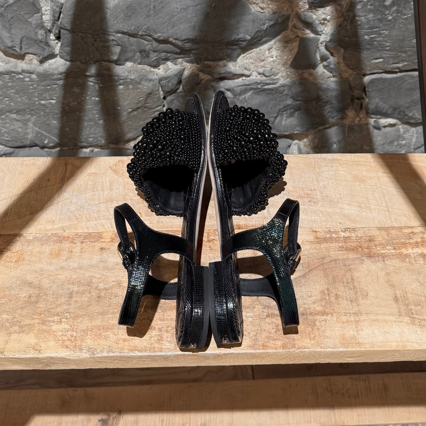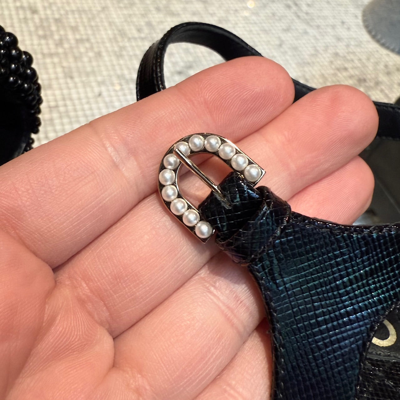 CONDITION: Pre-owned, in very good condition. Visible outsole wear. Light creasing to insoles. Peeling and creasing at strap adjustment holes. Minor edge and leather wear consistent with gentle use. No major defects. No apparent missing faux pearls. Please refer to the pictures and measurements. Feel free to inquire for additional information prior to purchase.