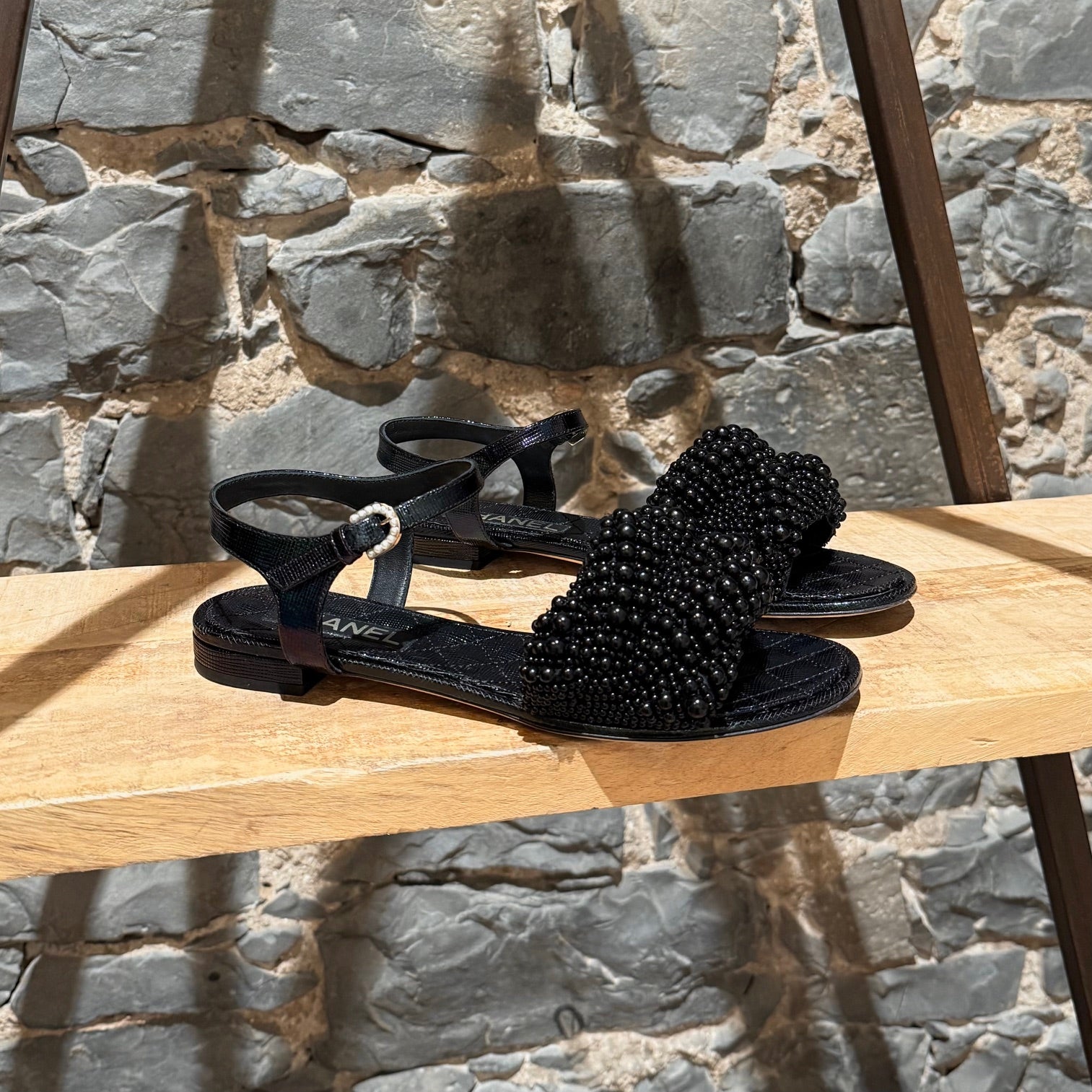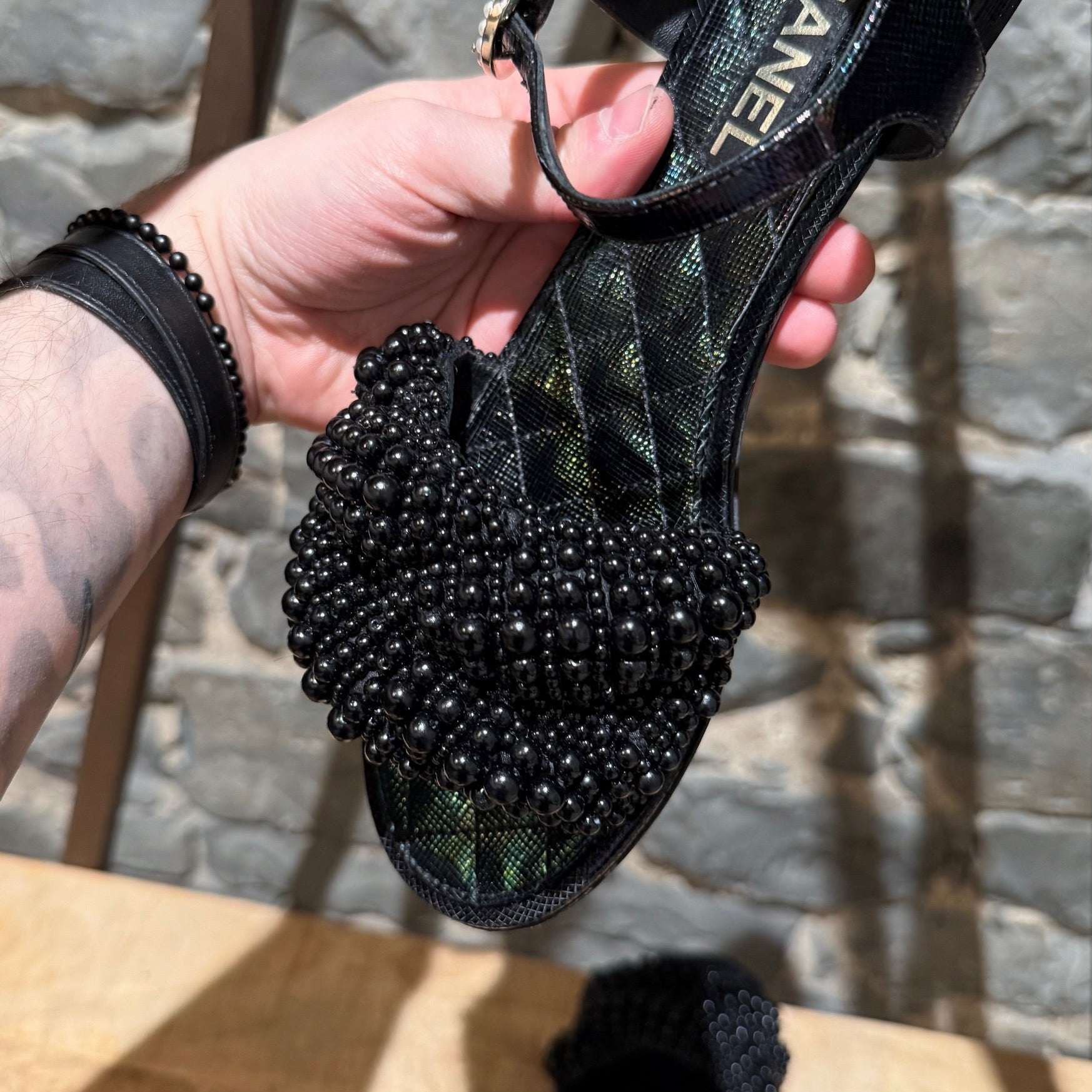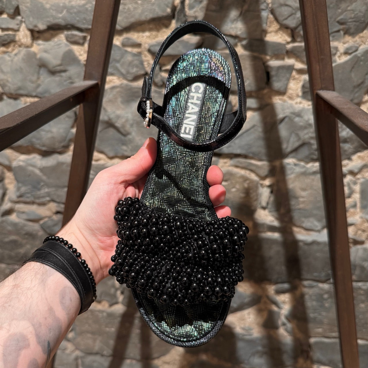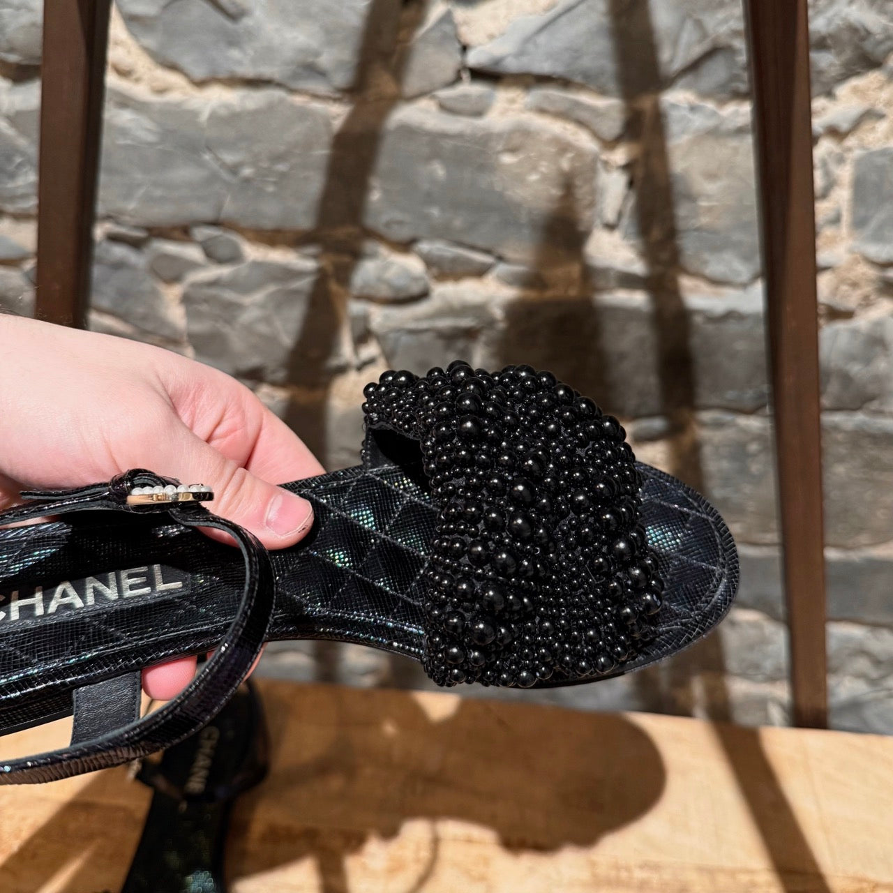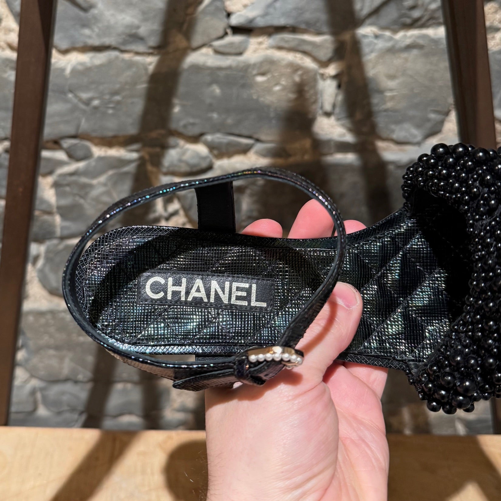Spring Summer 2018 collection. Flat open-toe slingback sandals with iridescent textured finish and quilted insoles. Wide strap embellished with mixed-size black fantasy pearls. Adjustable slingback with pearl-accent buckle. Low stacked heel with CC detail at back. Made in Italy. Come with Chanel dustbag.