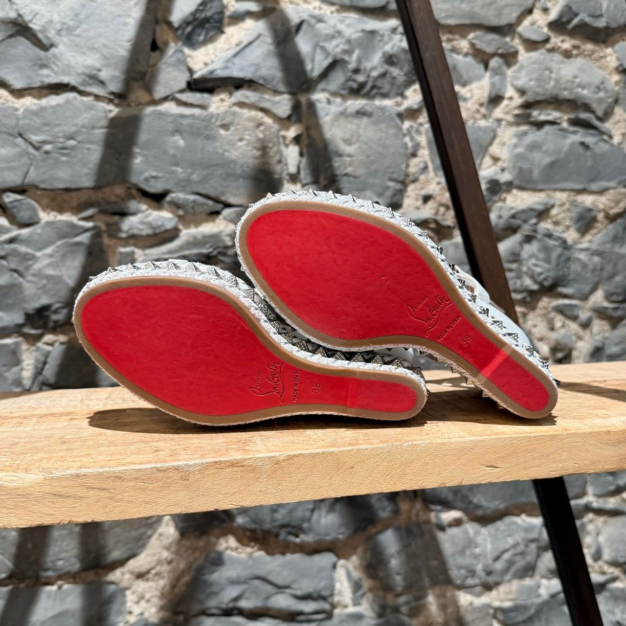 CONDITION: Pre-owned, in very good condition. Light signs of wear consistent with gentle use. Light wear at soles. Light surface dents on the wedge. Light stains visible at the rope edges at both shoes. No missing studs - some tips are showing friction marks. Minimal creasing on the leather straps. Please refer to the pictures and measurements. Feel free to inquire for additional information prior to purchase.