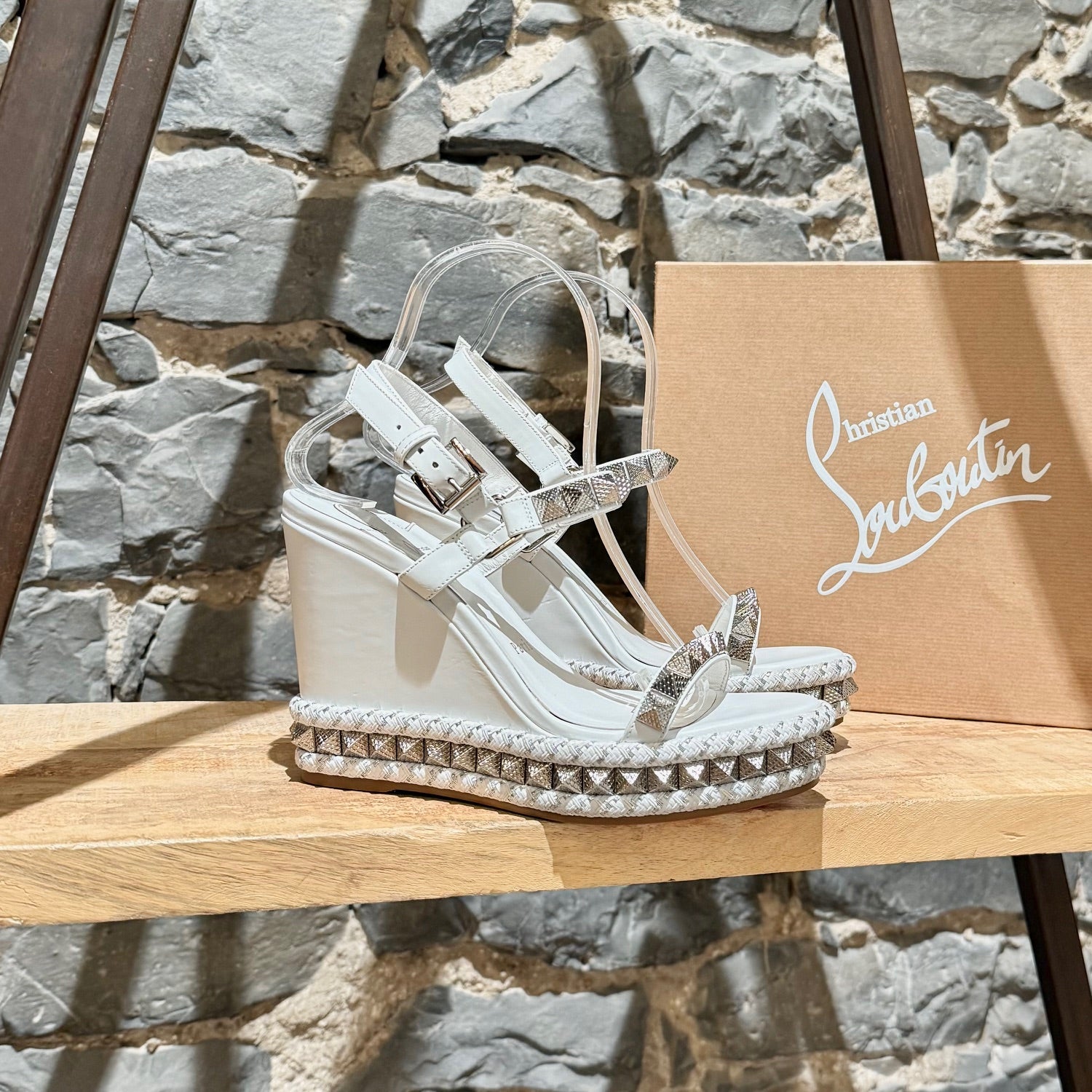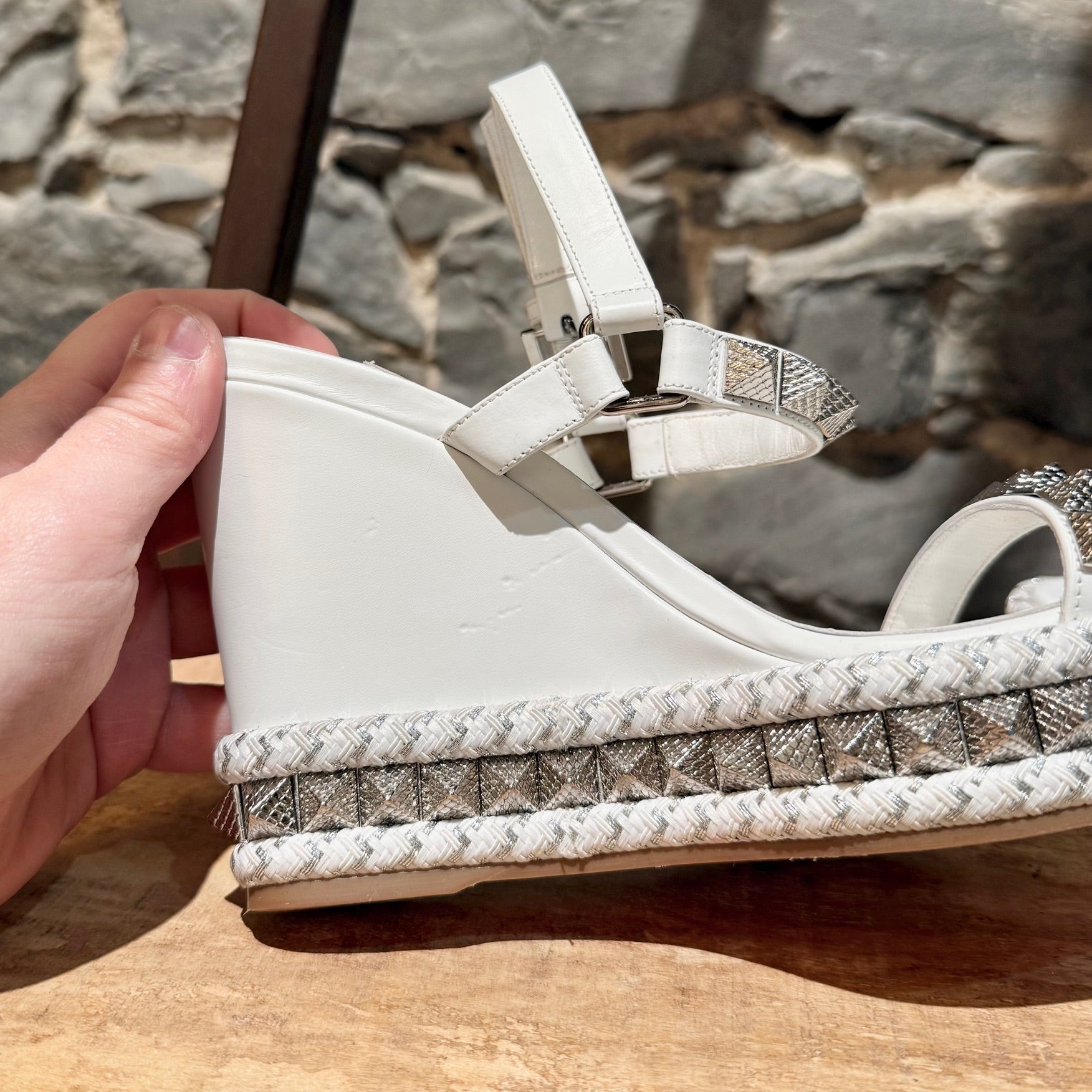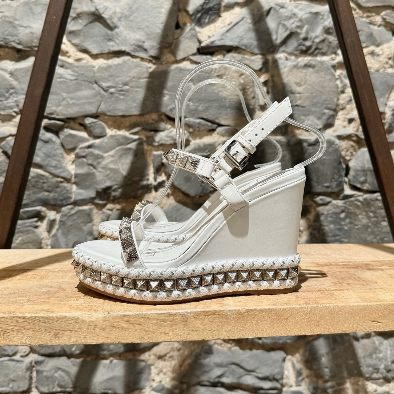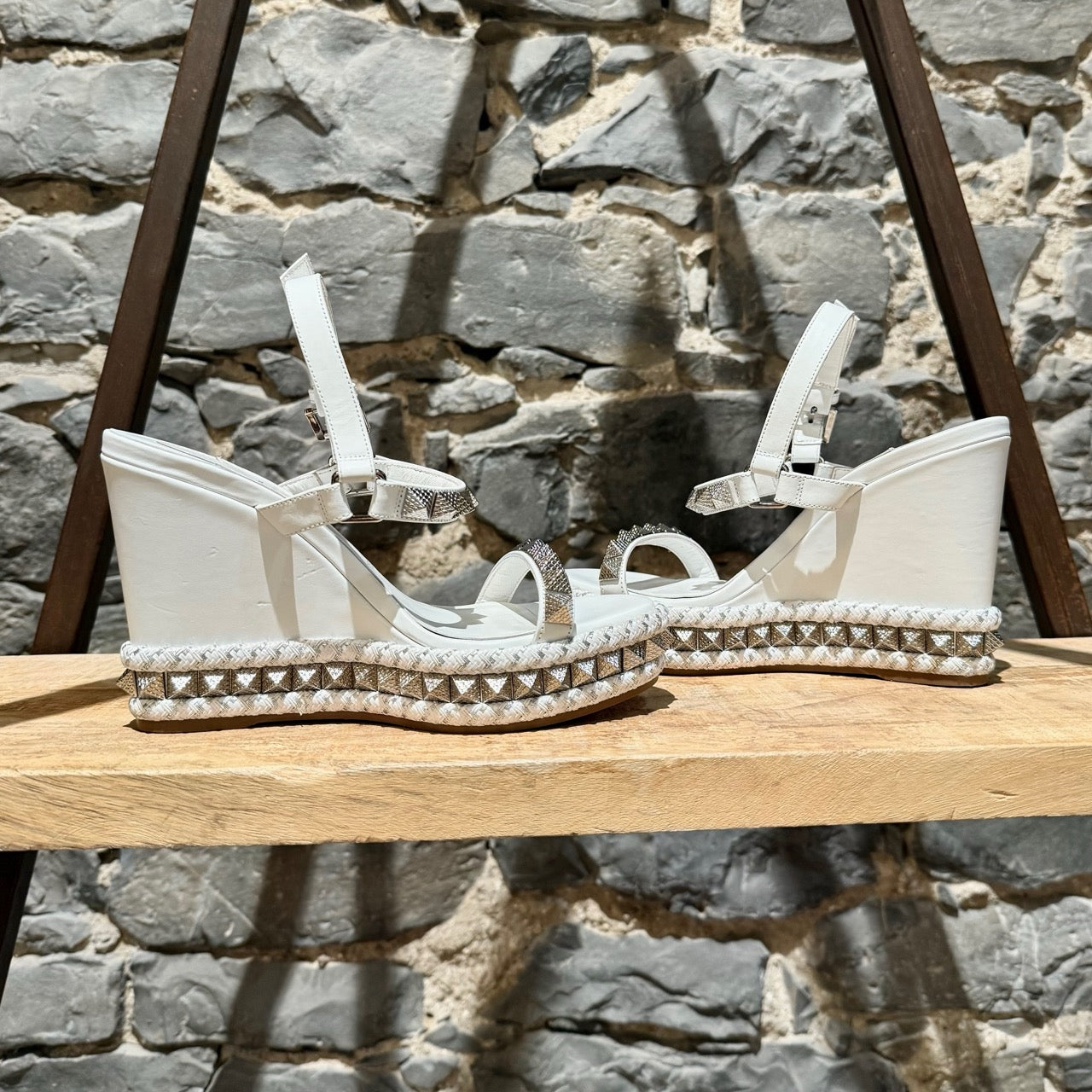 Smooth white leather wedge. Open-toe. Textured pyramid studs at straps and all around the sole. Adjustable buckle ankle strap. Braided rope midsole with textured metallic-effect trim. Padded leather insole. Signature red rubber outsole. Made in Spain. Come with original Louboutin box and dustbag.
