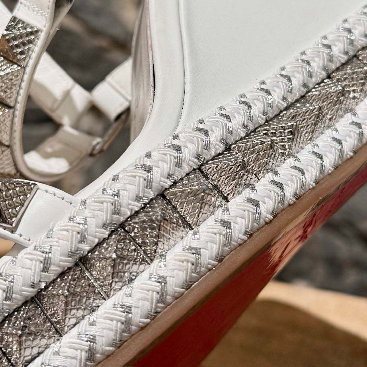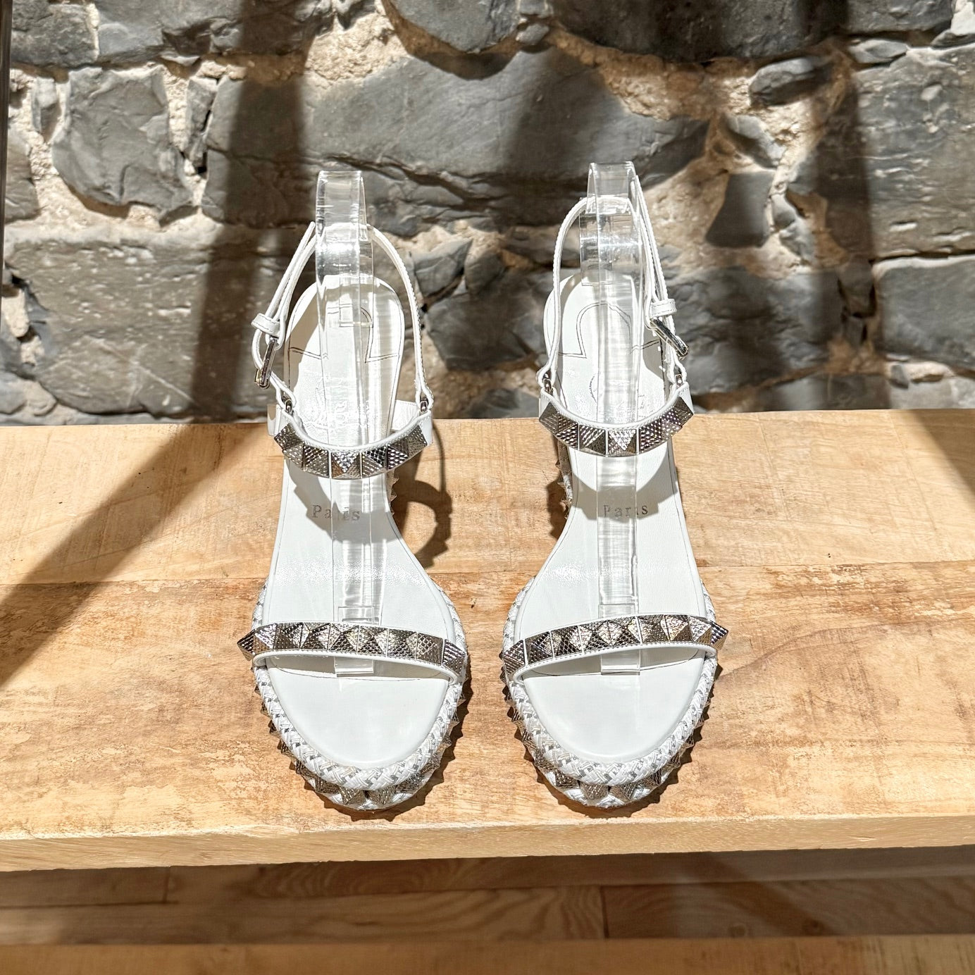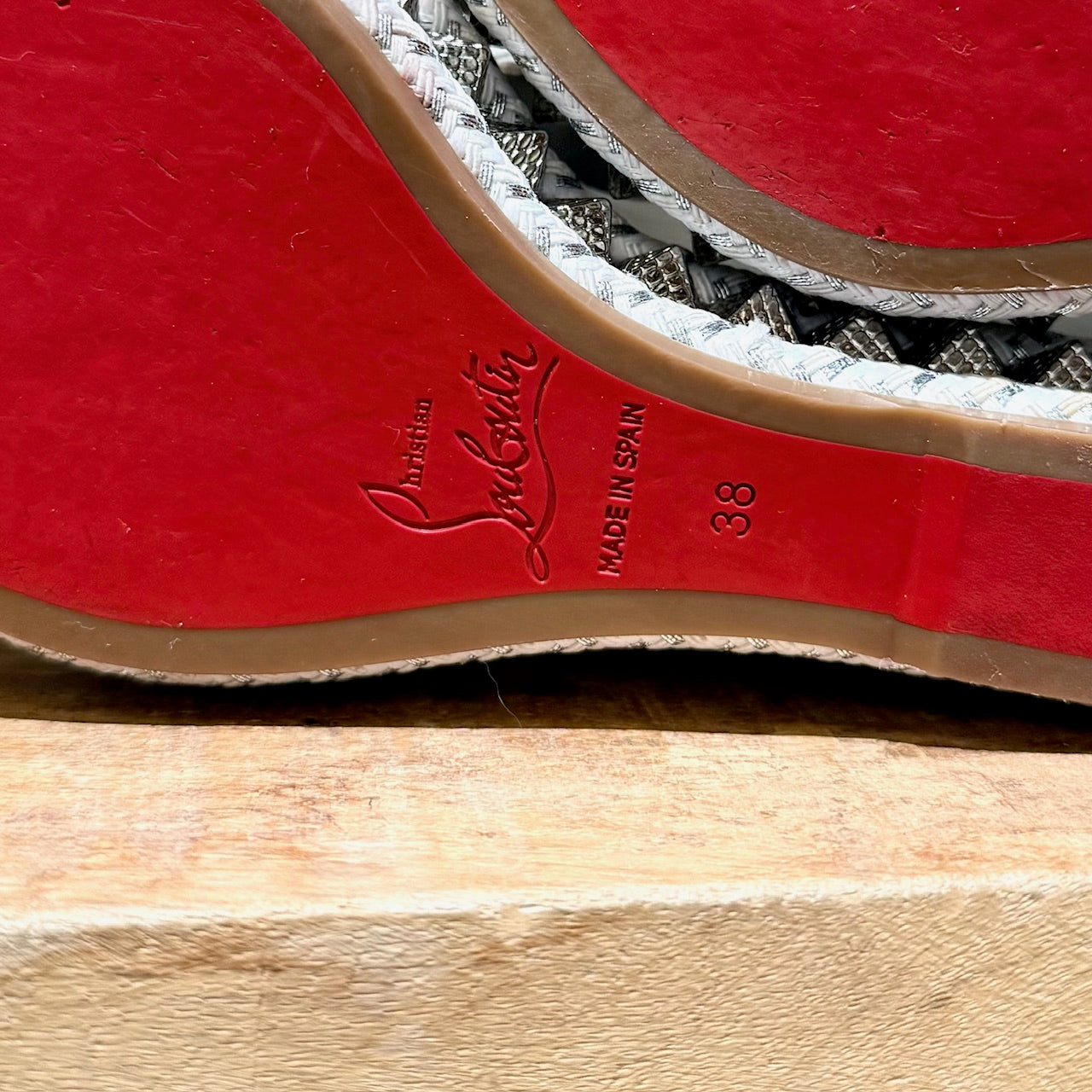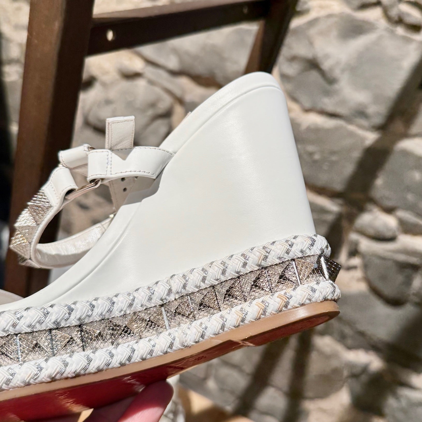 Smooth white leather wedge. Open-toe. Textured pyramid studs at straps and all around the sole. Adjustable buckle ankle strap. Braided rope midsole with textured metallic-effect trim. Padded leather insole. Signature red rubber outsole. Made in Spain. Come with original Louboutin box and dustbag.