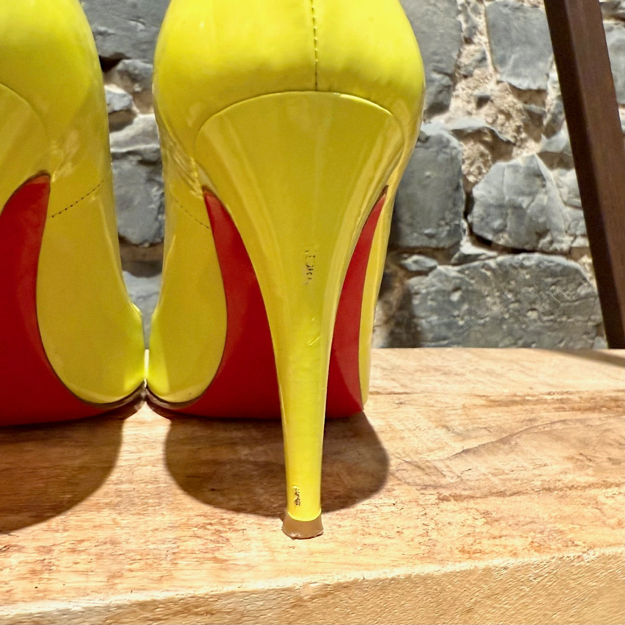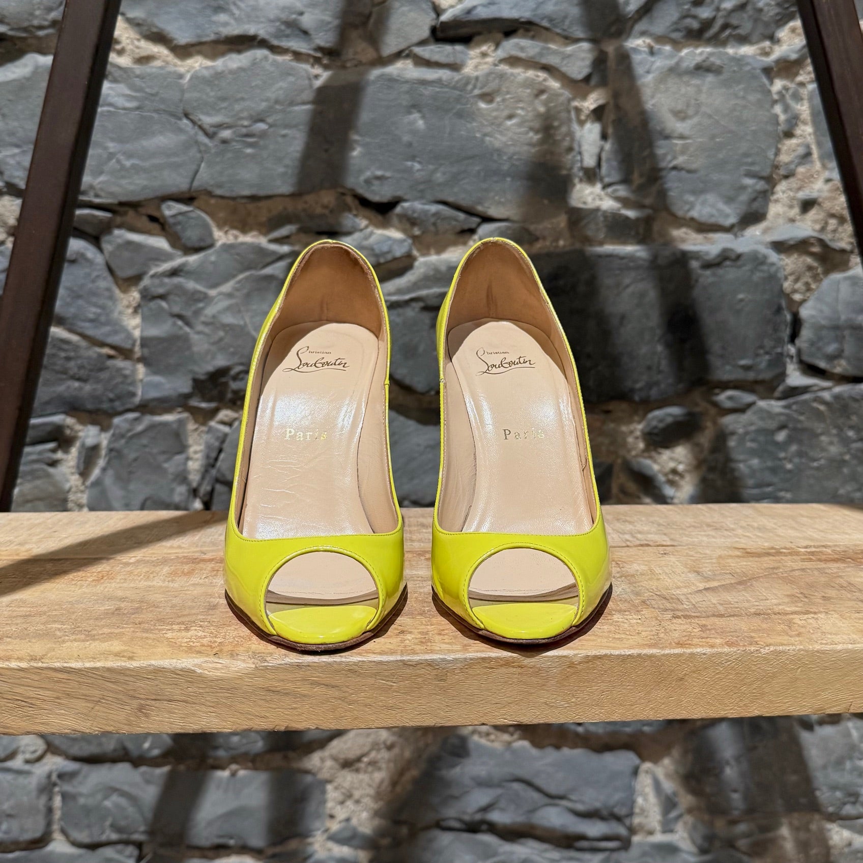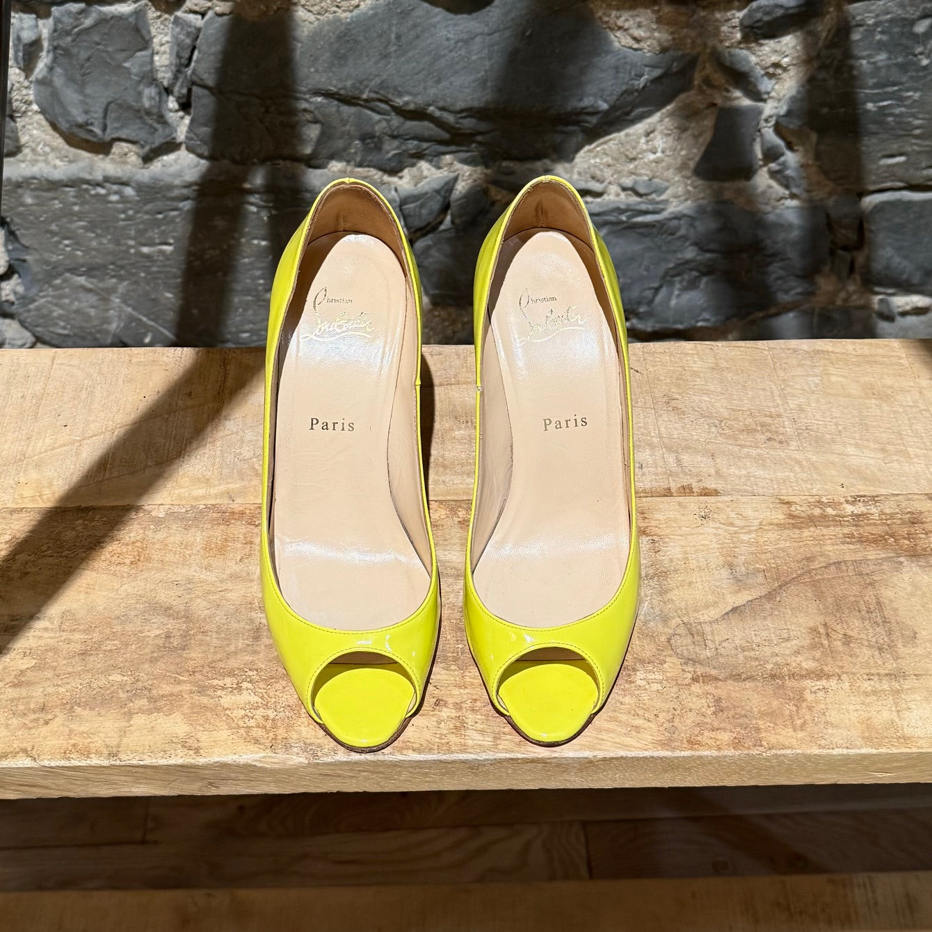 Peep-toe slip-on design with a high stiletto heel. Bright yellow patent leather upper with a glossy finish. Signature red lacquered leather outsoles. Leather-lined interior. Made in Italy. Come as is.