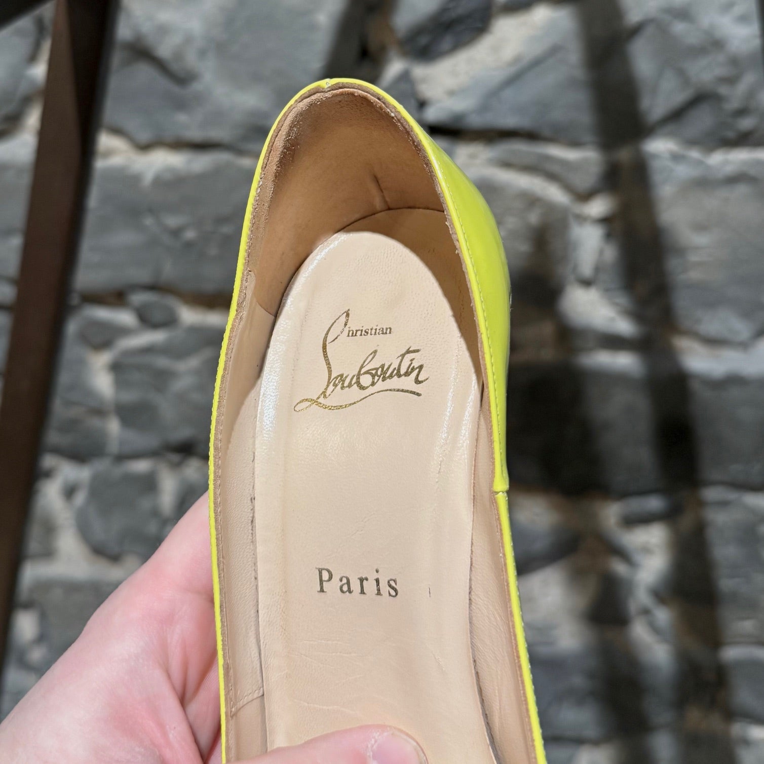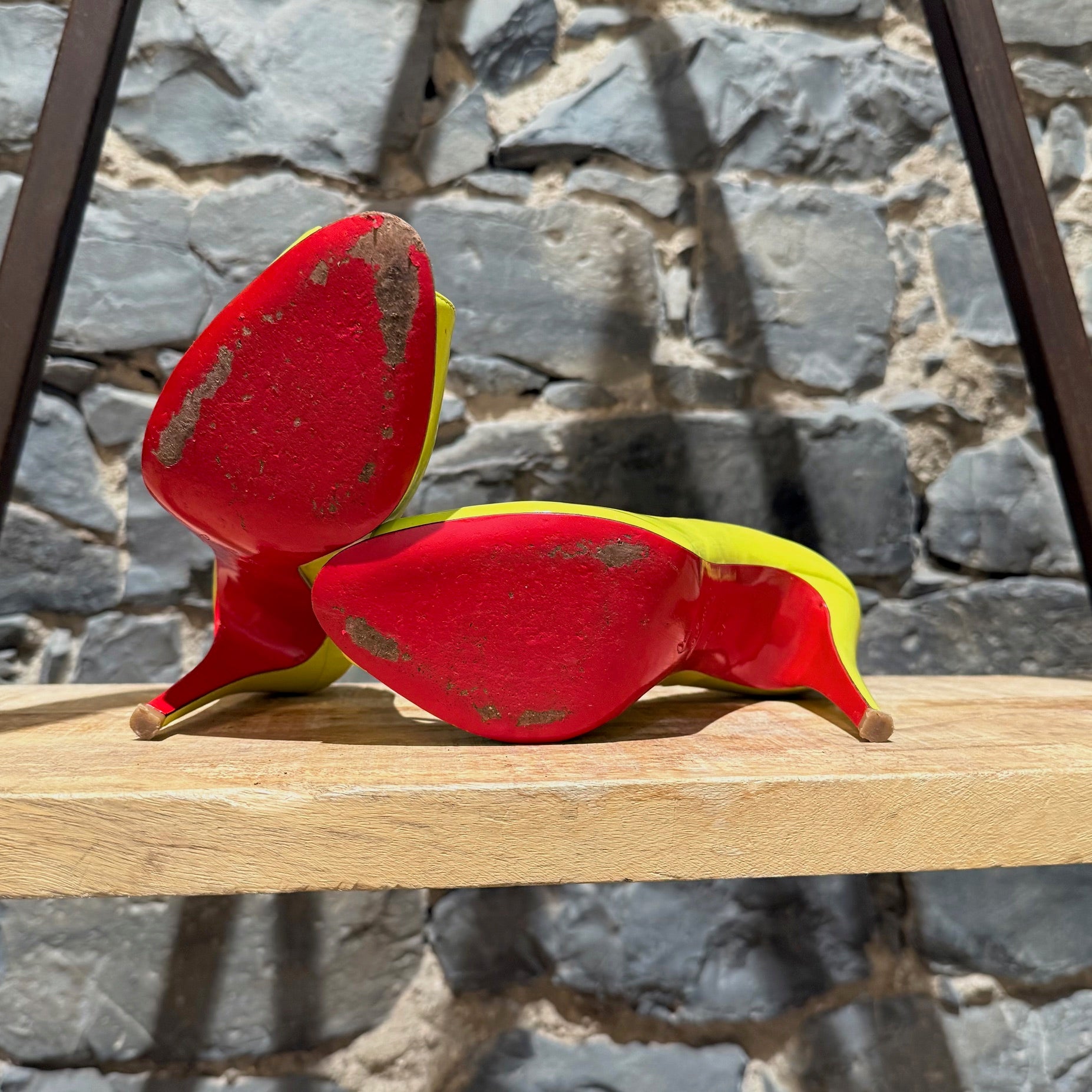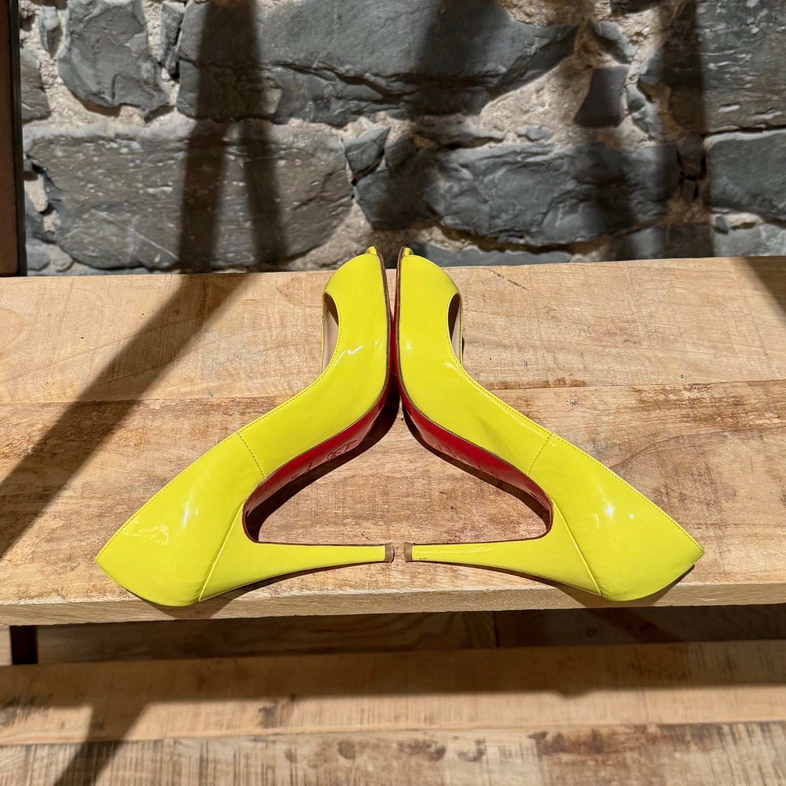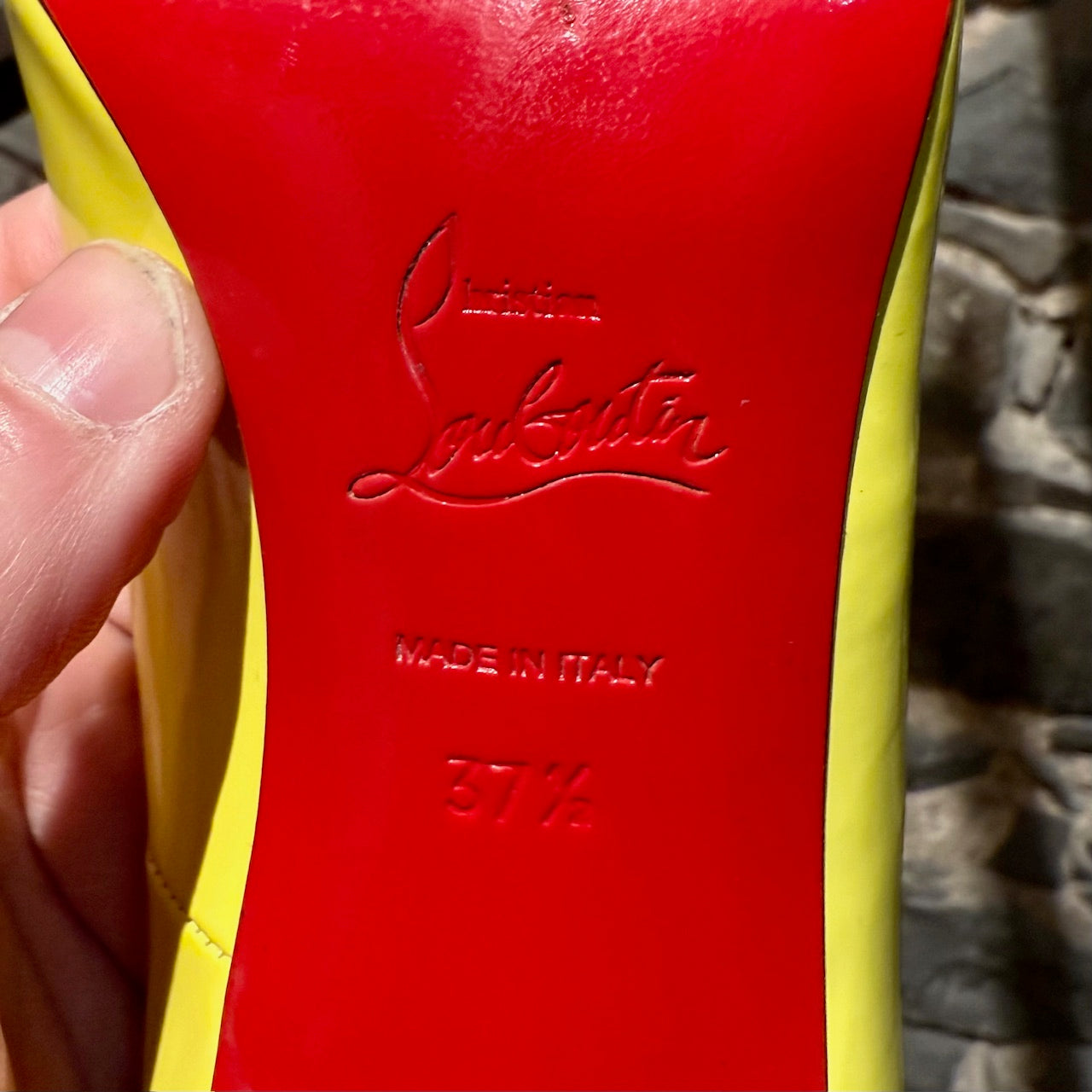 Peep-toe slip-on design with a high stiletto heel. Bright yellow patent leather upper with a glossy finish. Signature red lacquered leather outsoles. Leather-lined interior. Made in Italy. Come as is.
