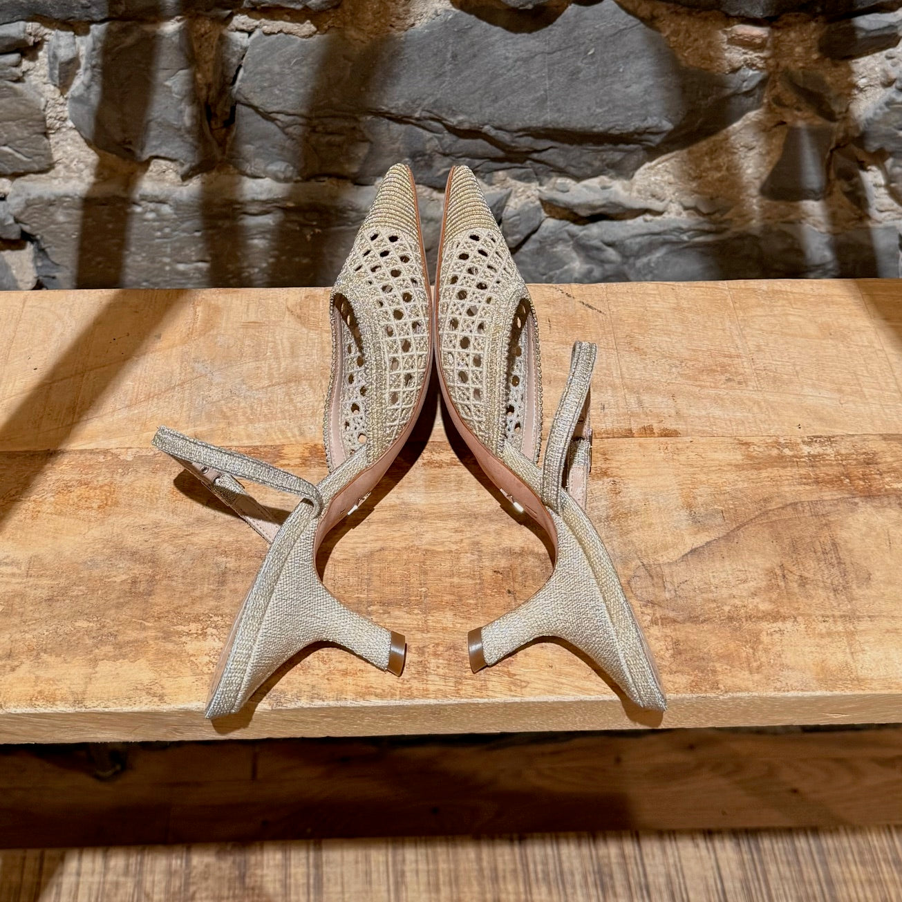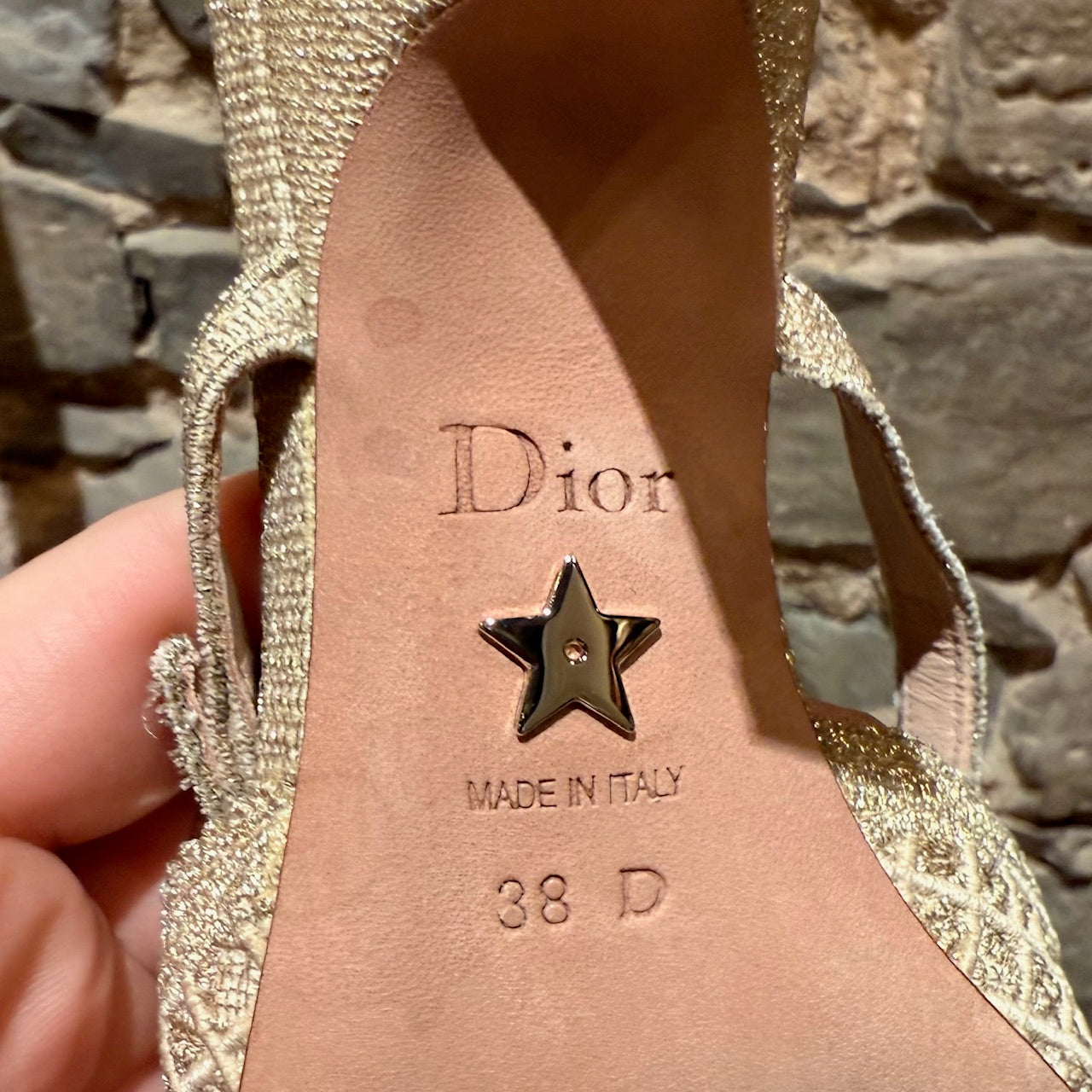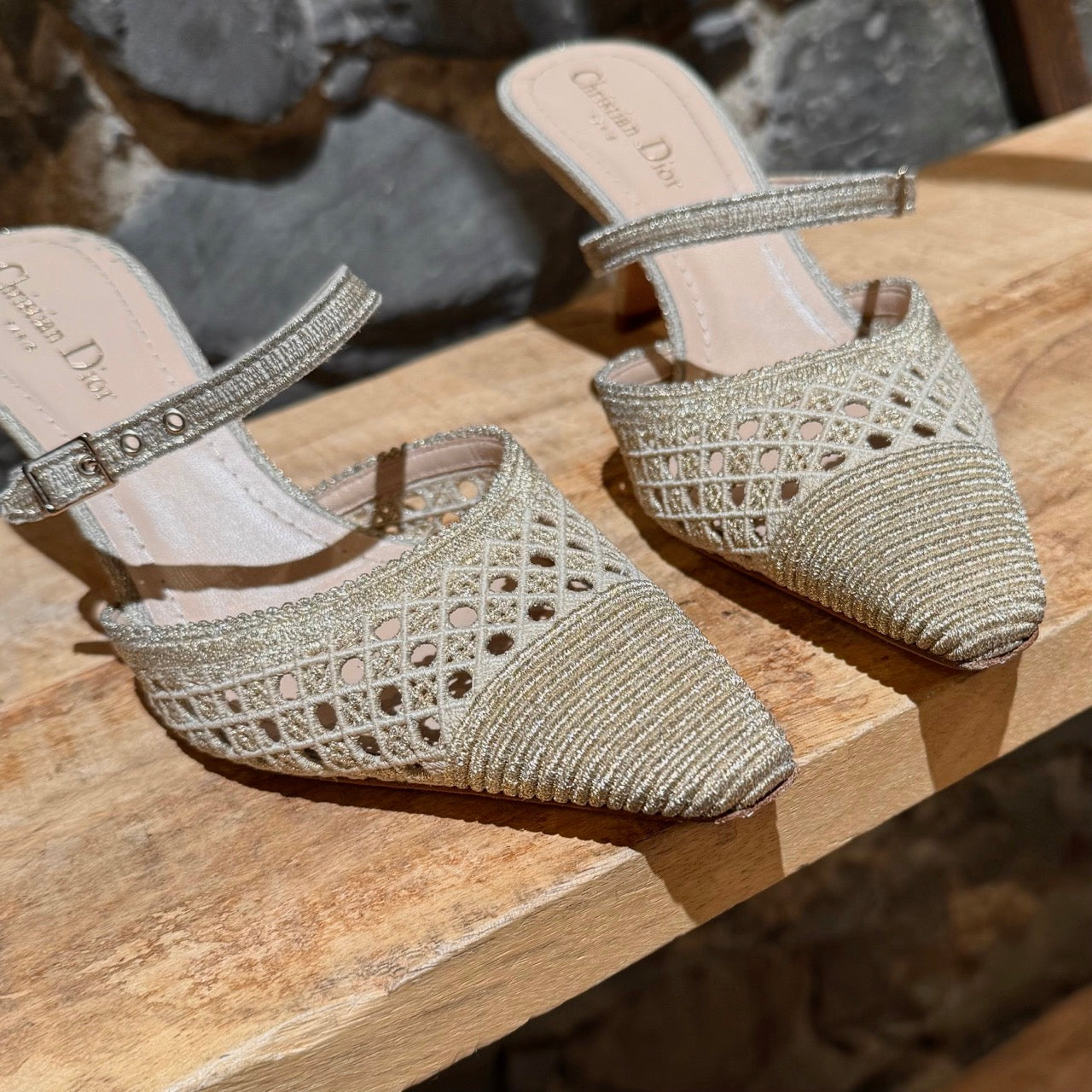 Dior Metallic Gold Cannage Capture 65 Mule Pumps. Pointed toe design with open back and adjustable strap. Dior's signature Cannage pattern in a woven gold-tone metallic thread textile. Low-cut vamp and hourglass heel. Lined in leather. Leather outsole with star detail at arch. Made in Italy. Comes with Dior dustbag.