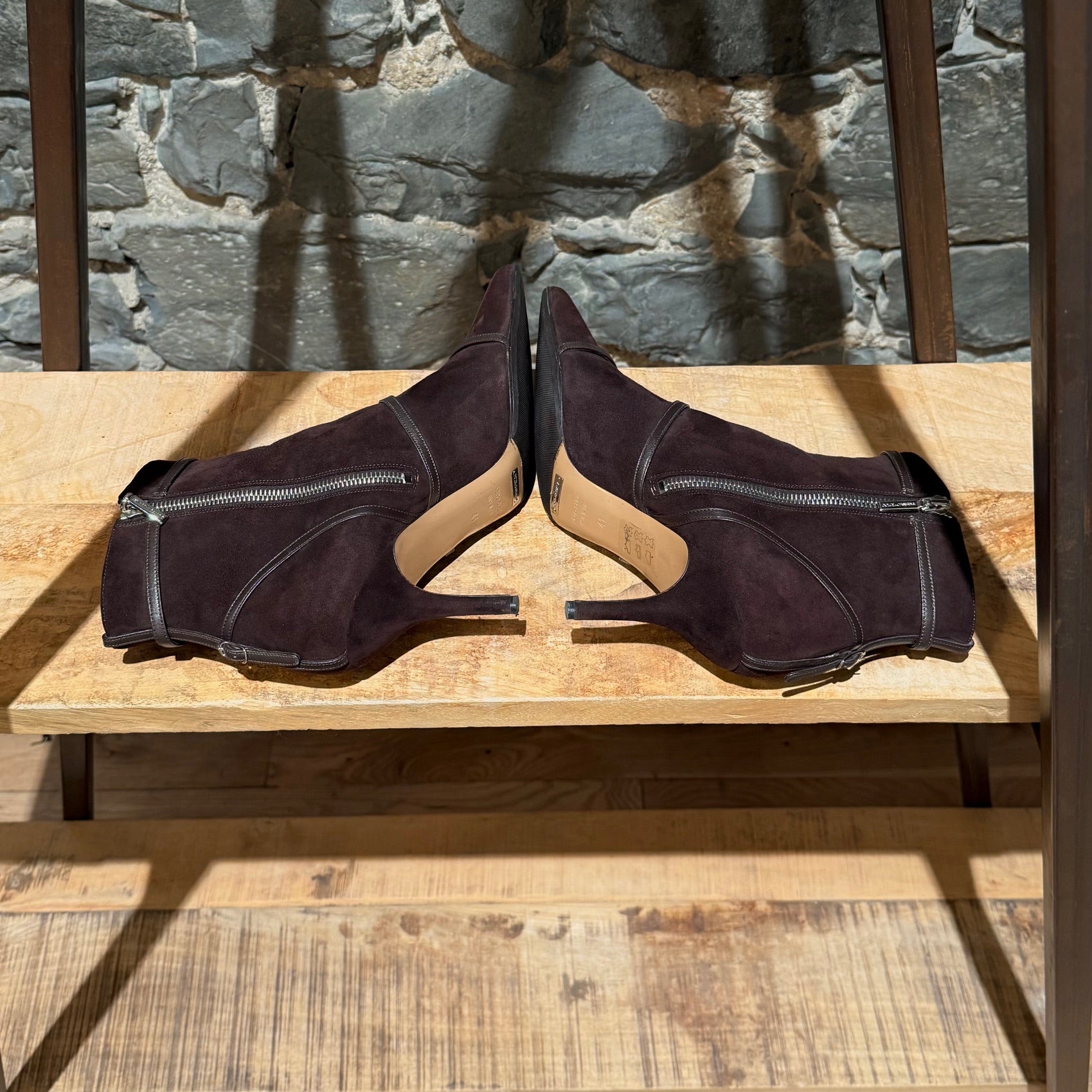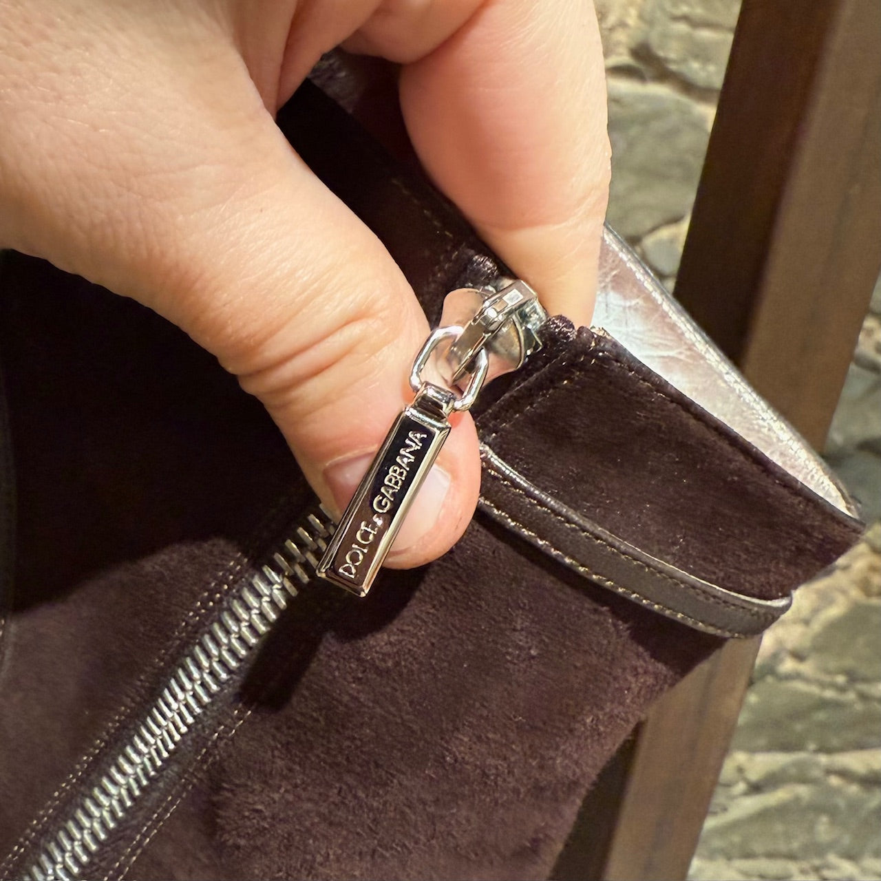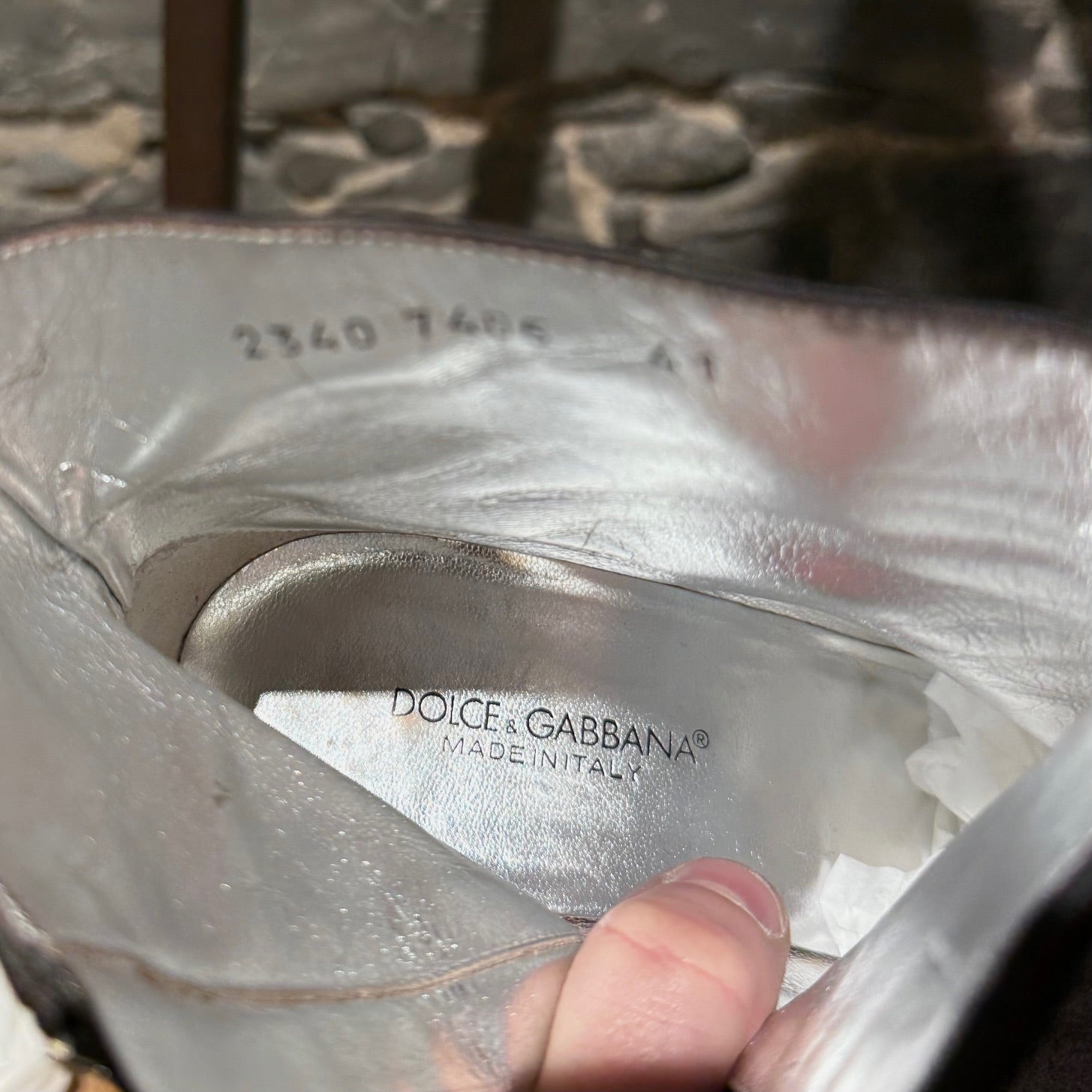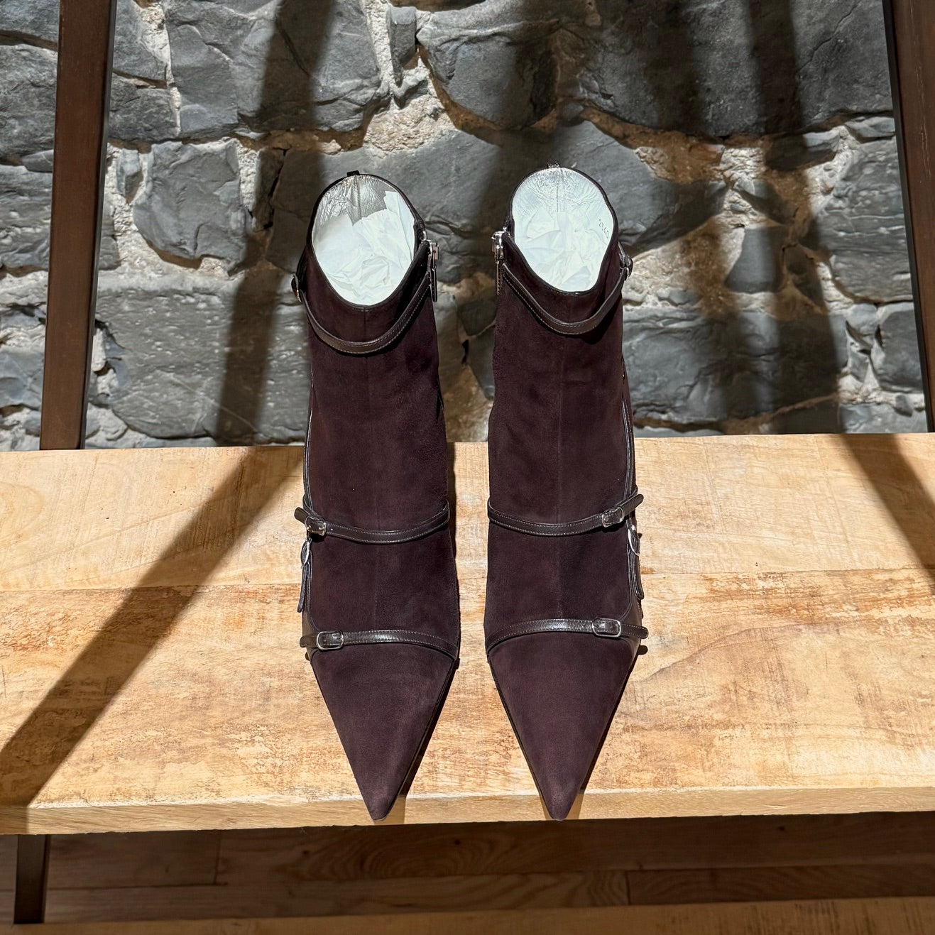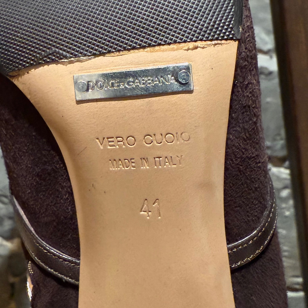 Rich dark brown suede with tonal leather harness detailing wrapping across the upper. Multiple slim adjustable but decorative buckle straps. Side zipper closure with branded silver-tone pull tab. Pointed toe. Slim stiletto heels. Metallic silver leather lining and insole. Leather outsole. Made in Italy. Come with Dolce & Gabbana dustbag.