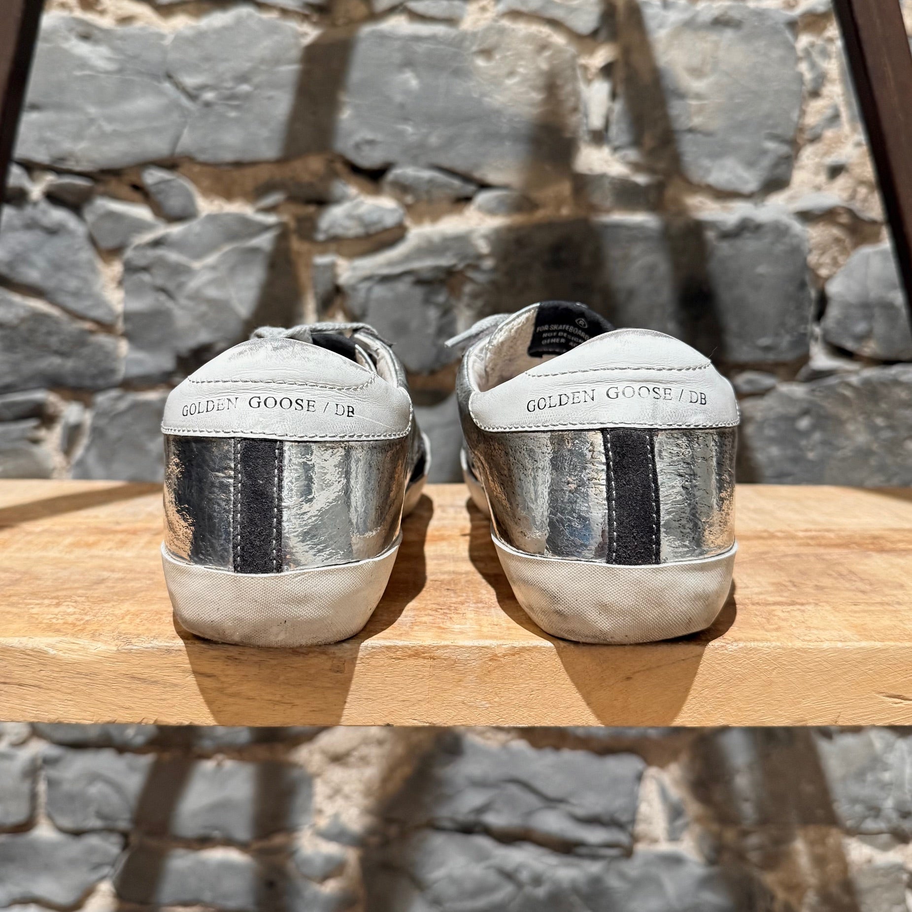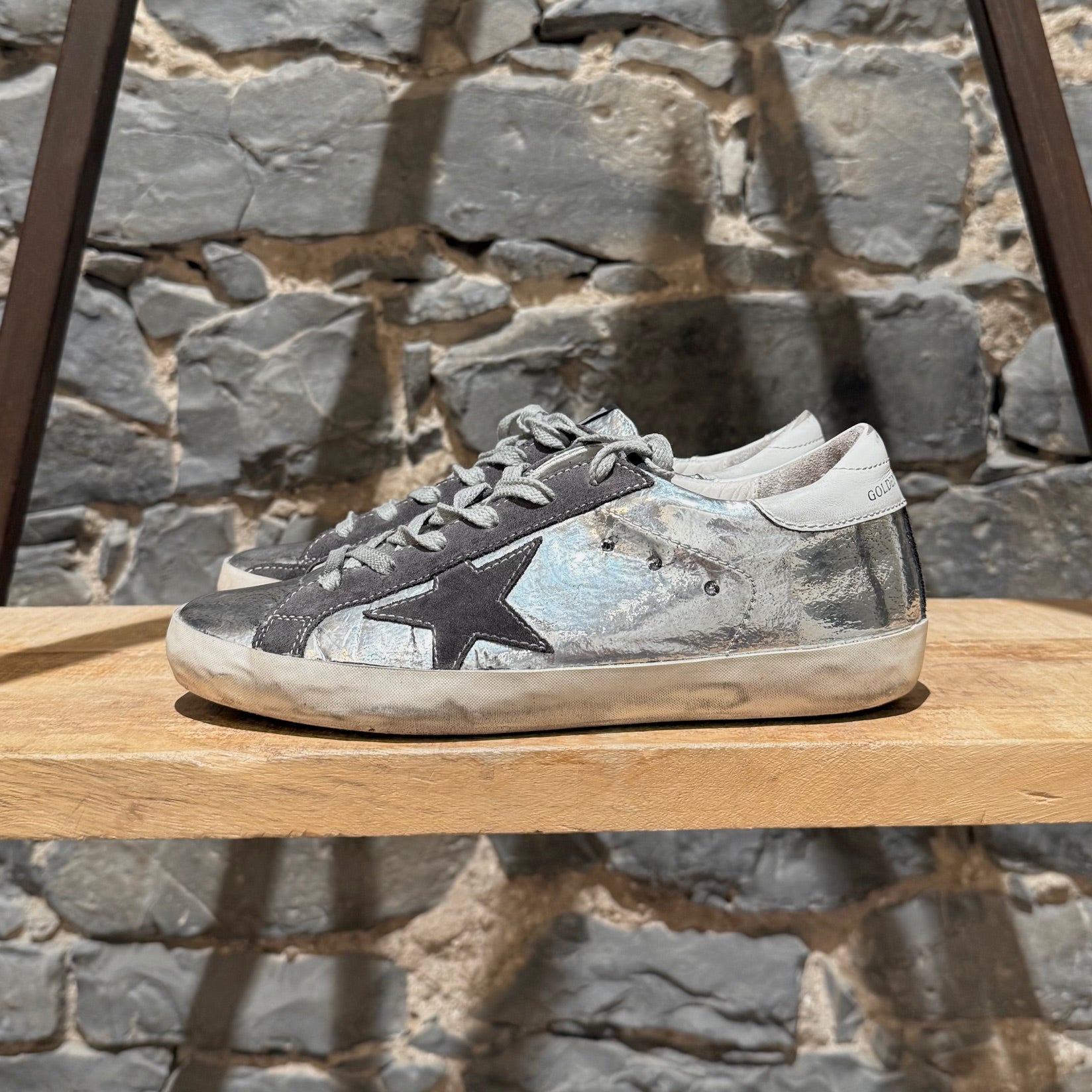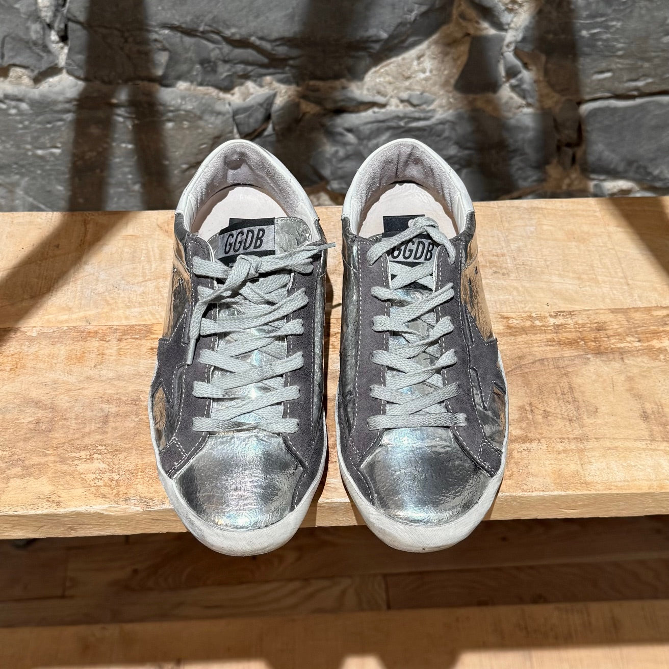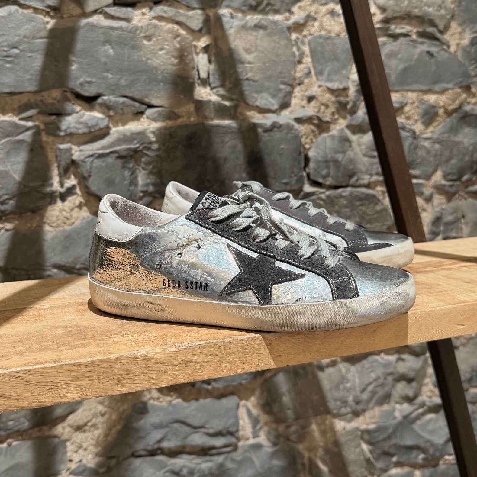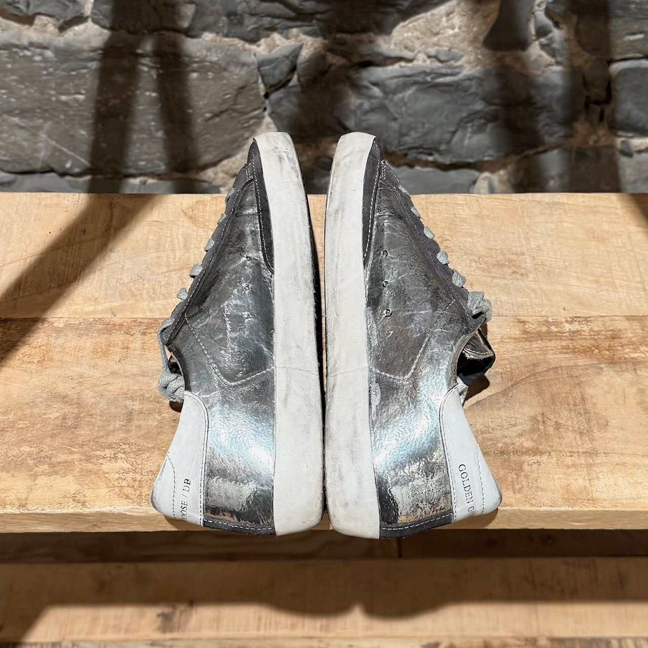 Low-top lace-up sneakers. Silver metallic leather upper with an intentionally distressed worn finish. Dark grey suede star appliqué and overlays. Round toe. Flat grey laces. Padded collar. White leather heel tab. Golden Goose branding at back heel and side. Removable leather insole. Worn-effect rubber sole. Made in Italy. Come as is.