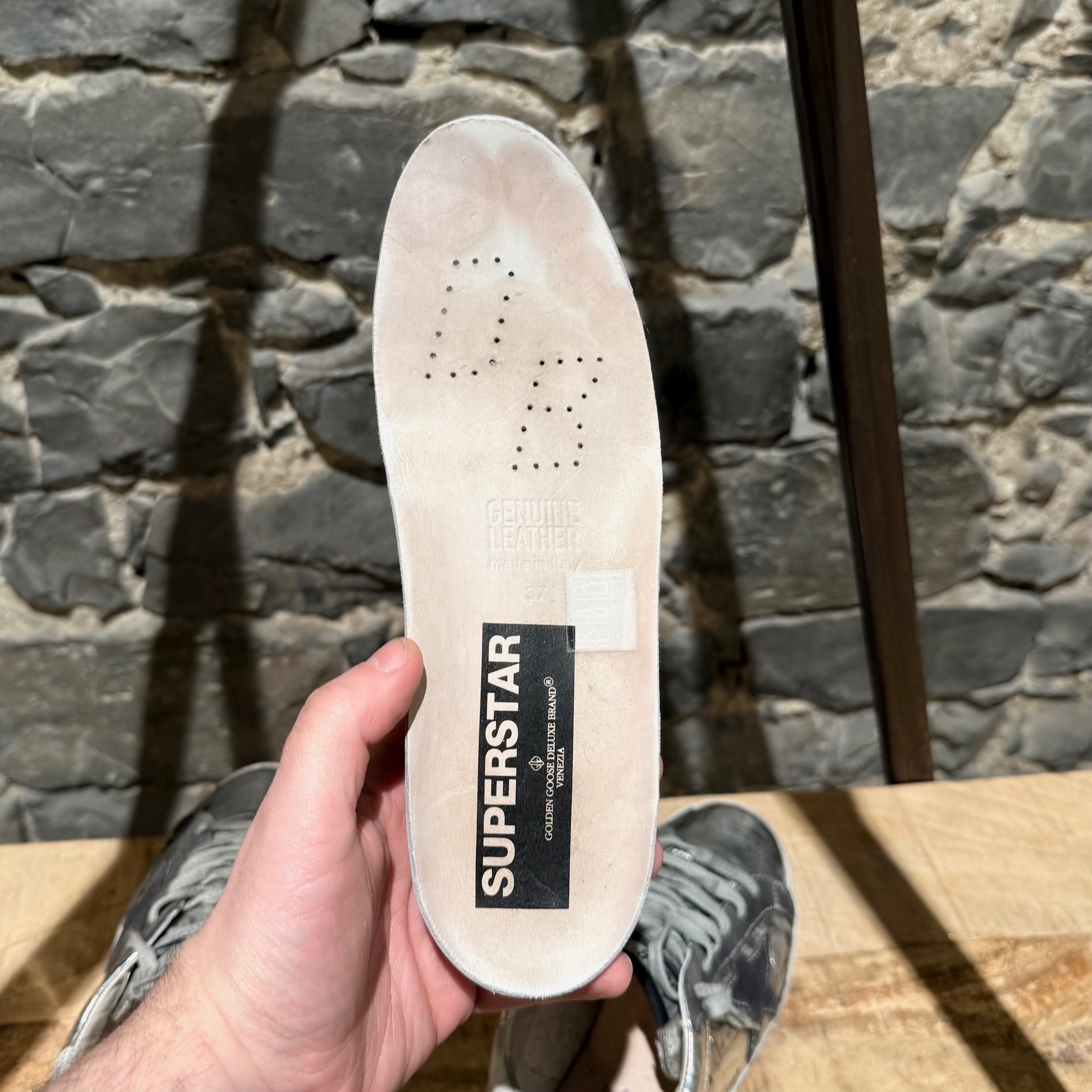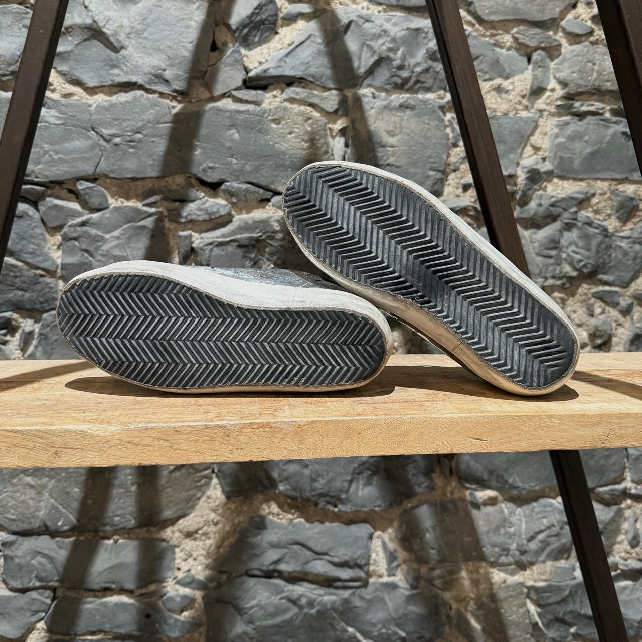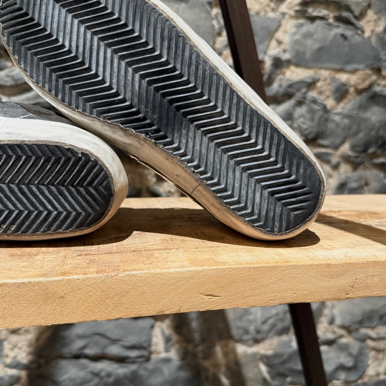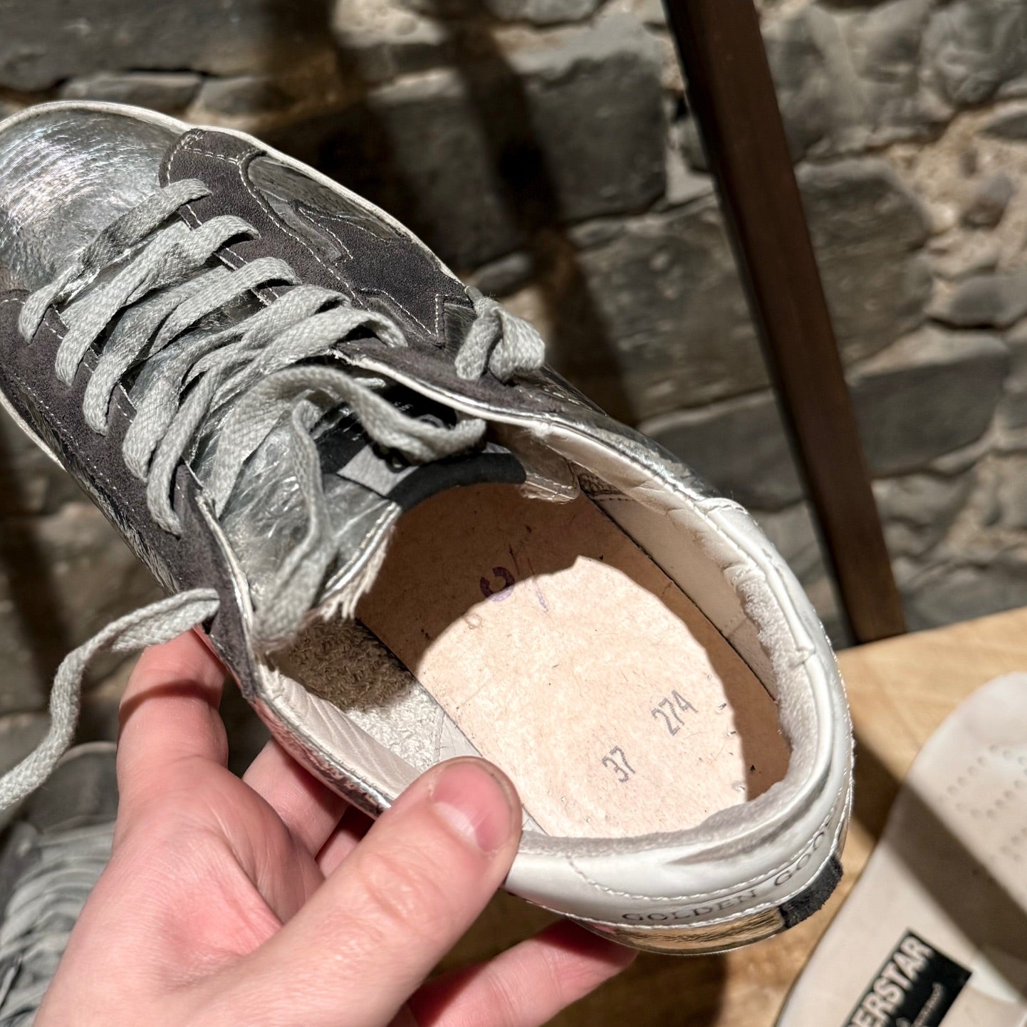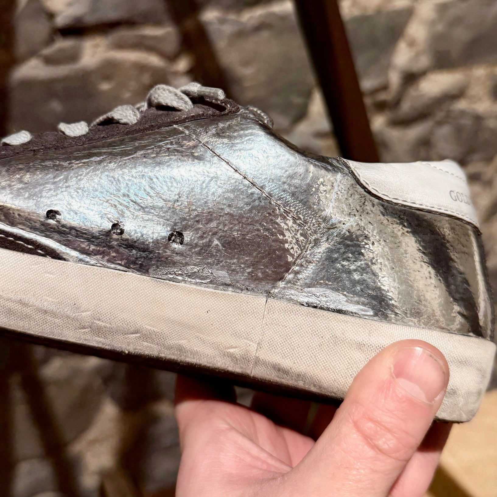 Low-top lace-up sneakers. Silver metallic leather upper with an intentionally distressed worn finish. Dark grey suede star appliqué and overlays. Round toe. Flat grey laces. Padded collar. White leather heel tab. Golden Goose branding at back heel and side. Removable leather insole. Worn-effect rubber sole. Made in Italy. Come as is.