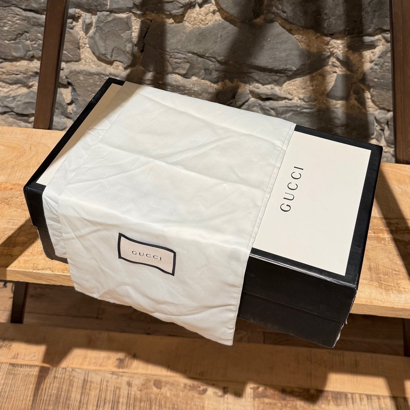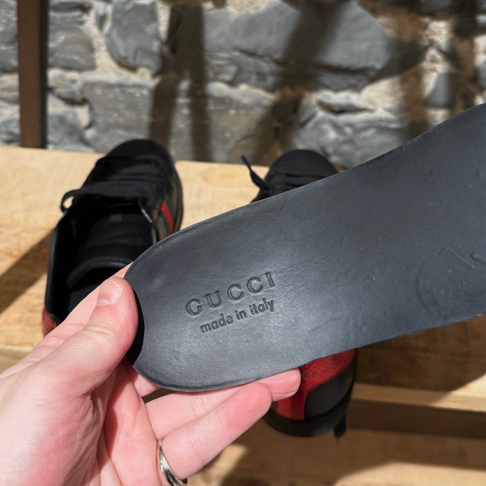 Black smooth leather upper. Round toe. Green and red Web stripe panels at sides. Red snakeskin-effect heel tabs with grey Gucci lettering. Black laces. Black rubber outsole with Gucci crest pattern. Removable black leather insole. Made in Italy. Come with a Gucci box and dustbags.