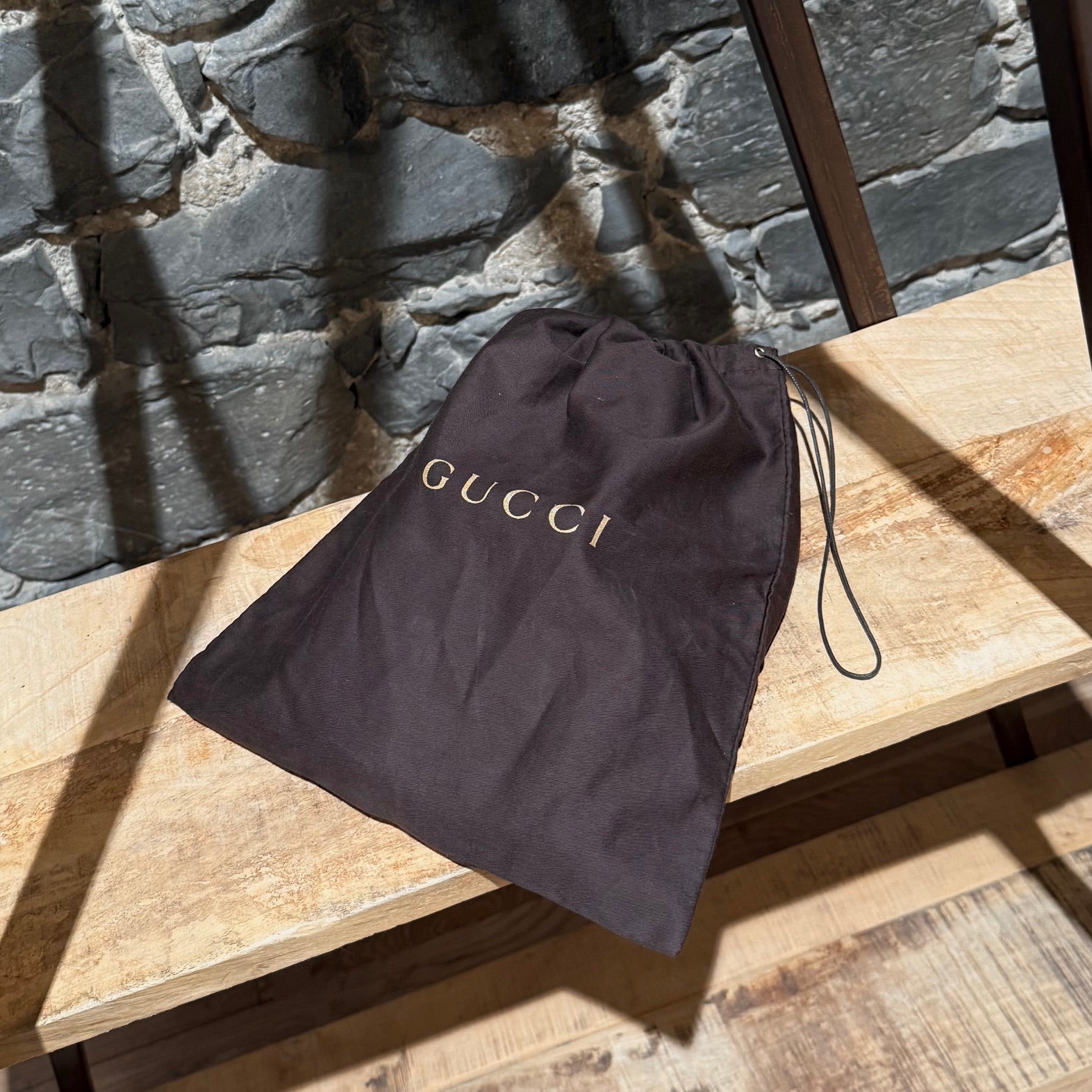 Classic slip-on design in smooth brown leather. Signature silver-tone horsebit hardware across the vamp. Almond toe. Raised stitching around the apron. Low stacked leather heel. Leather insole and outsole. Made in Italy. Come with Gucci dustbag.