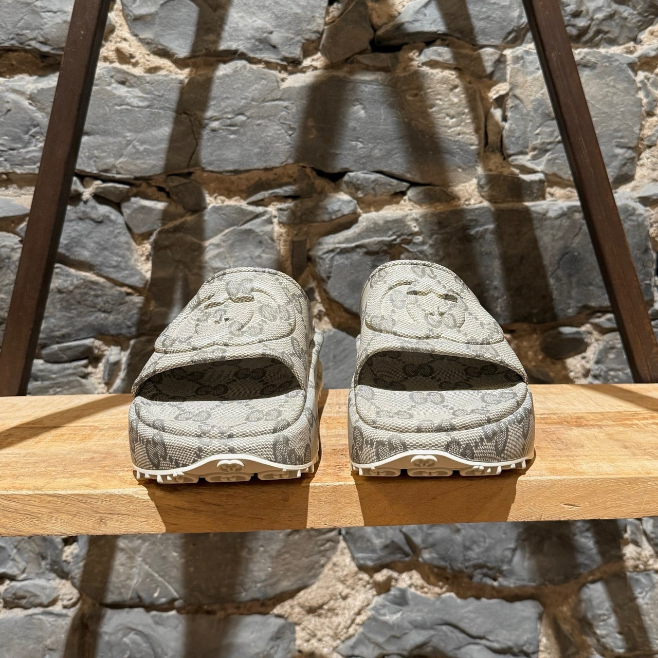 Gucci Grey GG Logo Rubber Cubic Platform Slide Sandals. Ivory and grey rubber. Wide foot strap with tonal embossed interlocking 3D GG logo. Allover GG monogram pattern. Thick molded platform sole. Textured monogram sole tread for grip. Made in Italy. Comes with original box and branded dustbag.