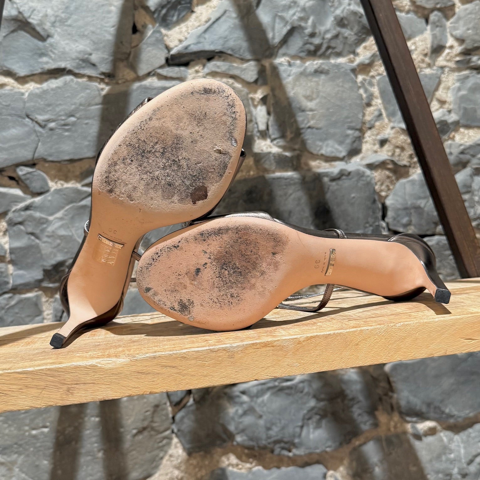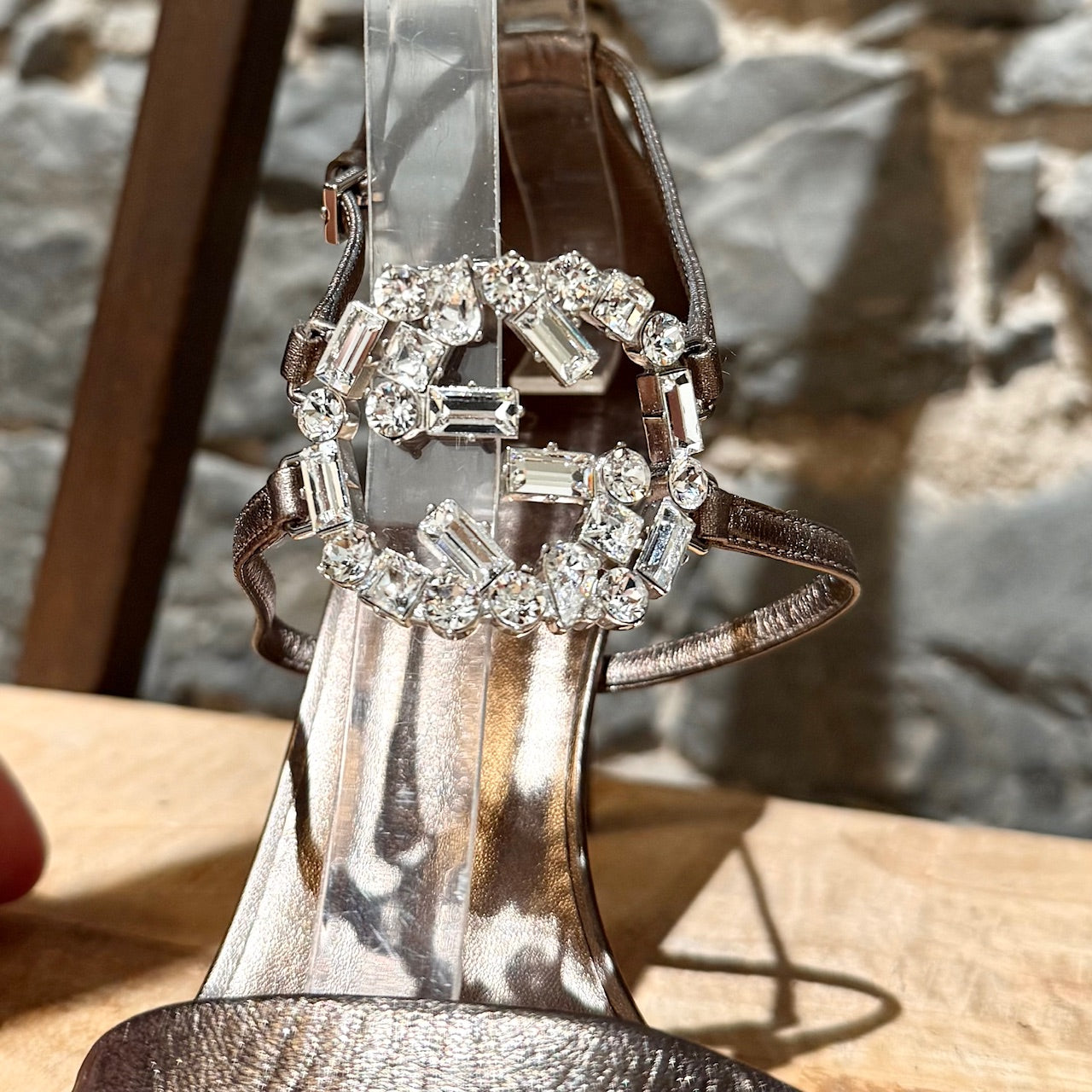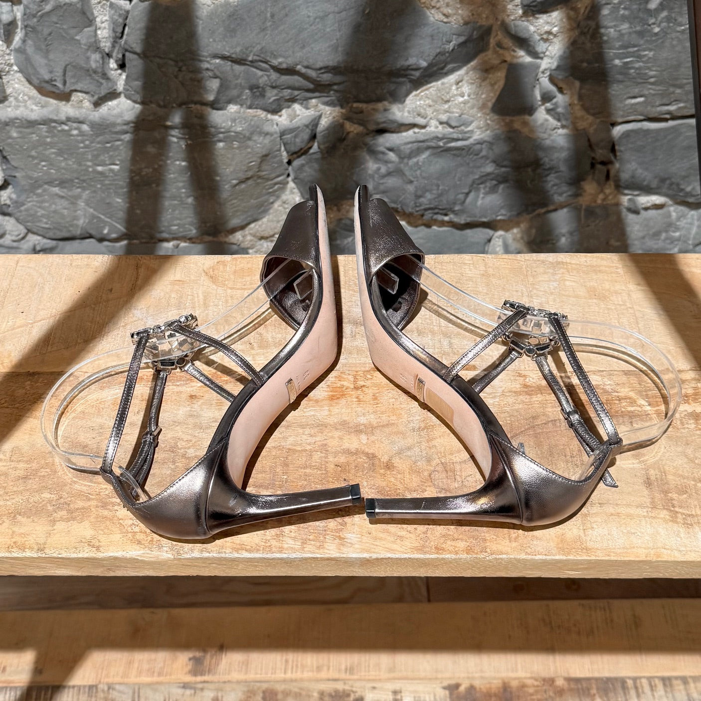 CONDITION: Pre-owned, in good condition. Visible wear, marks at leather outsoles consistent with moderate use. Light creasing and surface marks on metallic leather. Minor friction marks on straps. Visible marks on heels. Crystals are intact - none missing and no imperfections. Please refer to the pictures and measurements. Feel free to inquire for additional information prior to purchase.