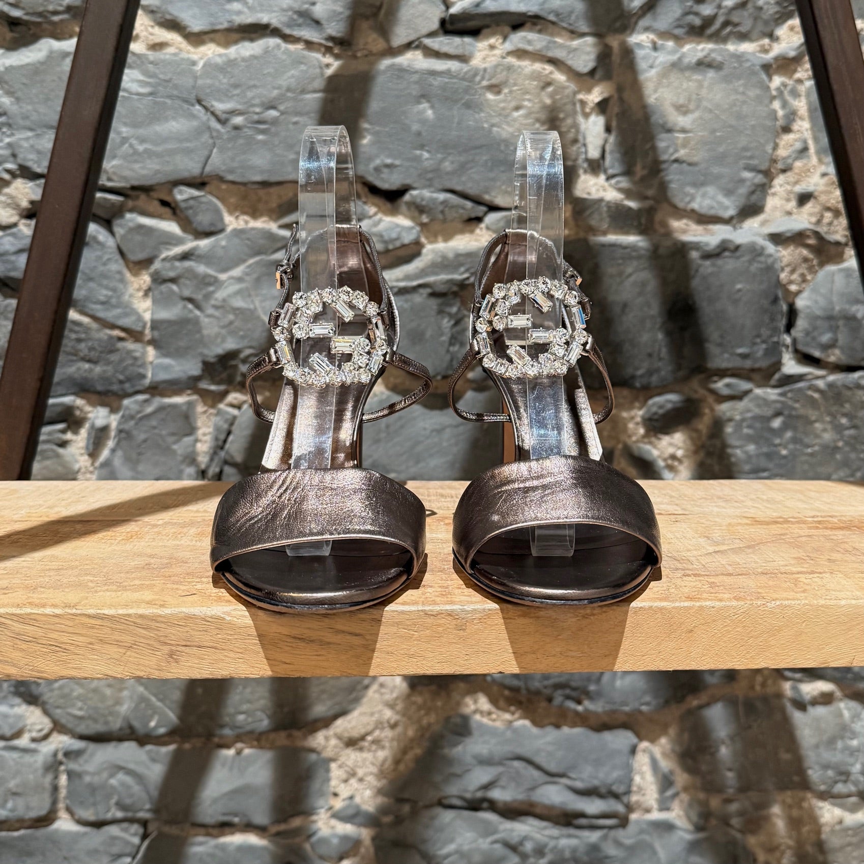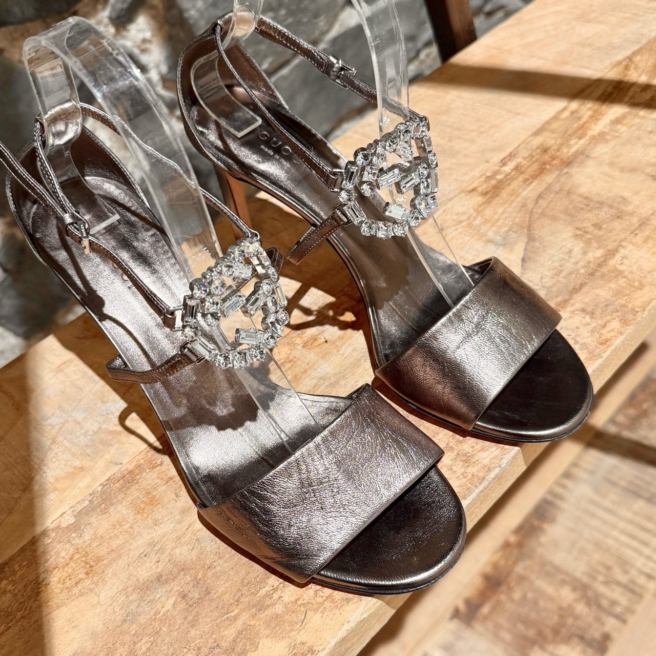 Open-toe metallic pewter leather sandal with slim stiletto heel. Wide front strap. Slim ankle straps with adjustable silver-tone branded buckle. Crystal interlocking GG detail at front. Metallic leather insole. Nude leather outsole with Gucci metal plaque. Made in Italy. Come with Gucci dustbag.