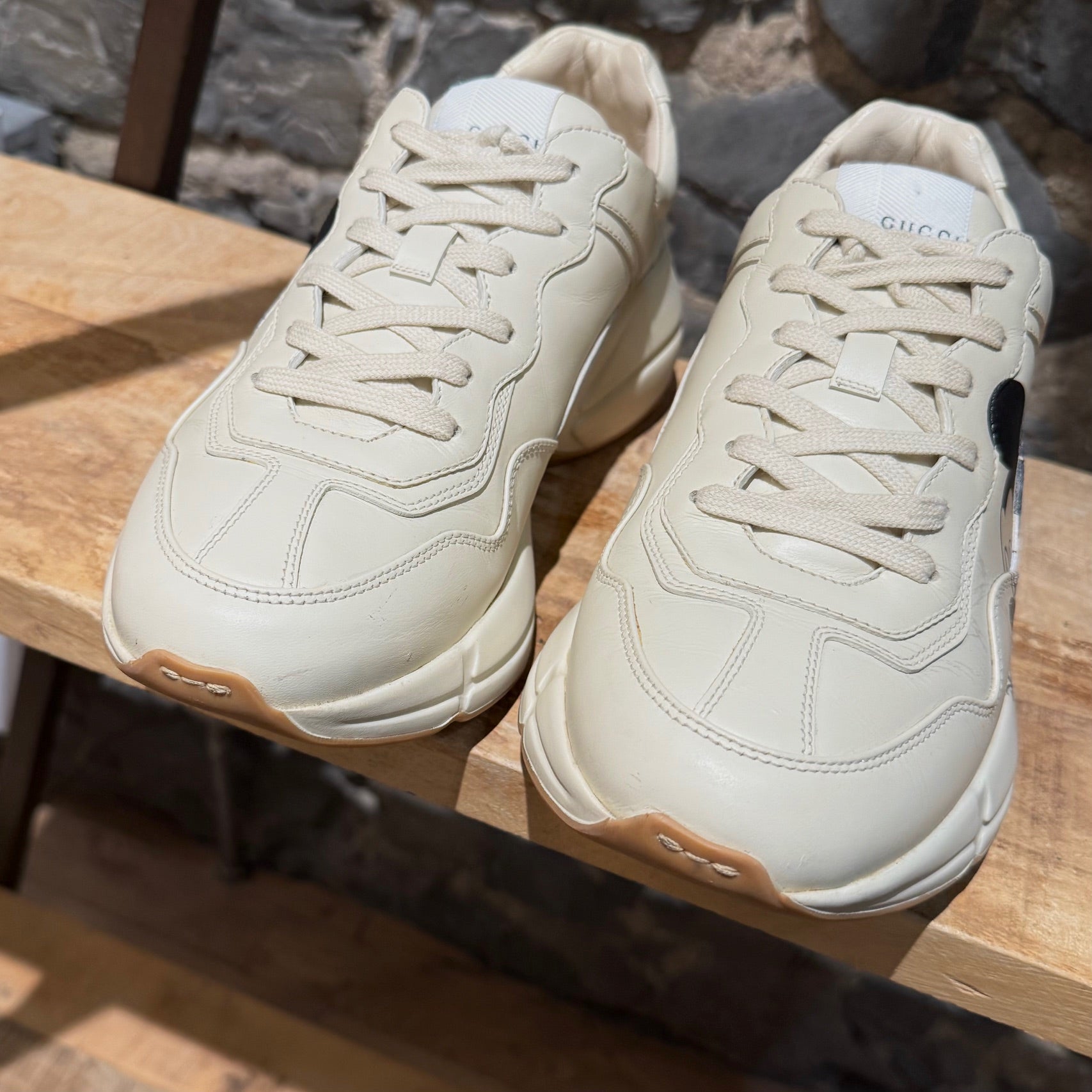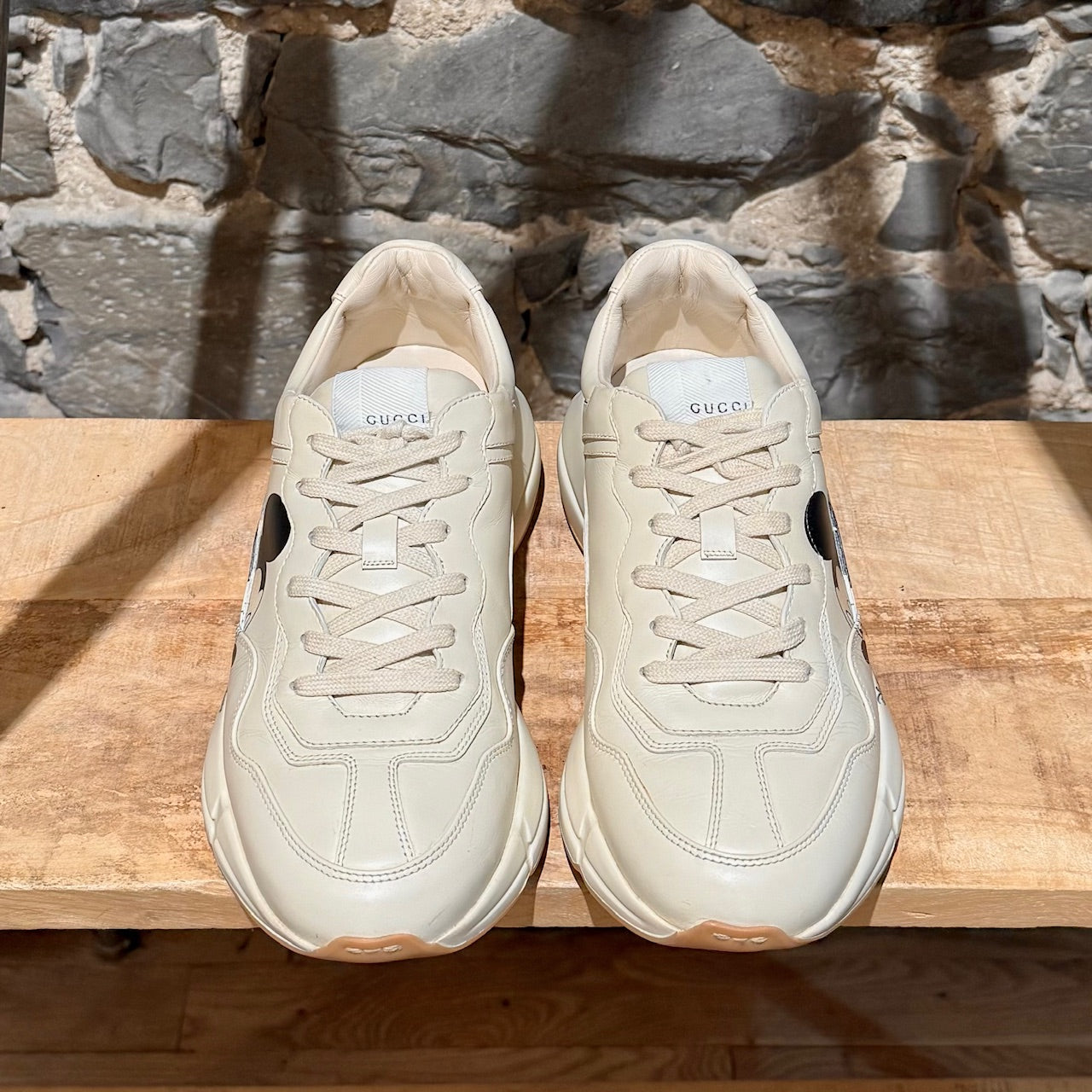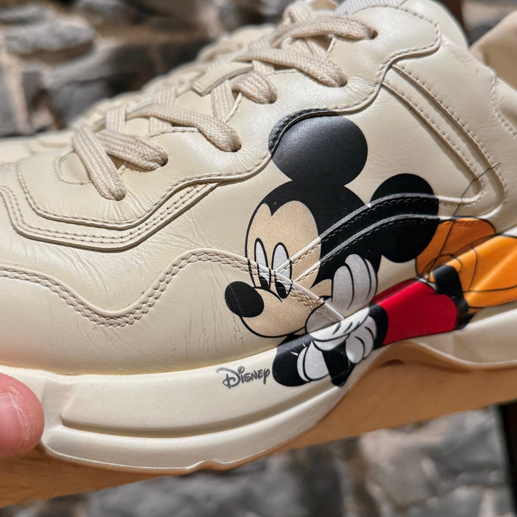 Gucci X Disney collaboration. Low-top silhouette. Oversized chunky sneakers. Ivory leather upper with Mickey Mouse print on the exterior side. Padded collar. Round toe. Ivory Lace-up closure. Gucci logo at tongue and back heel. Rubber sole in ivory and light gum tone. Leather insoles. Made in Italy. Come with original Disney x Gucci green box with Mickey motif, and two (2) red dustbags.