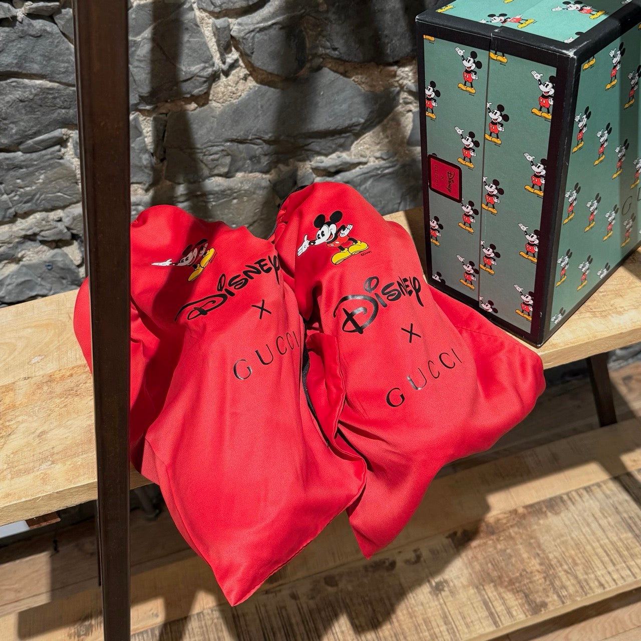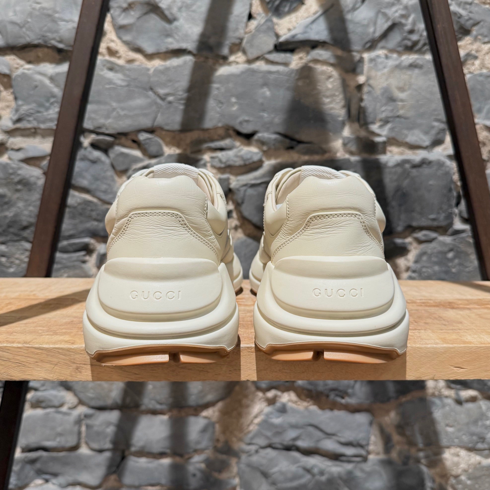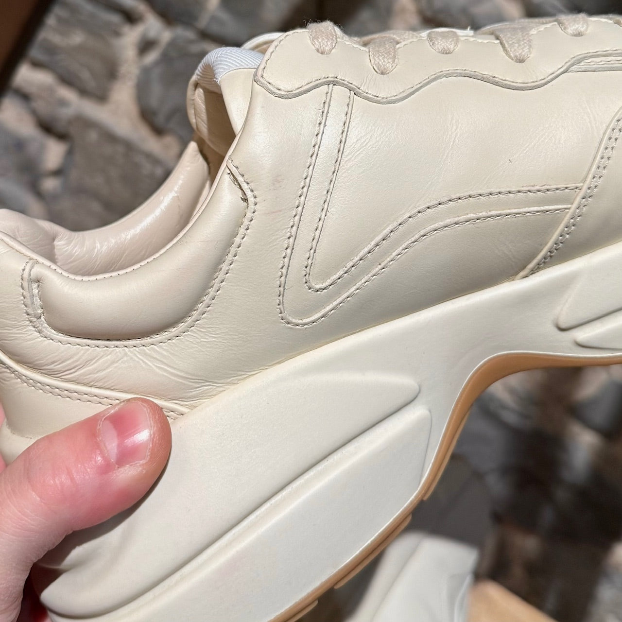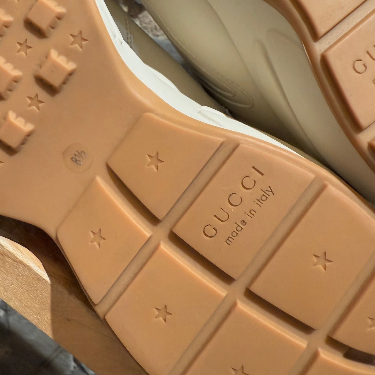 Gucci X Disney collaboration. Low-top silhouette. Oversized chunky sneakers. Ivory leather upper with Mickey Mouse print on the exterior side. Padded collar. Round toe. Ivory Lace-up closure. Gucci logo at tongue and back heel. Rubber sole in ivory and light gum tone. Leather insoles. Made in Italy. Come with original Disney x Gucci green box with Mickey motif, and two (2) red dustbags.