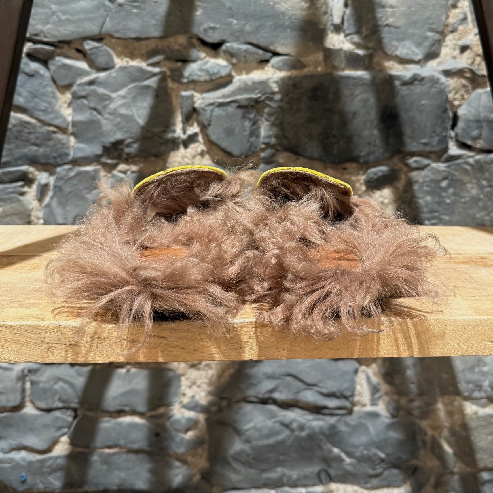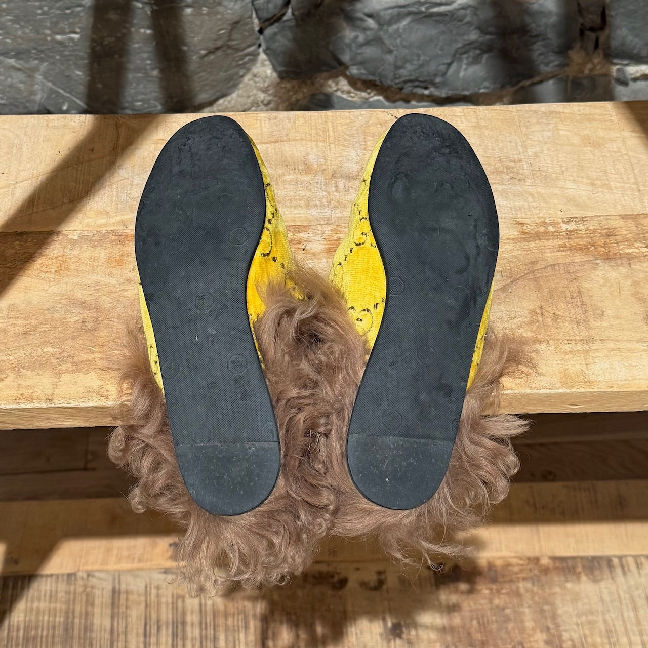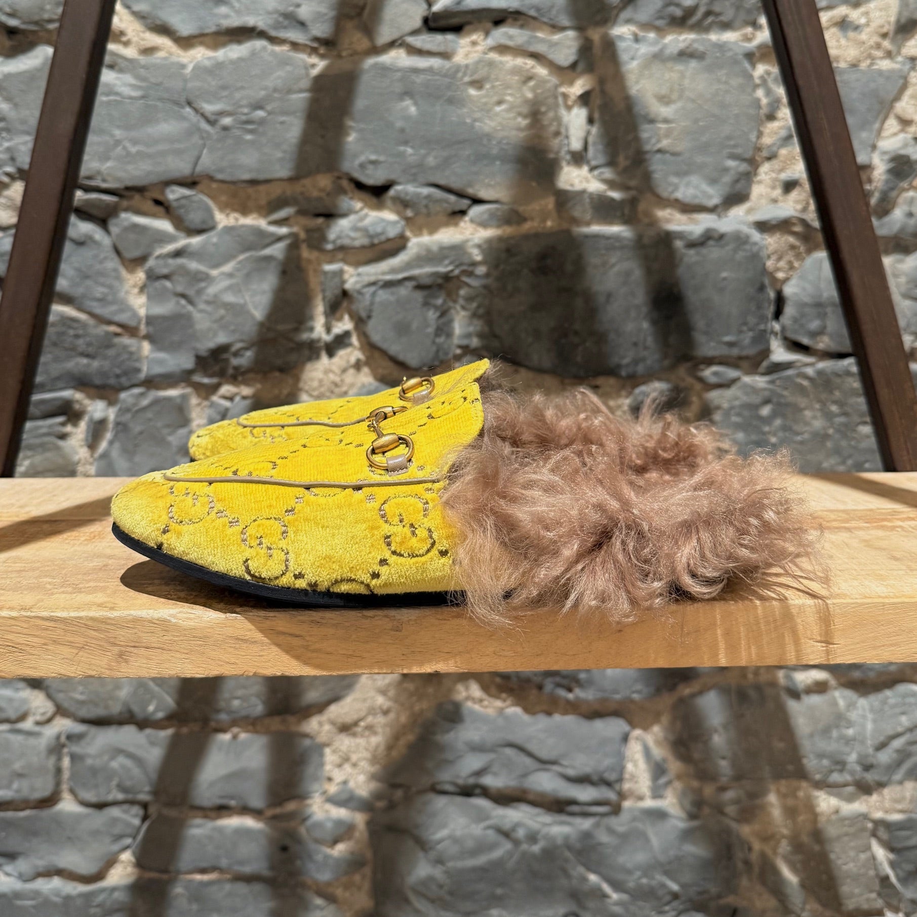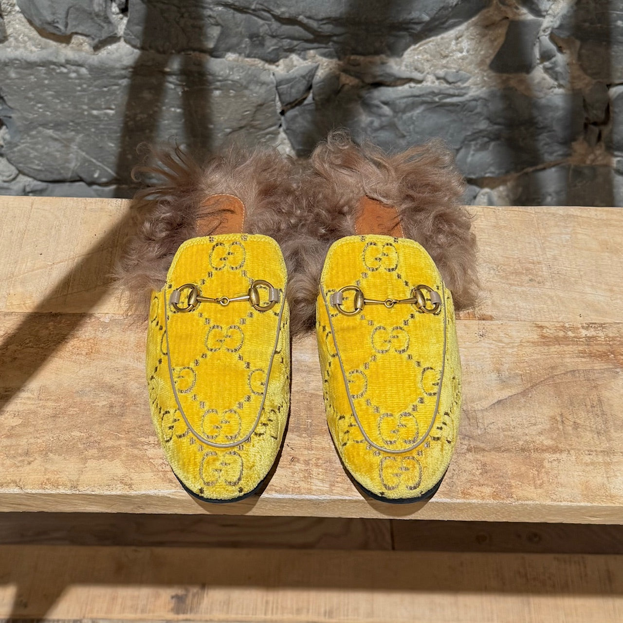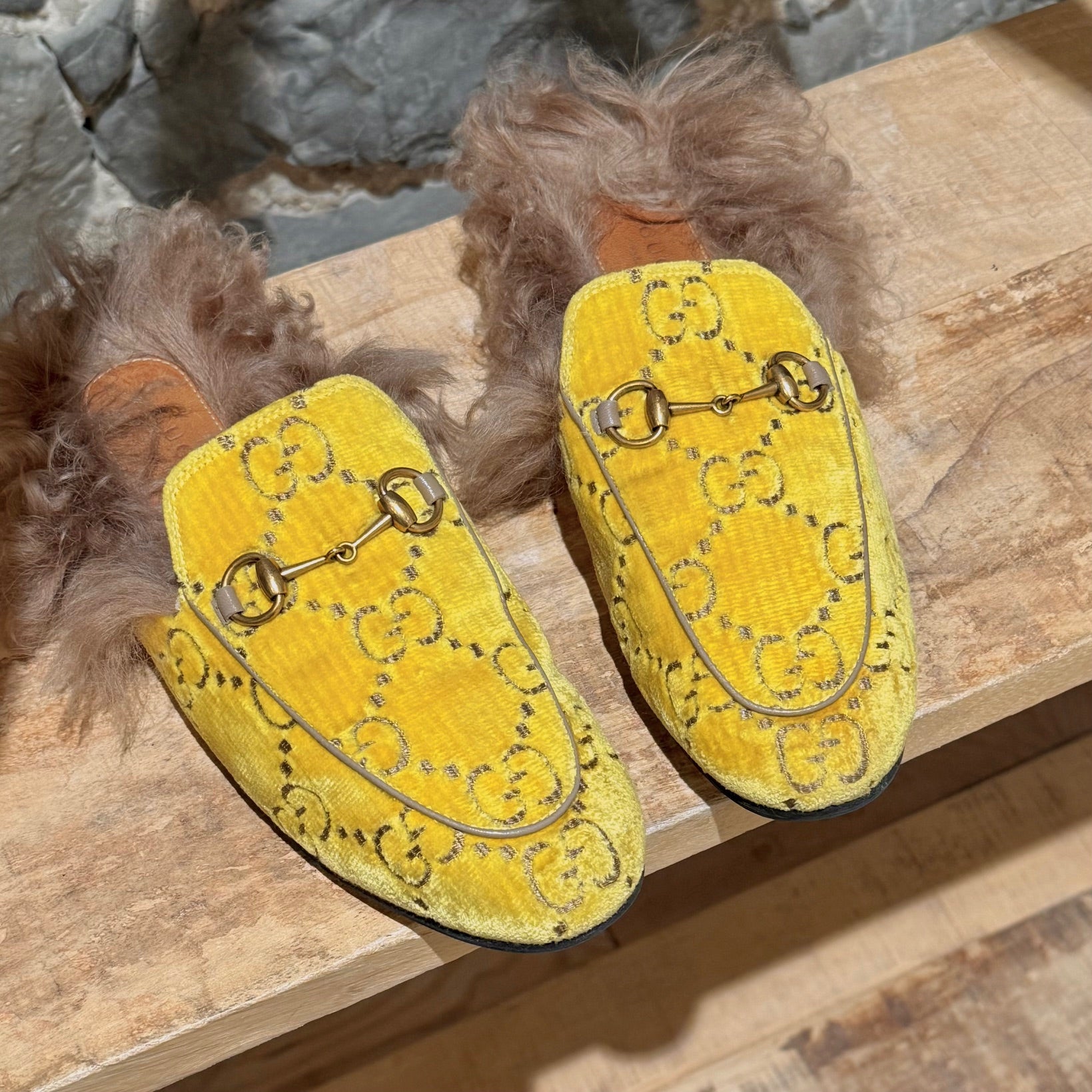Yellow velvet GG monogram upper. Slip-on mule design. Almond toe. Gold-tone horsebit at the vamp. Flat sole. Brown lamb wool-lined interior - not genuine fur. Brown leather insole. Made in Italy. Come as is.